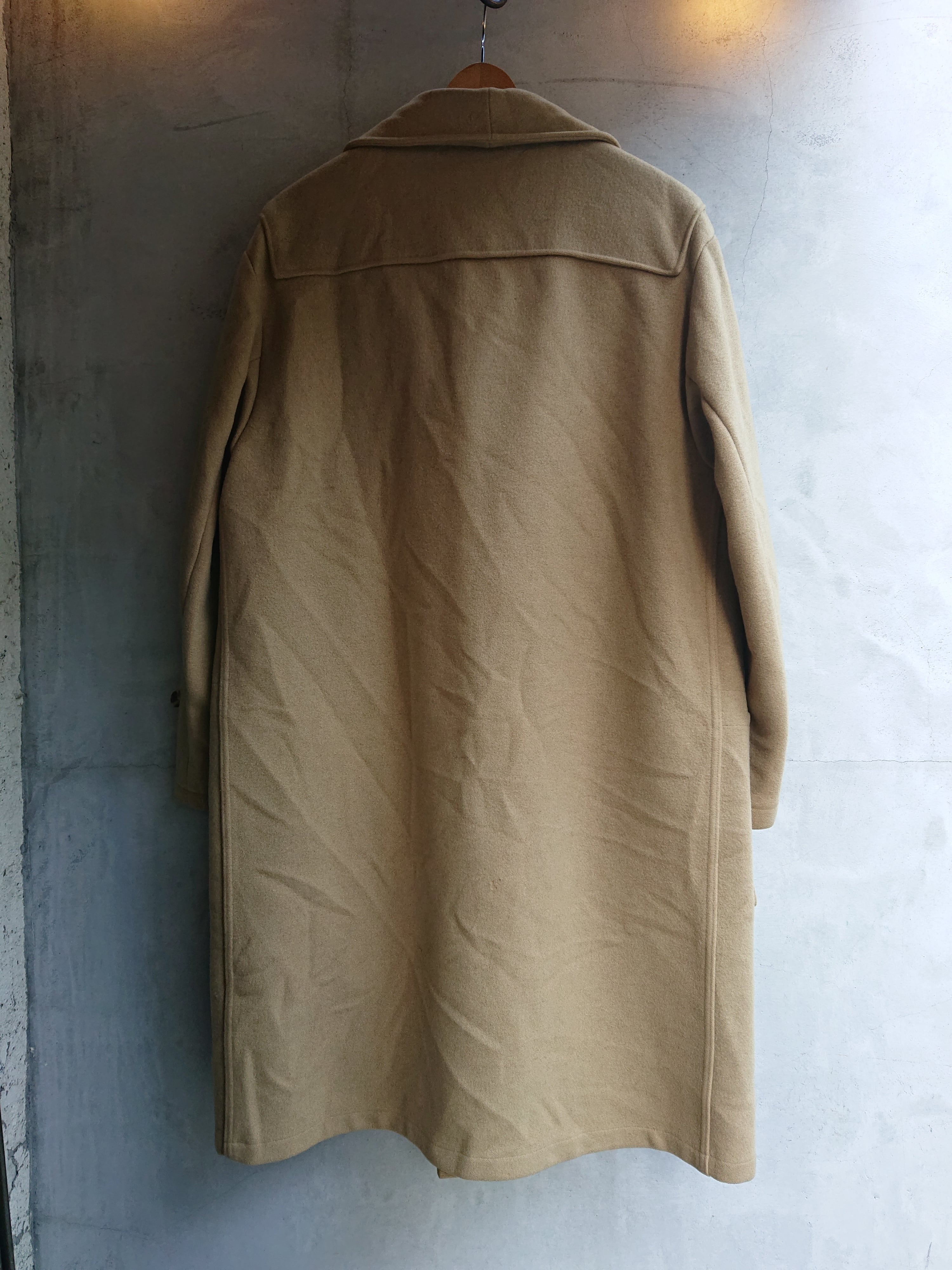 今回紹介するのはフード無しのモデルで首もとには長いチンストラップがつき、CONVOYのダッフルコートの特徴の1つとも言えます。フロントに4つのウッドトグルによるホールドディティール。通常の肉厚なメルトンに比べ軽く、着用した時のずっしりとした重たさは少ない分、着やすいと思います。多少擦れはありますがそれもこのジャケットがもつ雰囲気です。サイズ合う方いかがでしょうか。