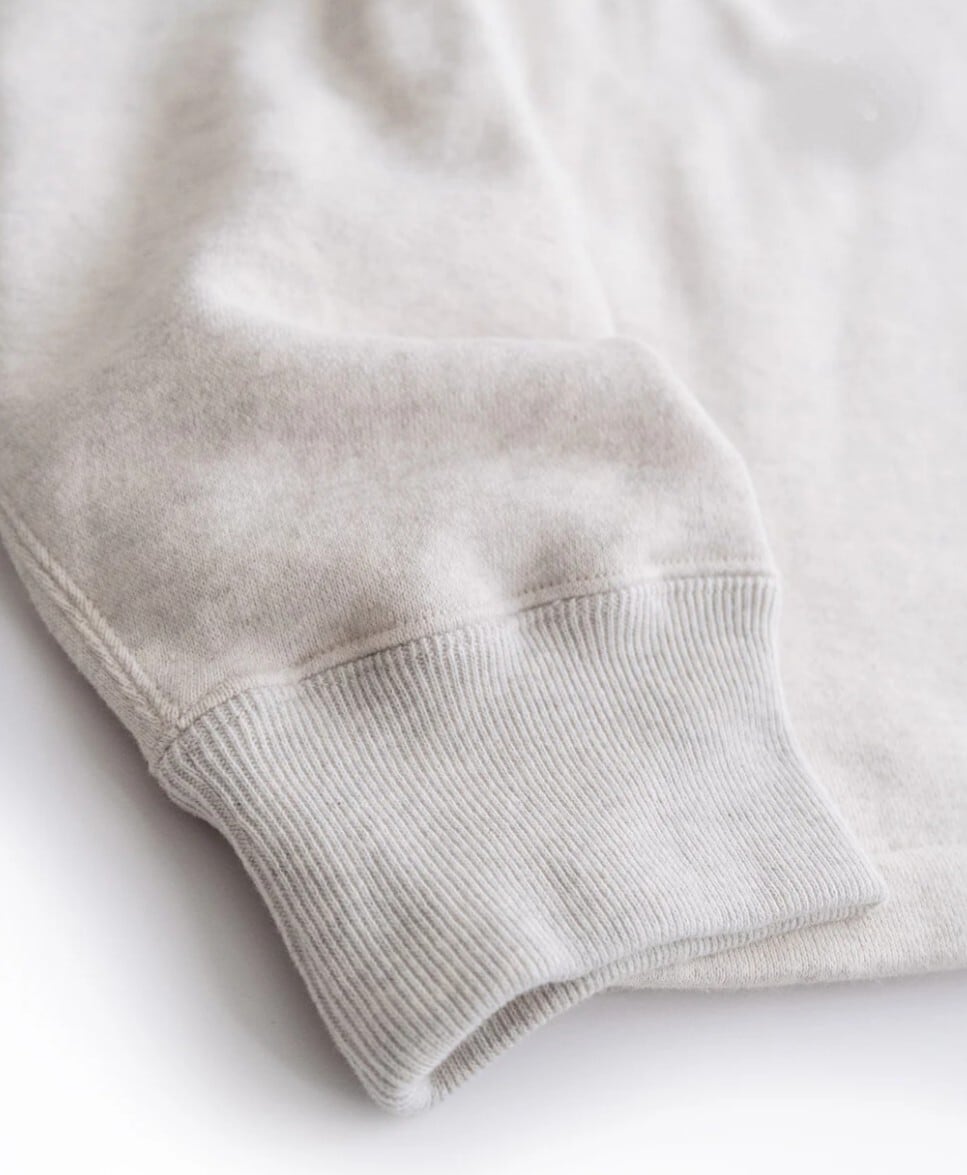 シンプルなアイテムだからこそ、 縫製仕様にはこだわりました。バインダーネックはハーフバイアスで仕上げ、裾は天地始末を採用し、ヴィンテージスウェットの要素を詰め込んでいます。
