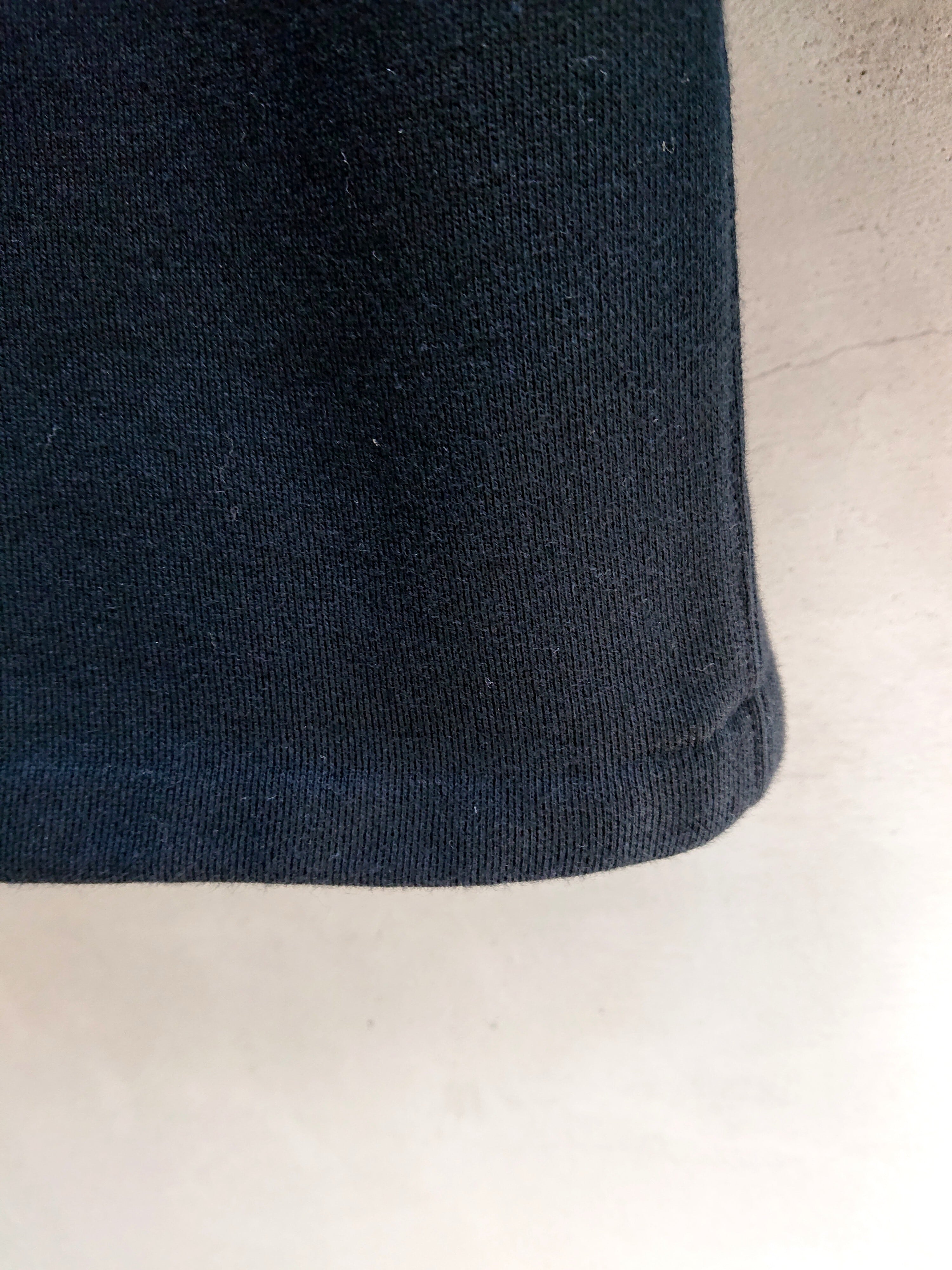 シンプルなアイテムだからこそ、 縫製仕様にはこだわりました。バインダーネックはハーフバイアスで仕上げ、裾は天地始末を採用し、ヴィンテージスウェットの要素を詰め込んでいます。