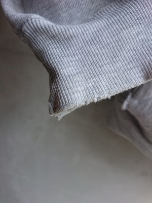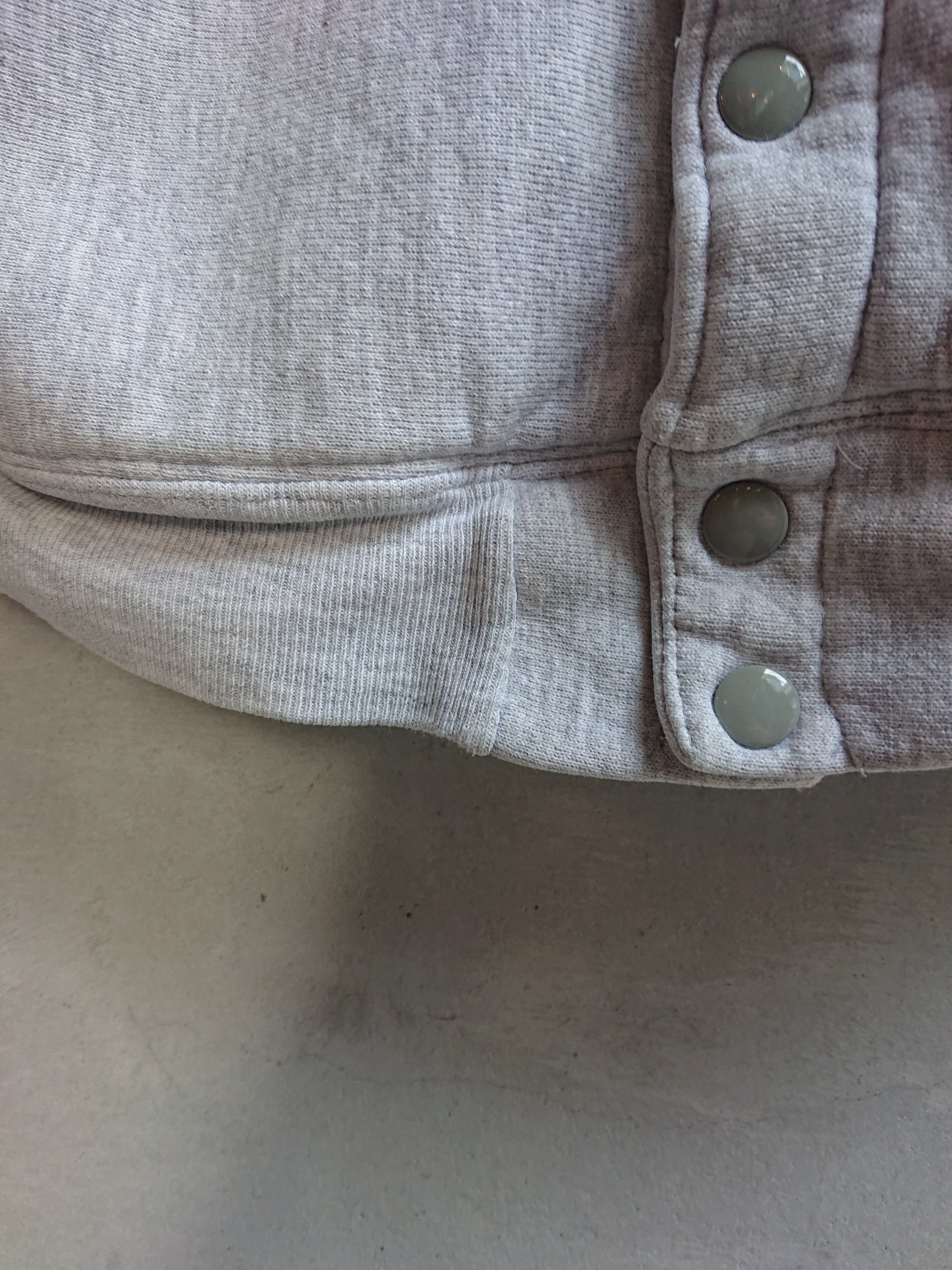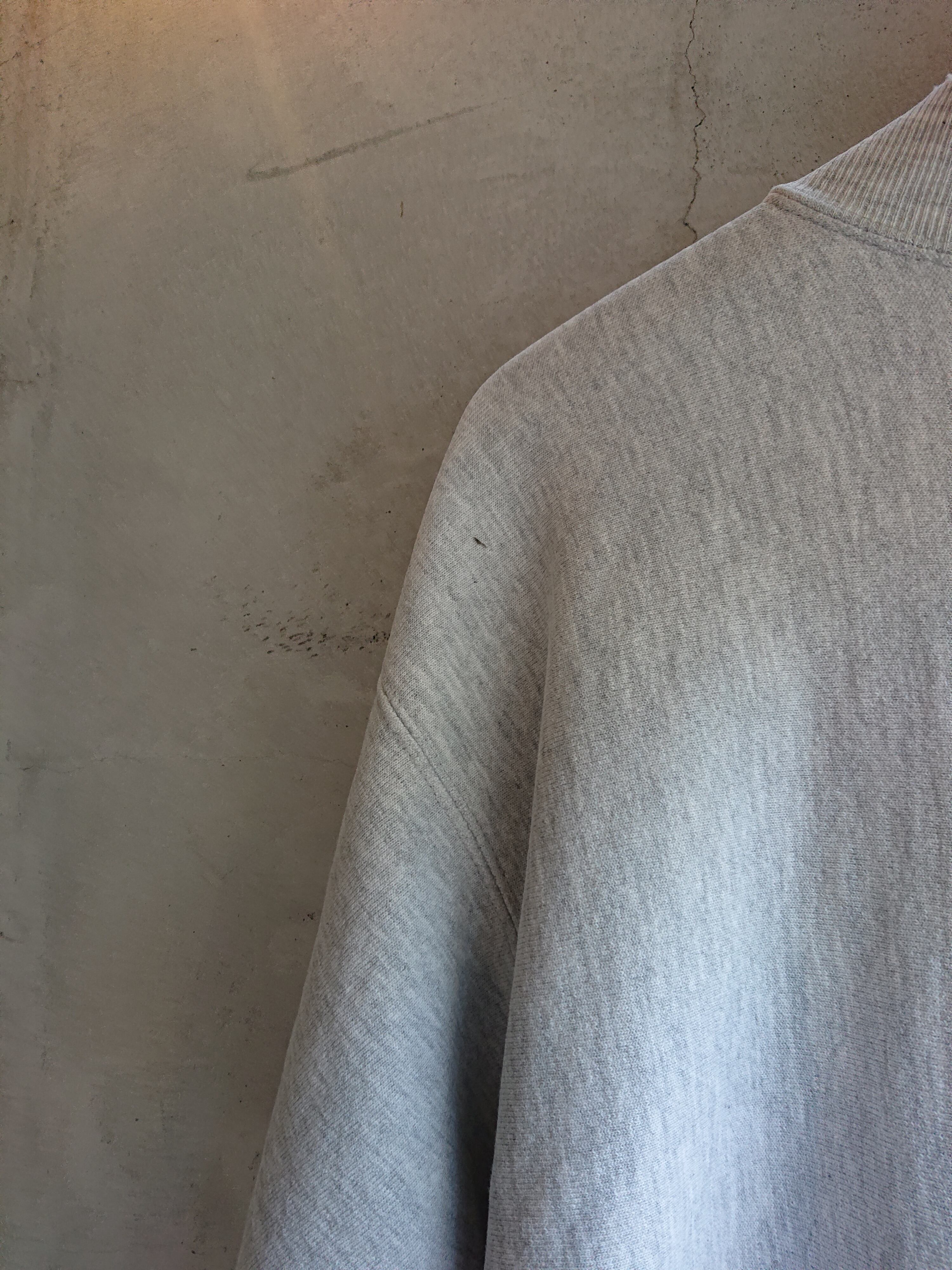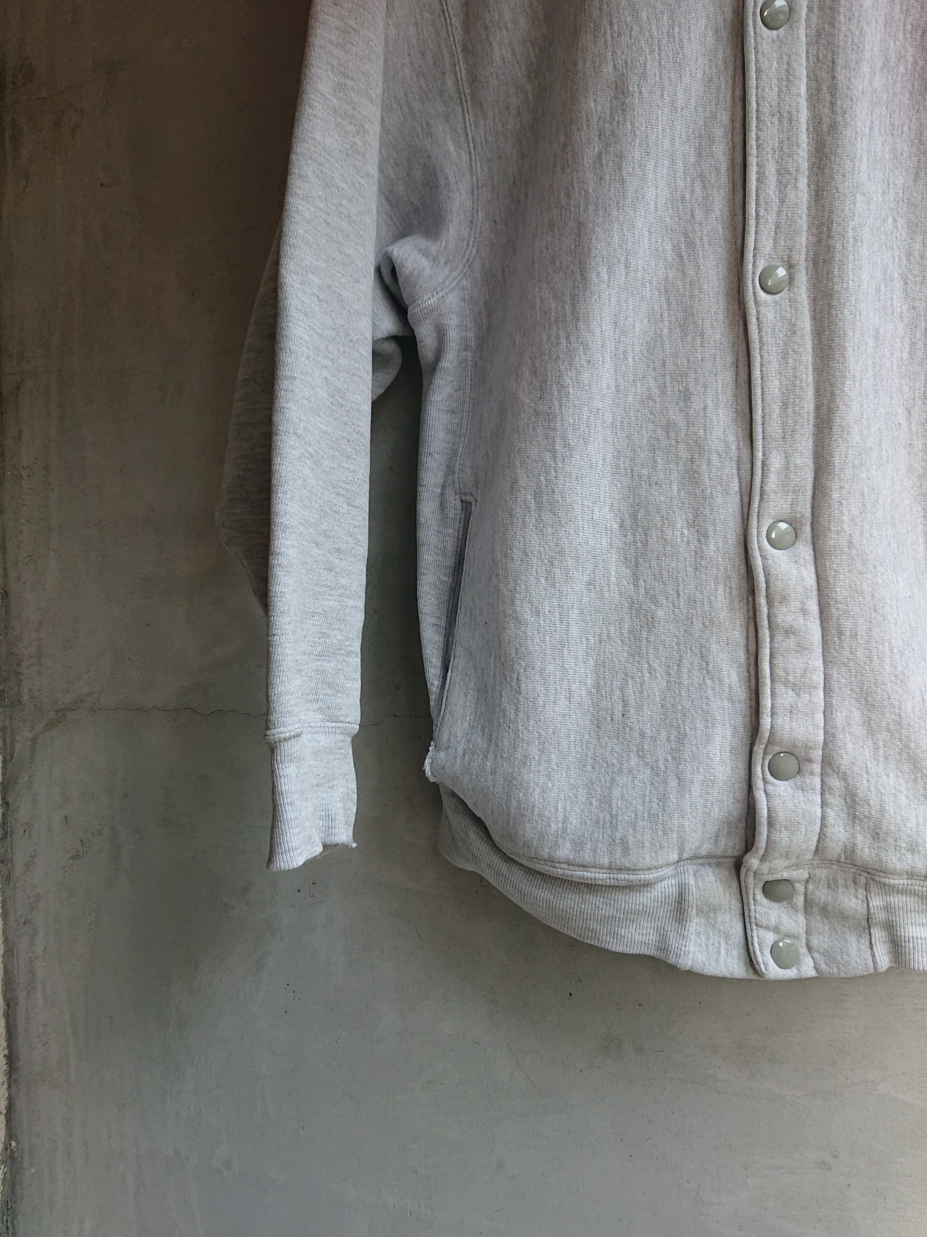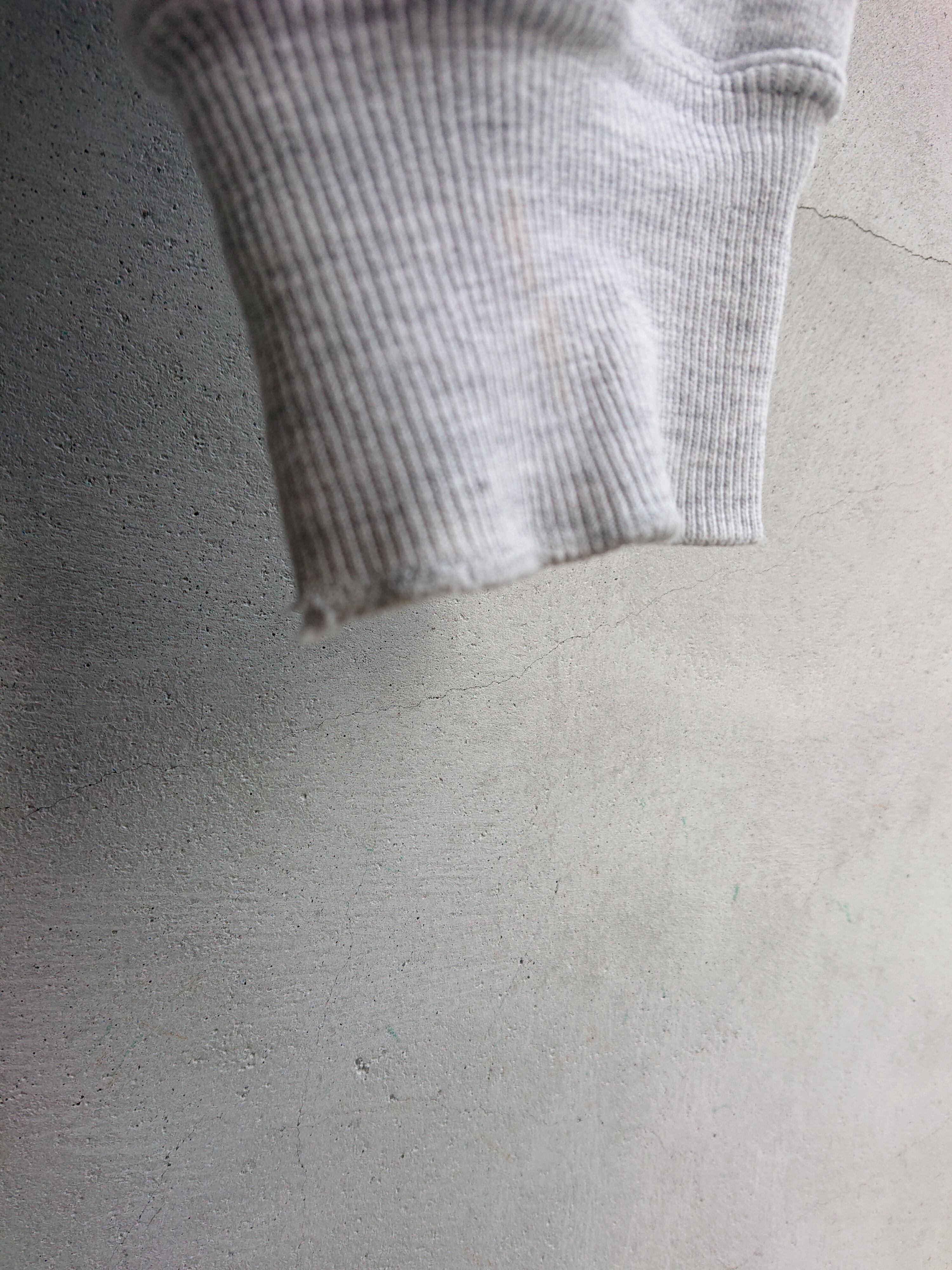 1990年代 USA製 CHAMPION REVERSE WEAVEのスナップカーディガンになります。スウェットですがスタジャンみたくジャケット感覚で着る方もいてます。被りのリバースと比べ、フロントがスナップなので脱ぎ着しやすく暑がりの人には意外と重宝します。カラーは安定のグレー。アメカジスタイルに欠かせないと言ってもいいCHAMPION REVERSE WEAVE。直球の合わせも良いですが90年代流行ったスタイルみたく、ボリュームあるトップスにタイトシルエットのボトムで合わせた逆Aラインスタイルは今でも格好良いと思います。首と袖リブに擦れやダメージがありますが、その他致命的な傷等はなく着用に問題はありません。
