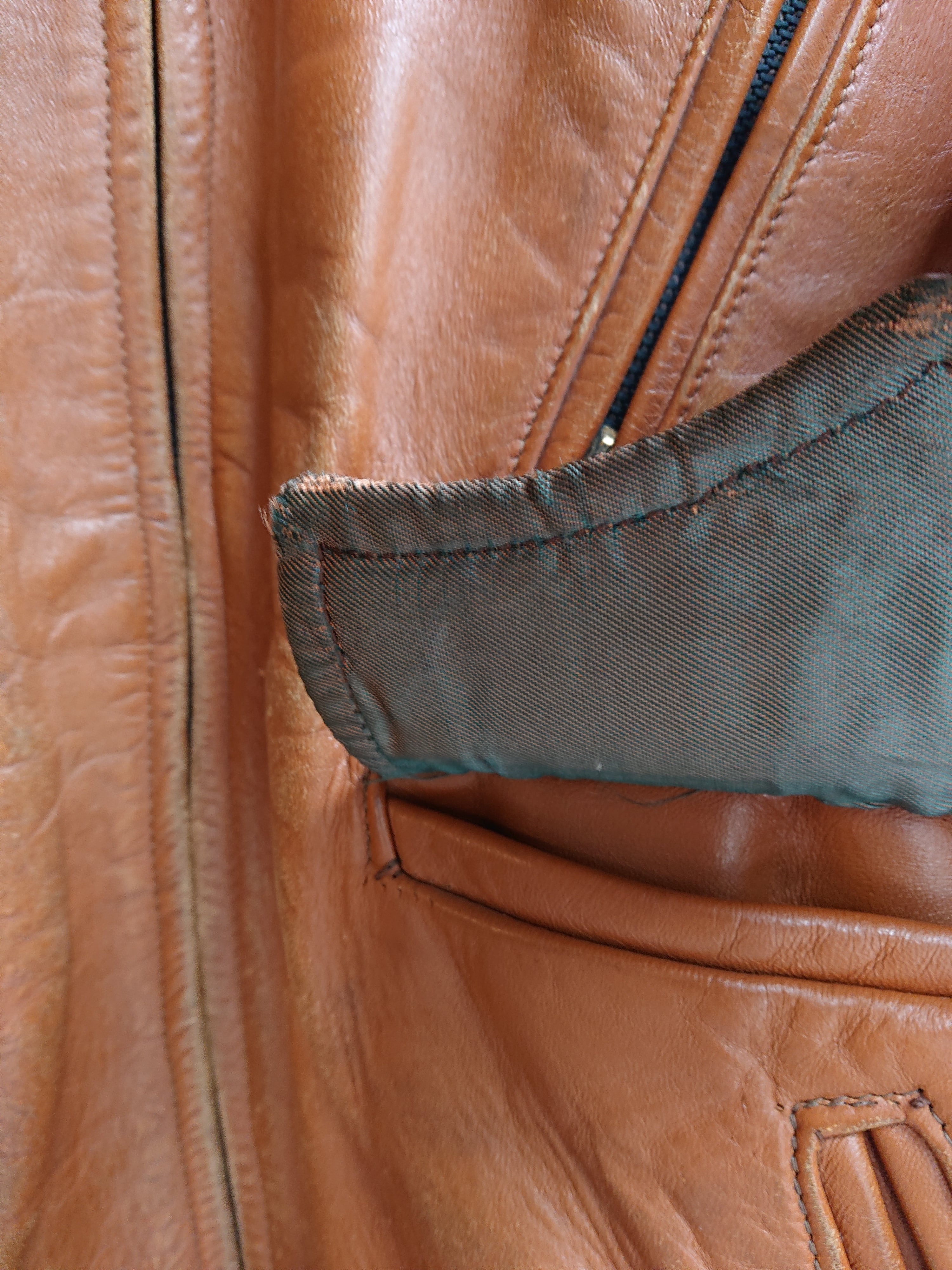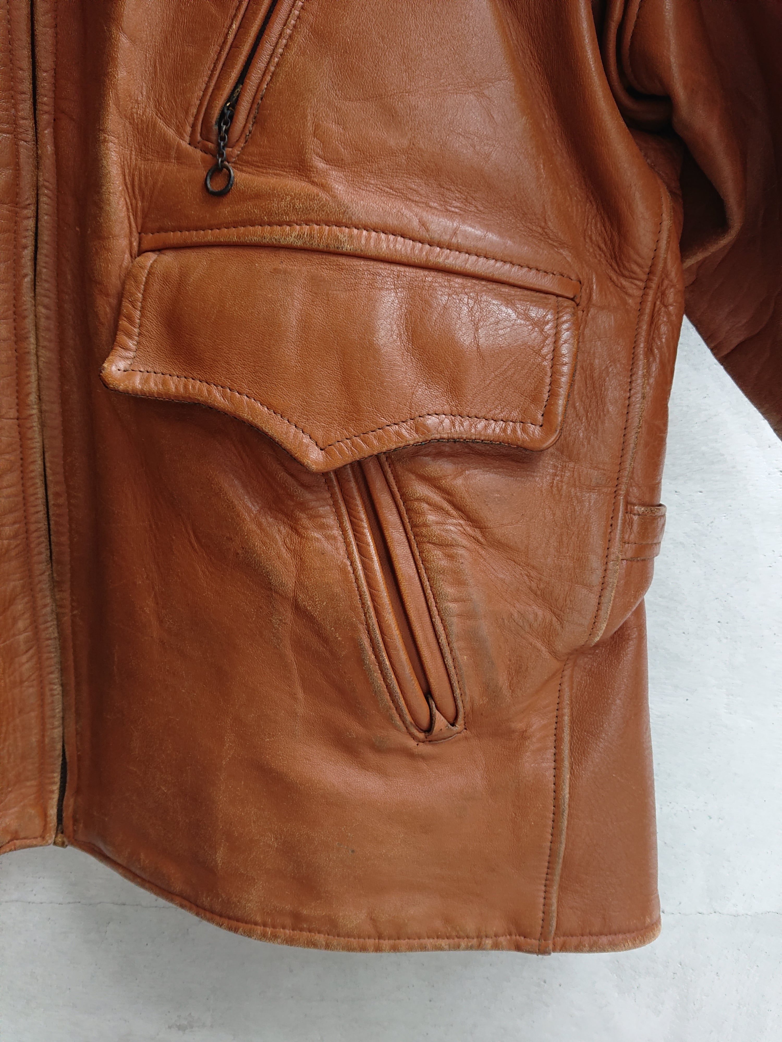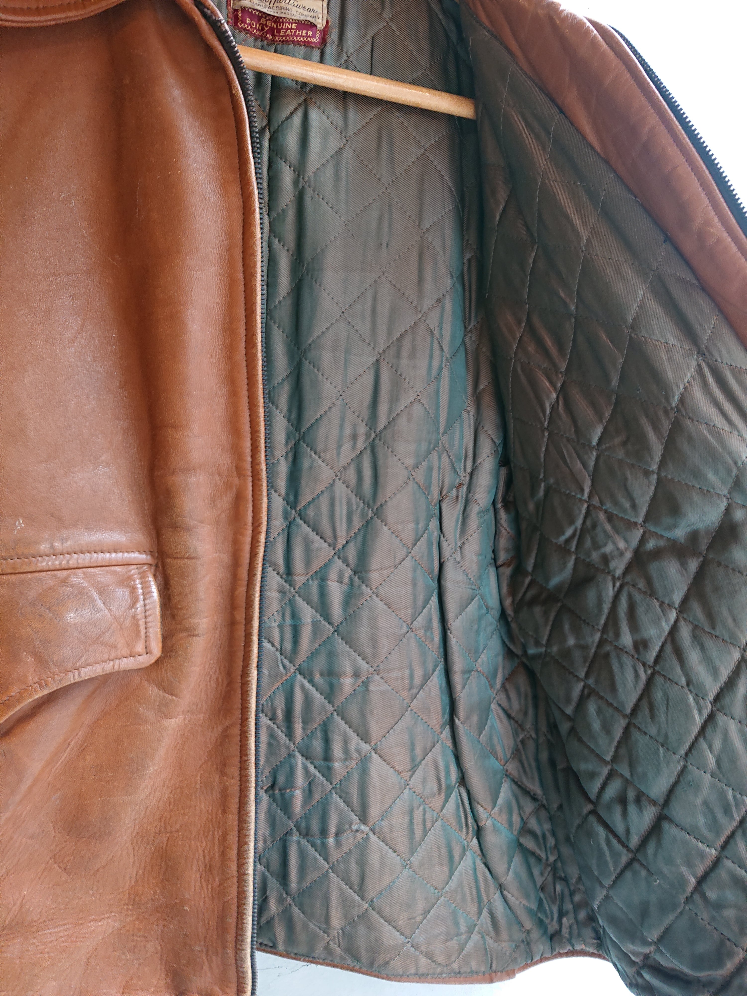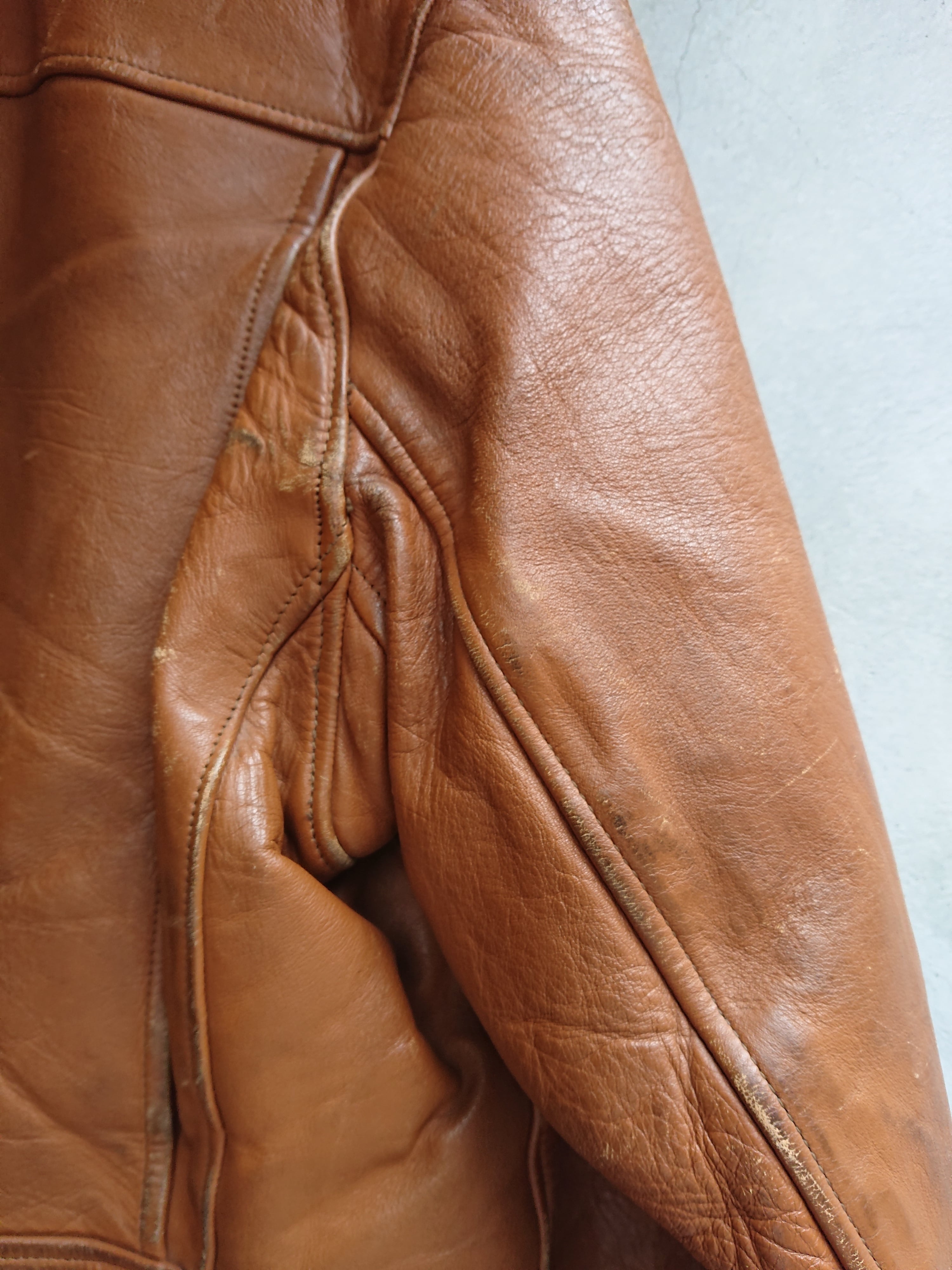 1940年代 KURLAND LEATHER JACKETになります。胸にジッパーポケットがつき、裾にはフラップ付き2重構造のポケットとこの年代のレザースポーツジャケットに見られるルックスは飽きのこないデザイン。内側はキルティング仕様で防寒性あり。アメリカ海軍 G-1のレザージャケットを手掛けてたブランドとしても有名なStar Sportswear Mfg Coが製造。それだけでもこのジャケットの魅力がプラス。レザーはポニーハイド。内側のキルティングの一部にダメージ、レザーに擦れもありますがその他致命的な傷等なく着用に全く問題はありません。