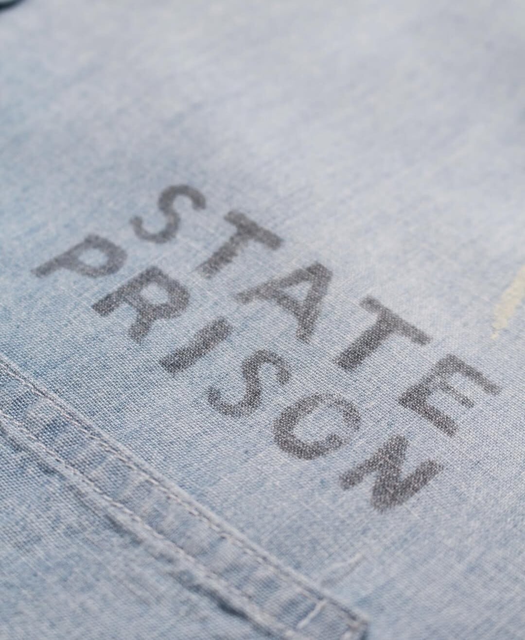 1960年代、アメリカの刑務所で着用されていたプリズナーシャンブレーシャツ。PROPERTY OF STATE PRISONプリントにより別格のオーラを放つ。 本来、刑務所内で使用されたものが外に出ることはなく、その希少性からヴィンテージ市場でも高い人気を誇ります。本作は、当時の雰囲気やディテールを忠実に再現しつつ、BOW WOW特有のやや大きめなシルエット、加工表現に仕上げました。
