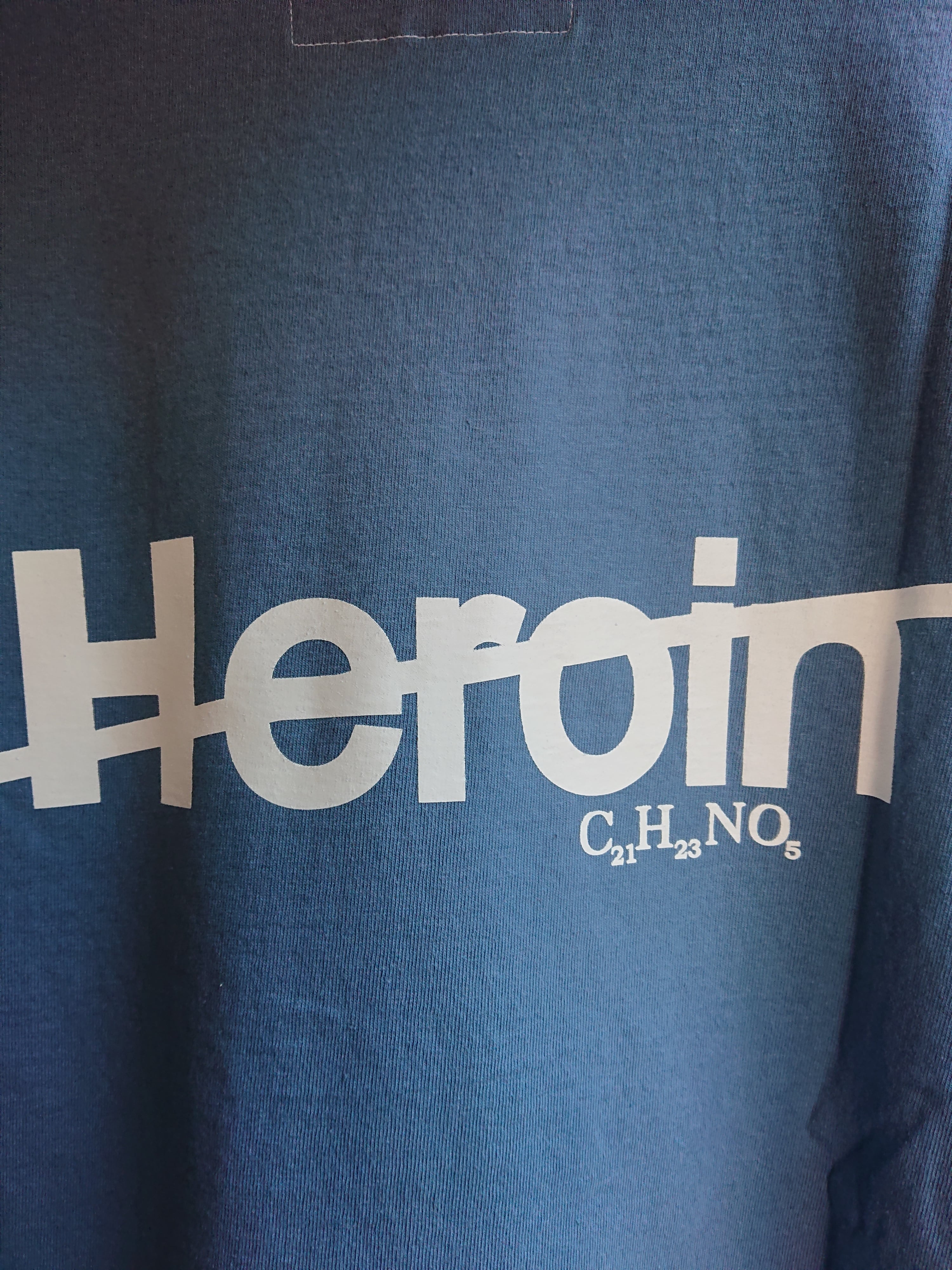 プロデュース )の中に入っているヘロインという楽曲から。ヒーロー、ヘロイン、ヒロインの相反する意味?文字を3段に並べてプリントしています。ヒーロー、ヒロインは正義を表して相反する意味?の薬物ヘロインを真ん中に斜線で消した状態。ヘロインに関しては元素記号も洒落でプリントをしています。更にヘロインとヒロインに関しては最後のeがあるかないか?だけの違いである事も面白い。着眼、デザインはまさにSick and Tiredらしさが凝縮されてます。