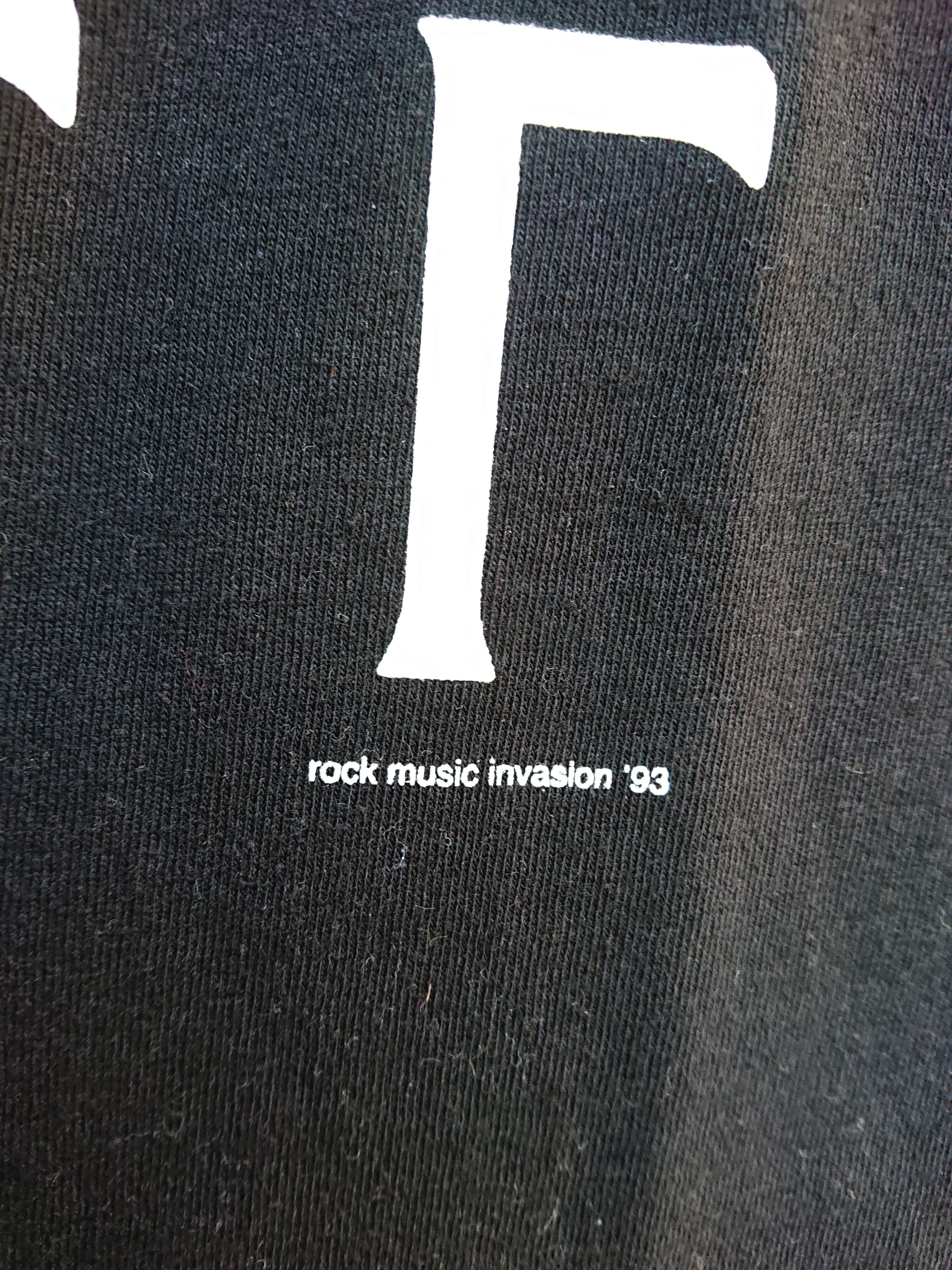 両面プリントで、プリントデザインは古着にありそうで無い感じ。クルーネックのベーシックなデザイン。衿ぐりはフライス接ぎ仕様(ロック接ぎ)。肩線、アームホール、脇接ぎは全てロック接ぎ仕様で袖口、裾上げはシングルステッチ。
