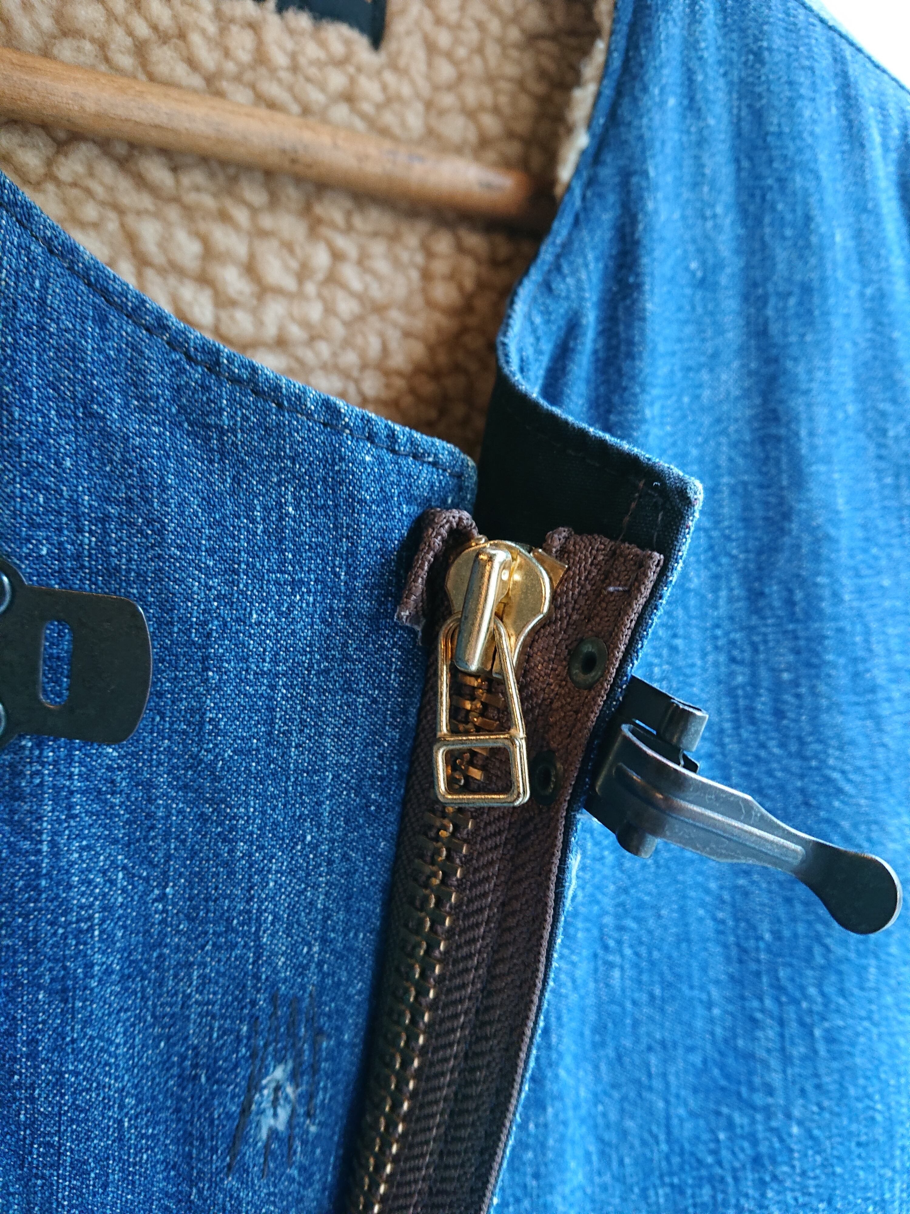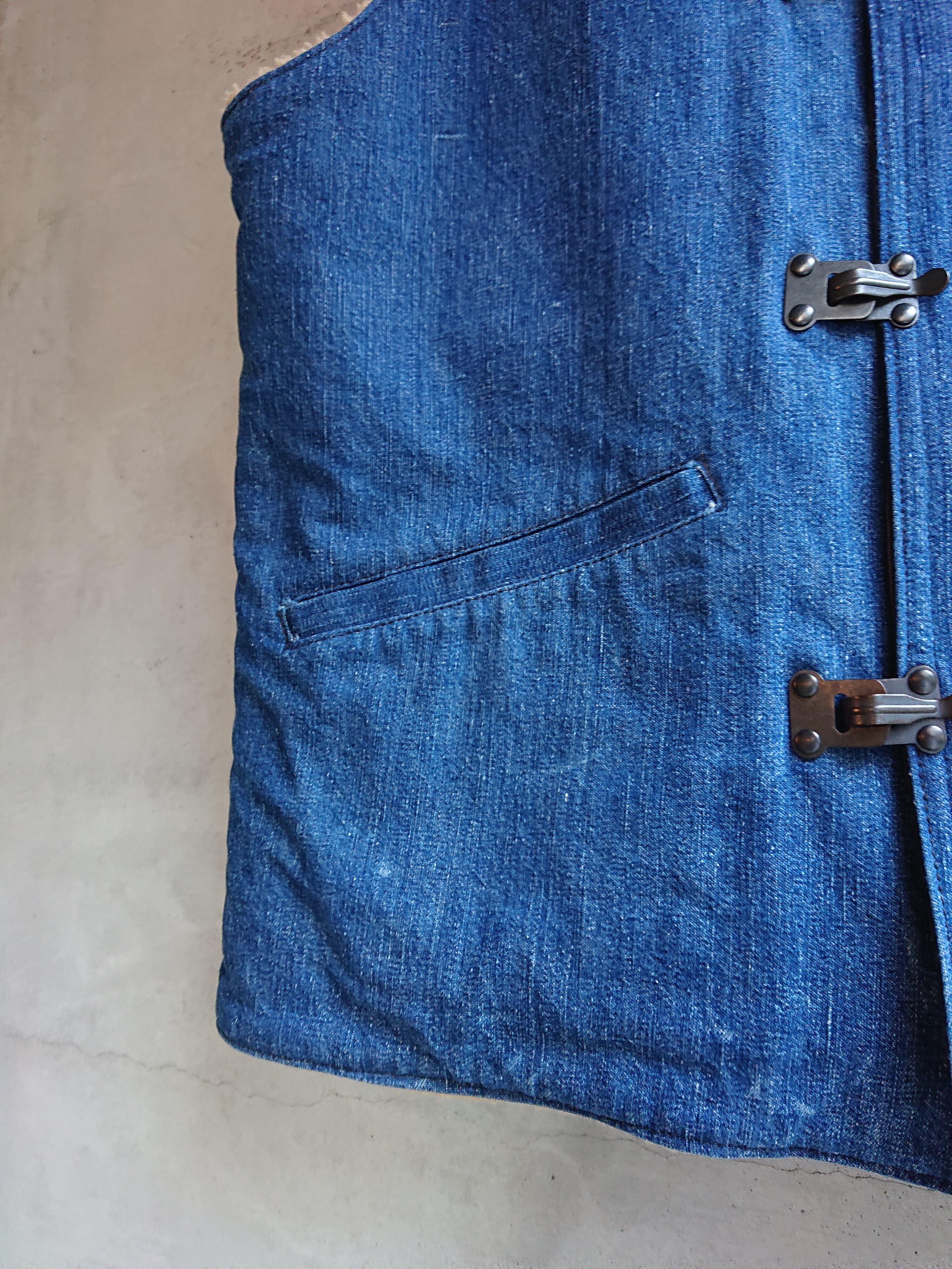 ヴィンテージで実在するフックのボアベストをモディファイしたベストで、今回紹介するのは先日紹介した1stモデルの後にアップデートした2ndモデルのサンプル。10号サイズのブラスジッパーを特殊な仕様でウインドプルーフに仕立てに。フックを閉めた状態で隙間からの風を塞いでくれるので保温性もアップ。生地は今や貴重な1940年代 US NAVYデニムランドリーバッグを使用。デニムの濃さも残ってますので、経年変化も楽しんでいただけます。今こちらの資材で製作したら間違いなくこの金額での提供はできません。アウター、インナーにと活躍してくれるベスト。気になった方この機会に是非!