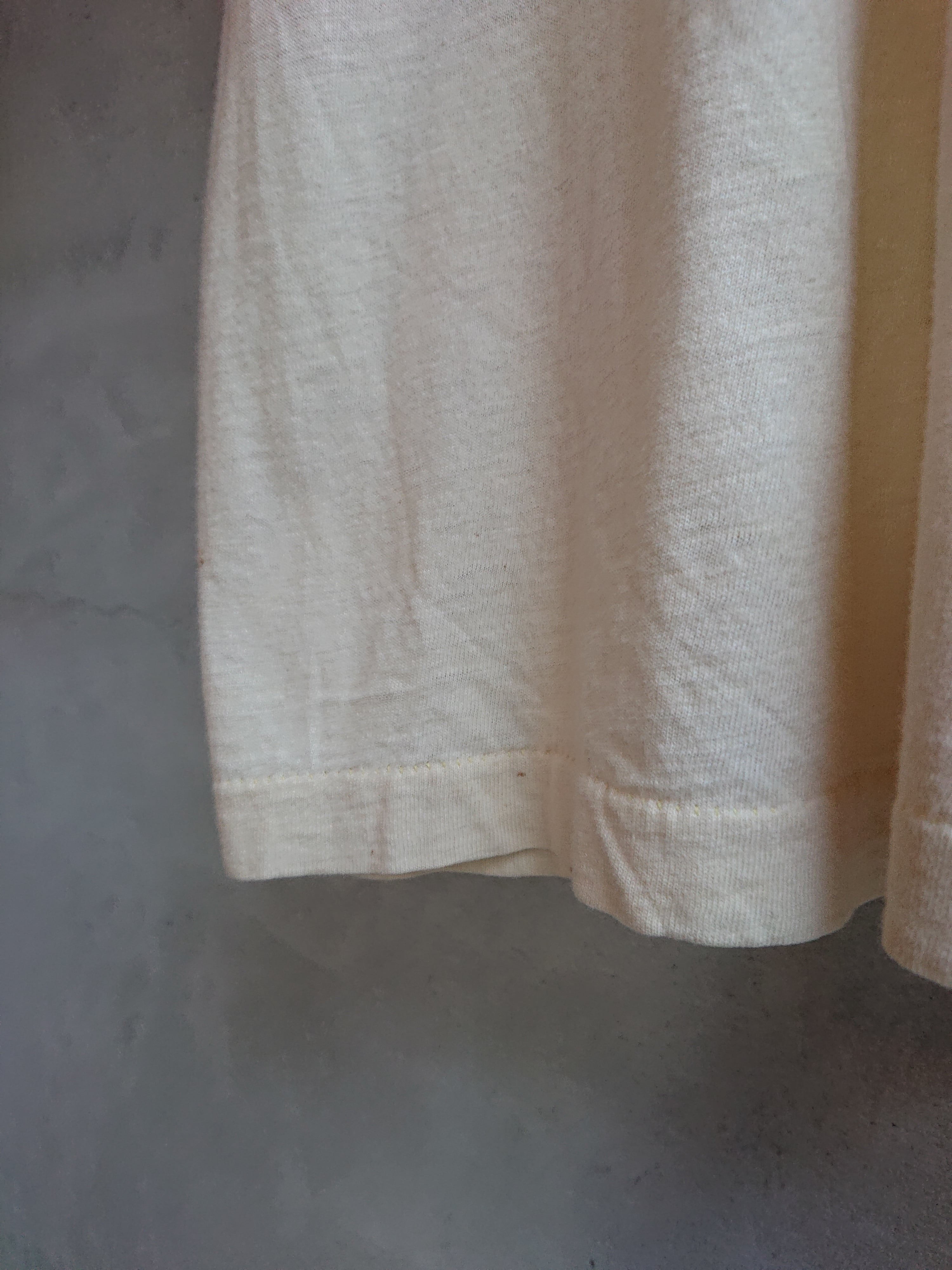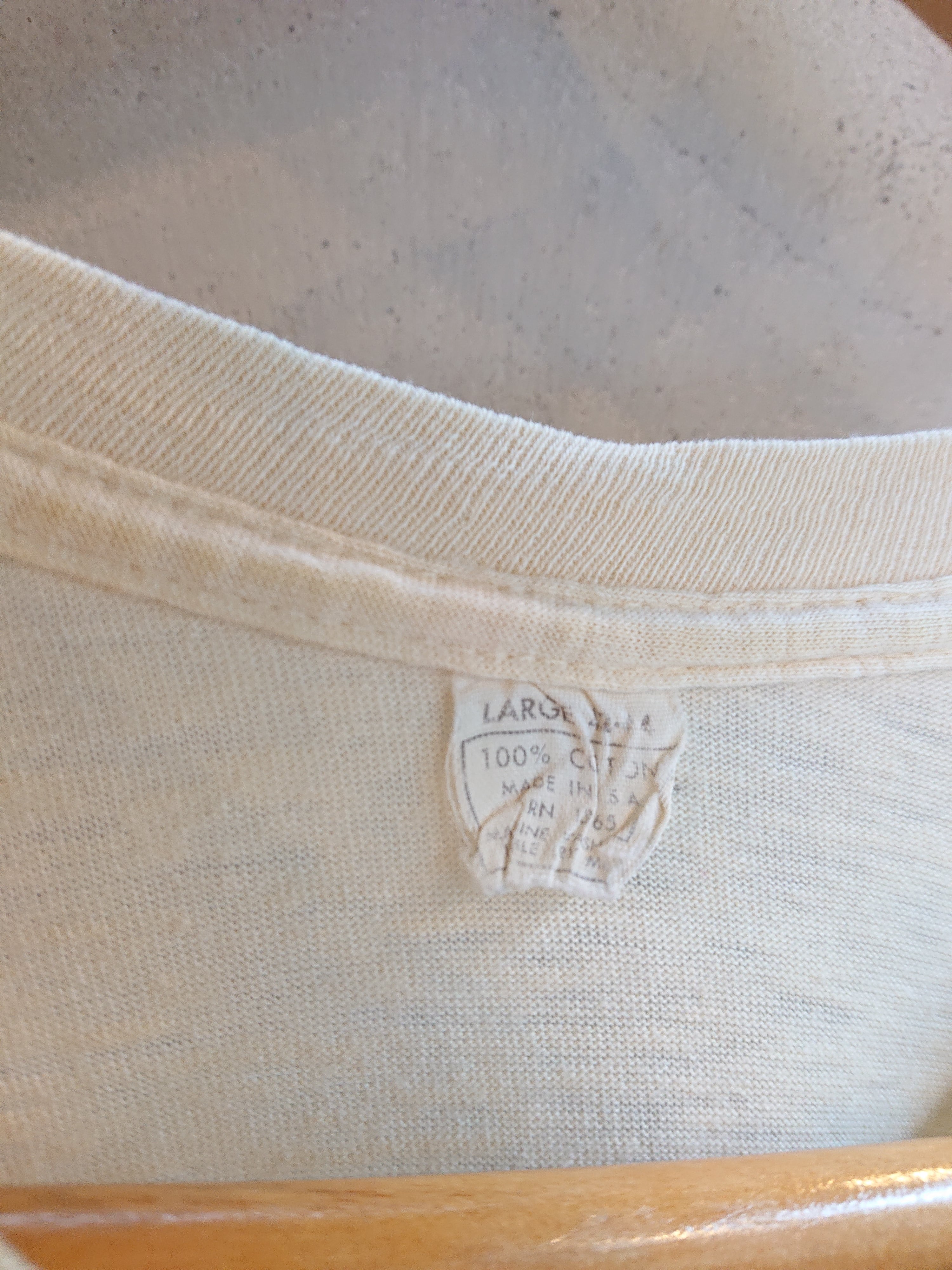 プリントのかすれ具合と、全体的に少しヤレたボディが、このTシャツの魅力を引き立てています。時を経た味わい深い雰囲気は、まさにヴィンテージならでは。多少の汚れがありますが、着用には問題はありません。