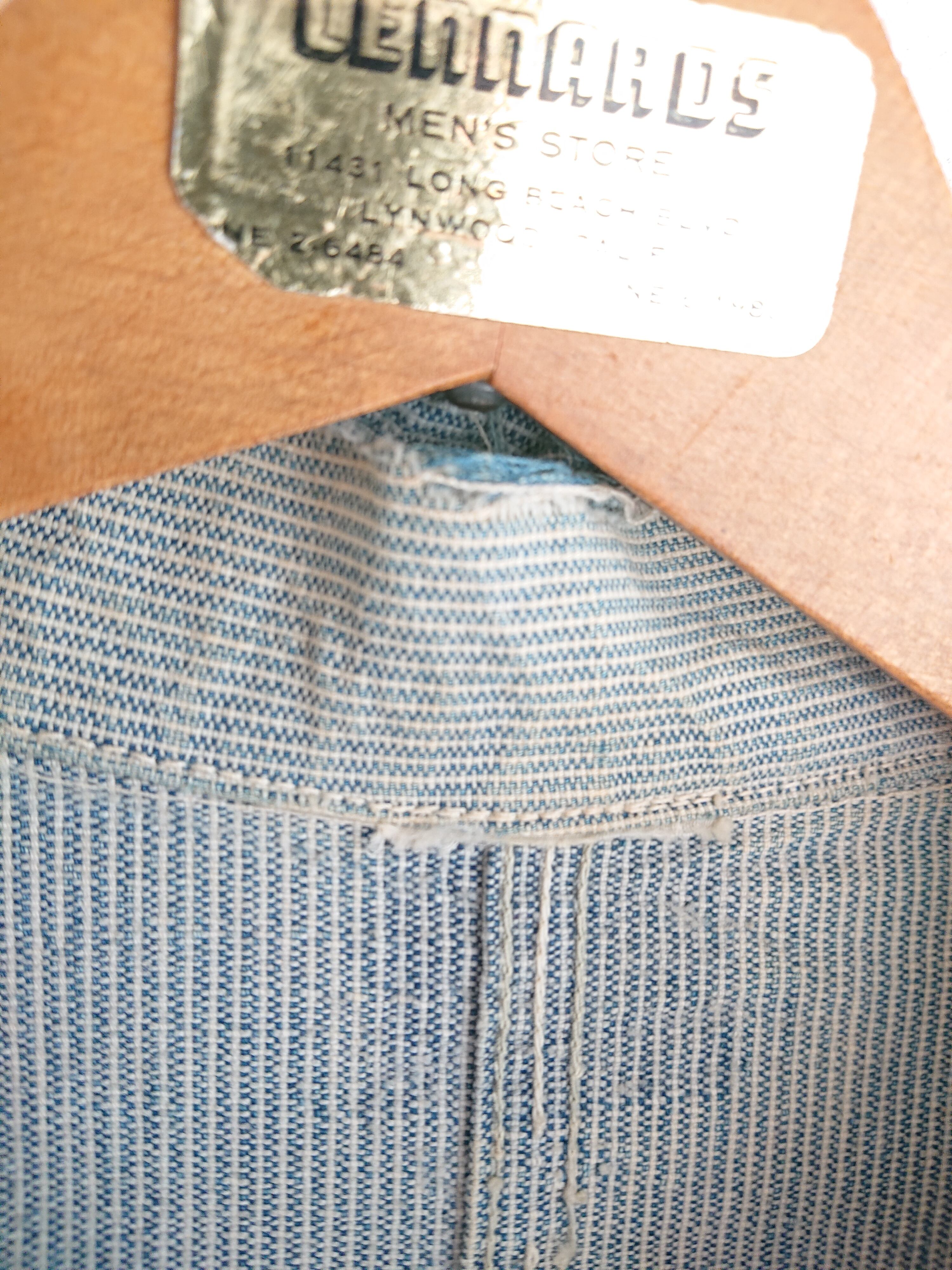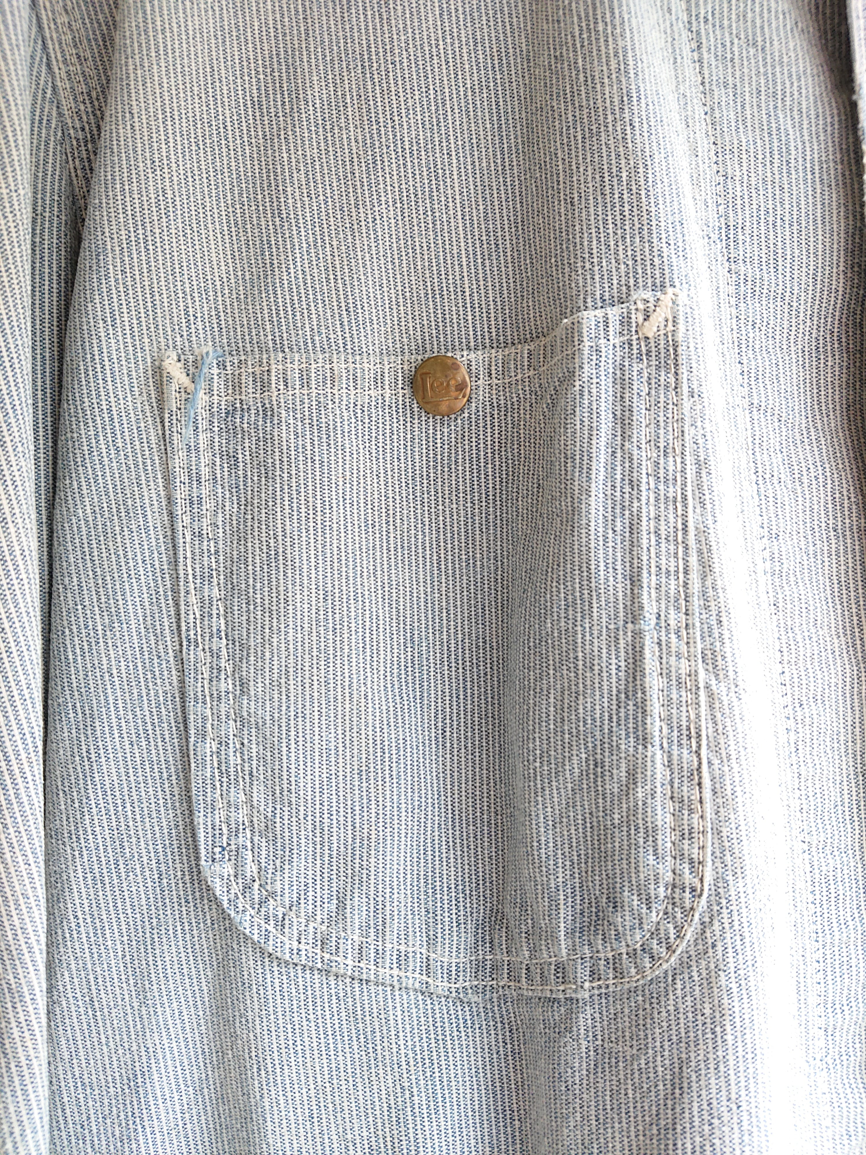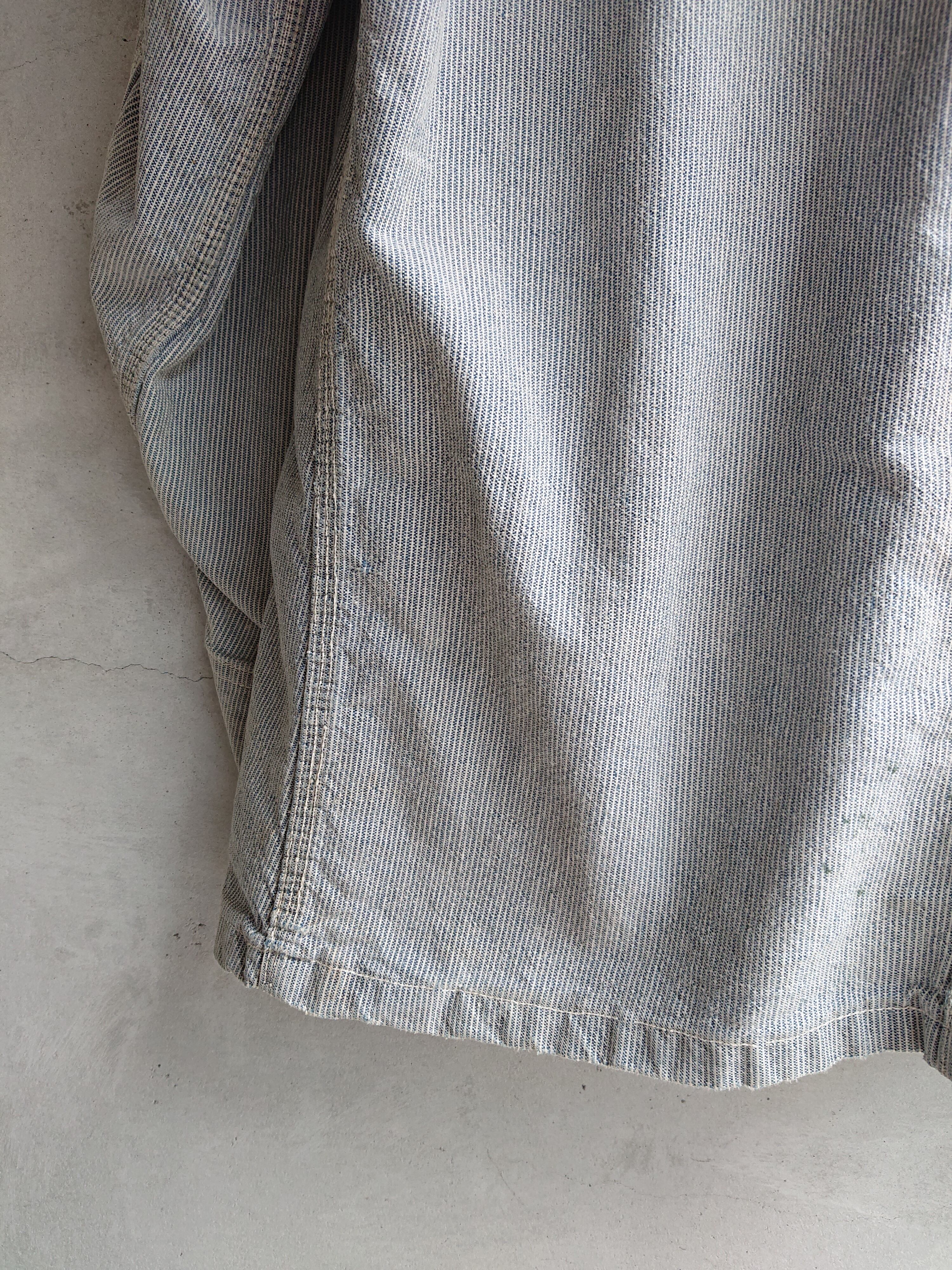 Leeのカバーオールの中で現存数が少ないと言われてるピンストライプ。ヒッコリーストライプとは違う表情。タグが欠損しており、タグが付いてた跡が襟下にあるので50年代のハウスタグが付いてた可能性があります。両腕にうっすらと汚れあり。襟部分に5cm程のヤブレに両袖口擦れがありますが着用に問題ありません。着用した感じ42位のサイズかなと思います。早々入荷することない Lee 96-J。サイズ合う方いかがでしょうか。