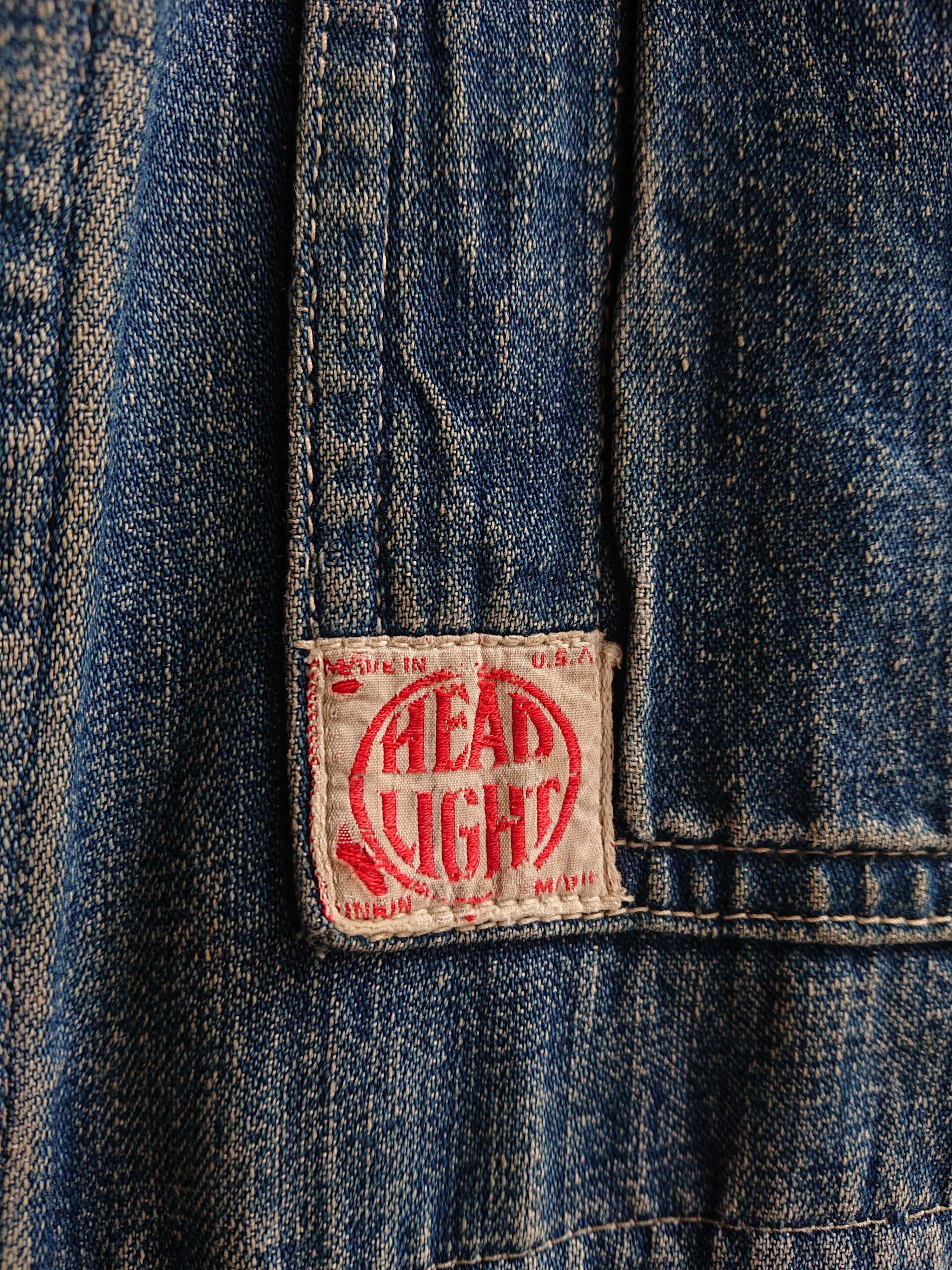 1940年代のHEAD LIGHT デニムカバーオールになります。セットインのタイプでシンプルなデザインのカバーオールにはなりますが左胸ポケットにつくHEAD LIGHTタグが光を放ちます。デニムの色落ち、腕や袖口、裾等所々にあるリペア箇所もこのジャケットがもつ雰囲気の一部。今お探しの方も多いヴィンテージカバーオール。気になった方はこの機会に是非。