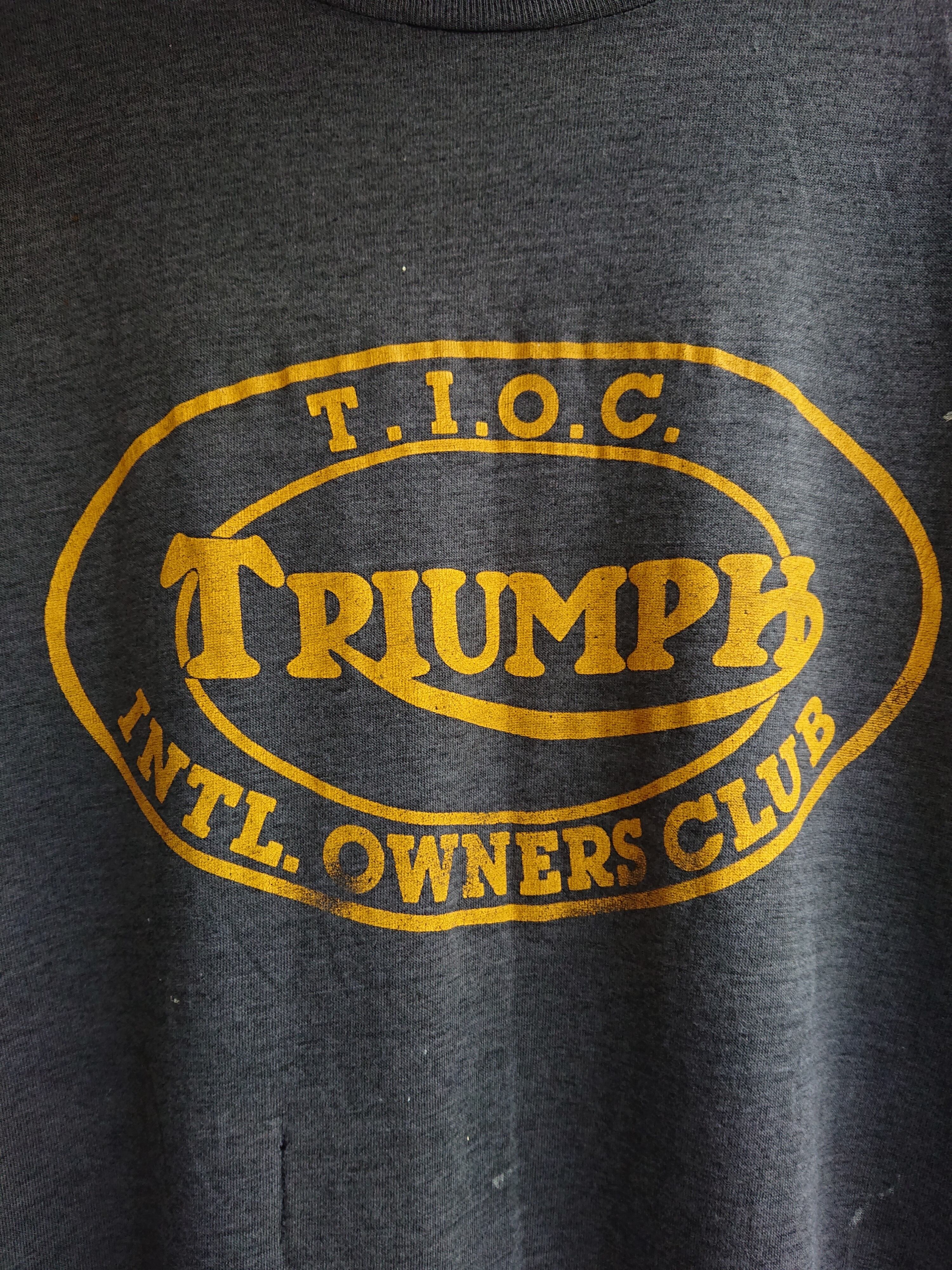 1980年代 TRIUMPH OWNERS CLUBのTシャツになります。先に紹介したカットオフTEEと同じ場所で入手したものになります。世界各地にトライアンフ オーナーズクラブの支部が存在。トライアンフのバイクを所有する人達が集まるクラブ。
