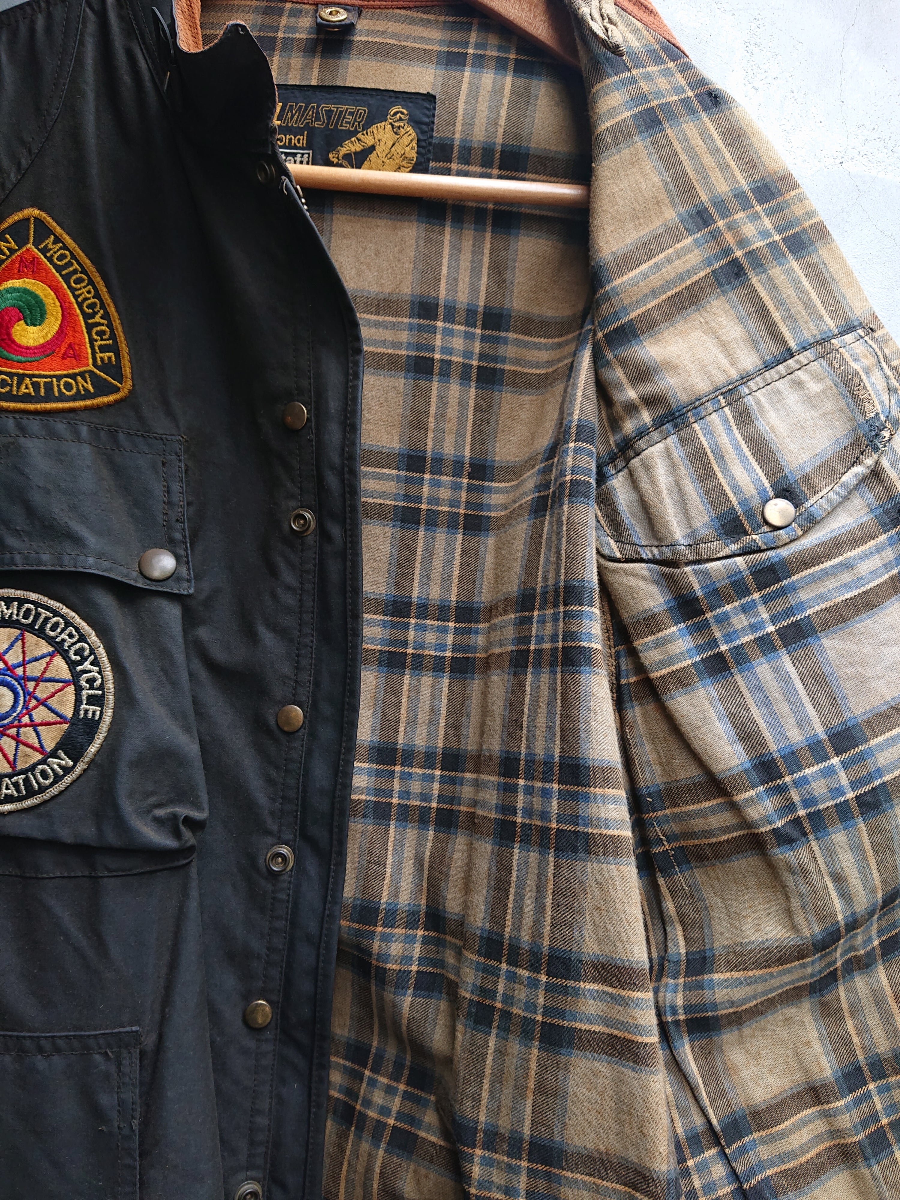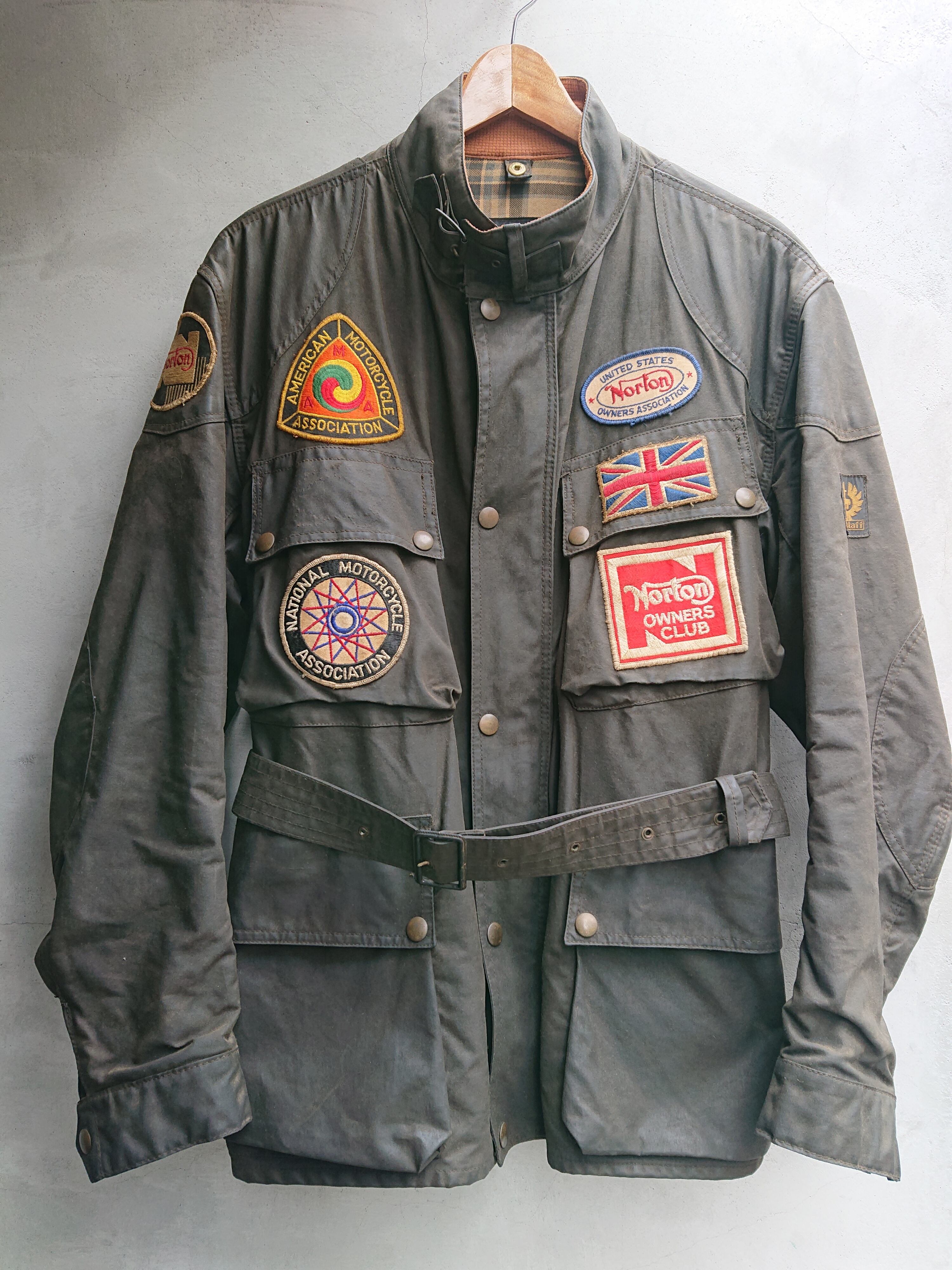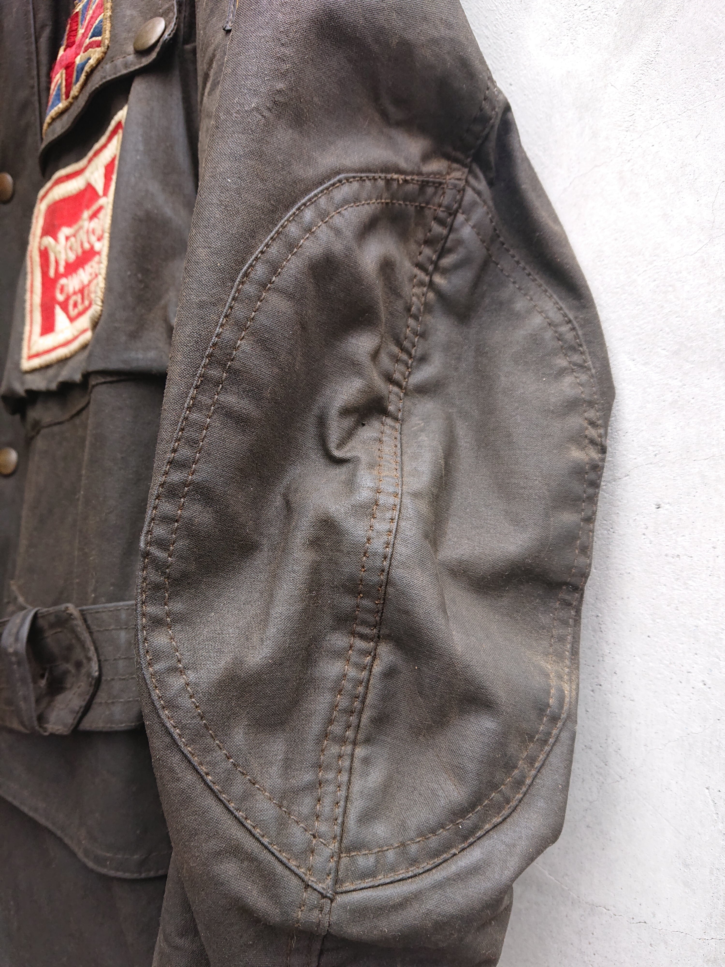 1960年代のベルスタッフ トライアルマスターになります。1924年創業のイギリスを代表するブランド Belstaff。高い撥水性を考慮し、通気性のあるワックスコットンを世界に先駆け使用したブランドの1つと思います。今回紹介するトライアルマスター、Norton OWNERS CLUBのものでフロントと背中にワッペンにAMA、NATIONAL MOTORCYCLE ASSOCIATION等のワッペンもついたスペシャルなジャケット。レザージャケットと同様、着込んでいくほど雰囲気が増してくるワックスコットン。ジャケット自体にワックスは残ってますが、嫌なベタつきは無くワックスド特有の臭いも気にならないと思います。黒タグのがつくタイプで、内側にポケットが付き、ジッパーはライトニング製。現在はイタリア製になったベルスタッフ。ヴィンテージのイギリス製は雰囲気からして別格の佇まい。全体的にコンディション良い一着です。