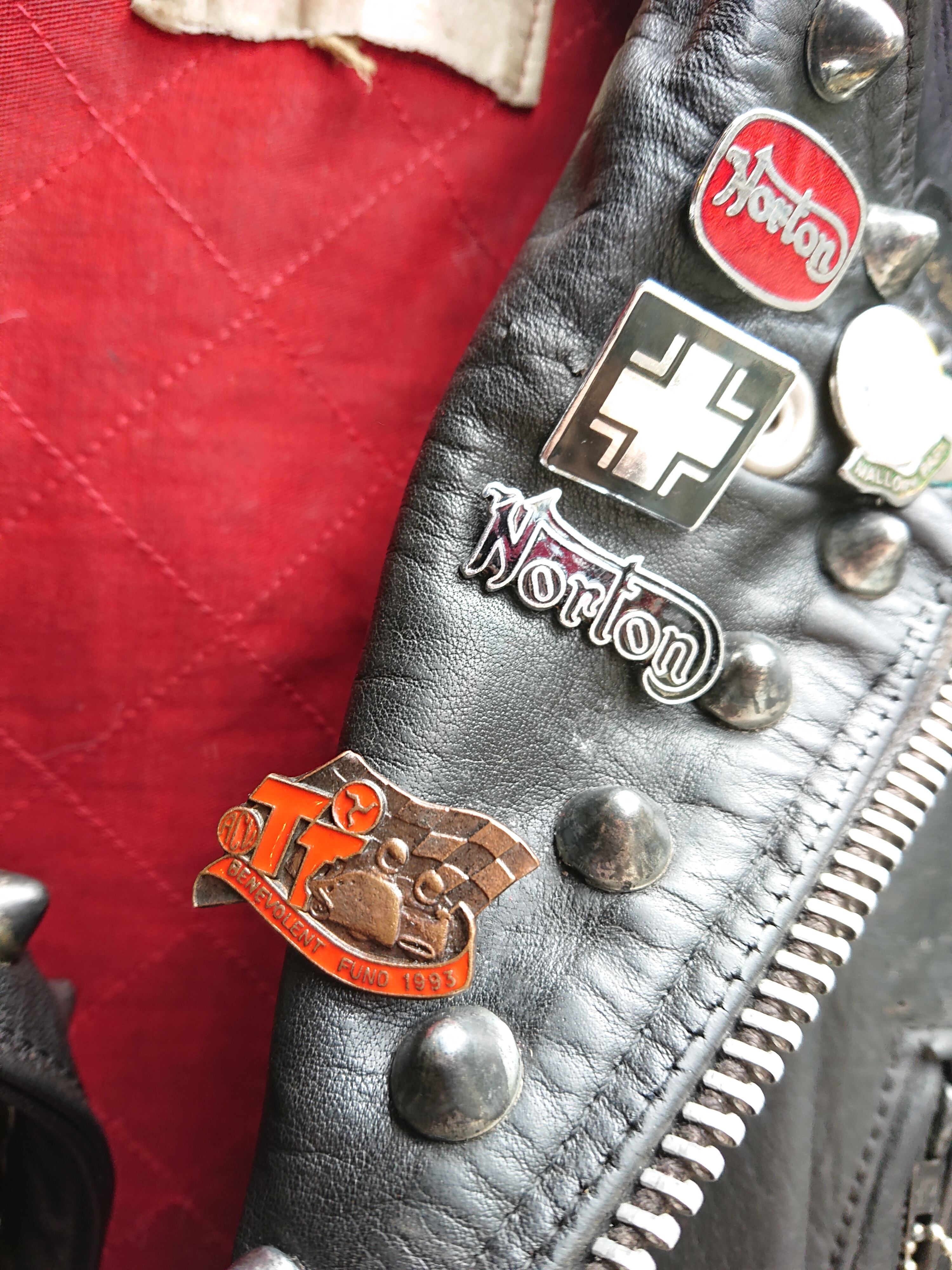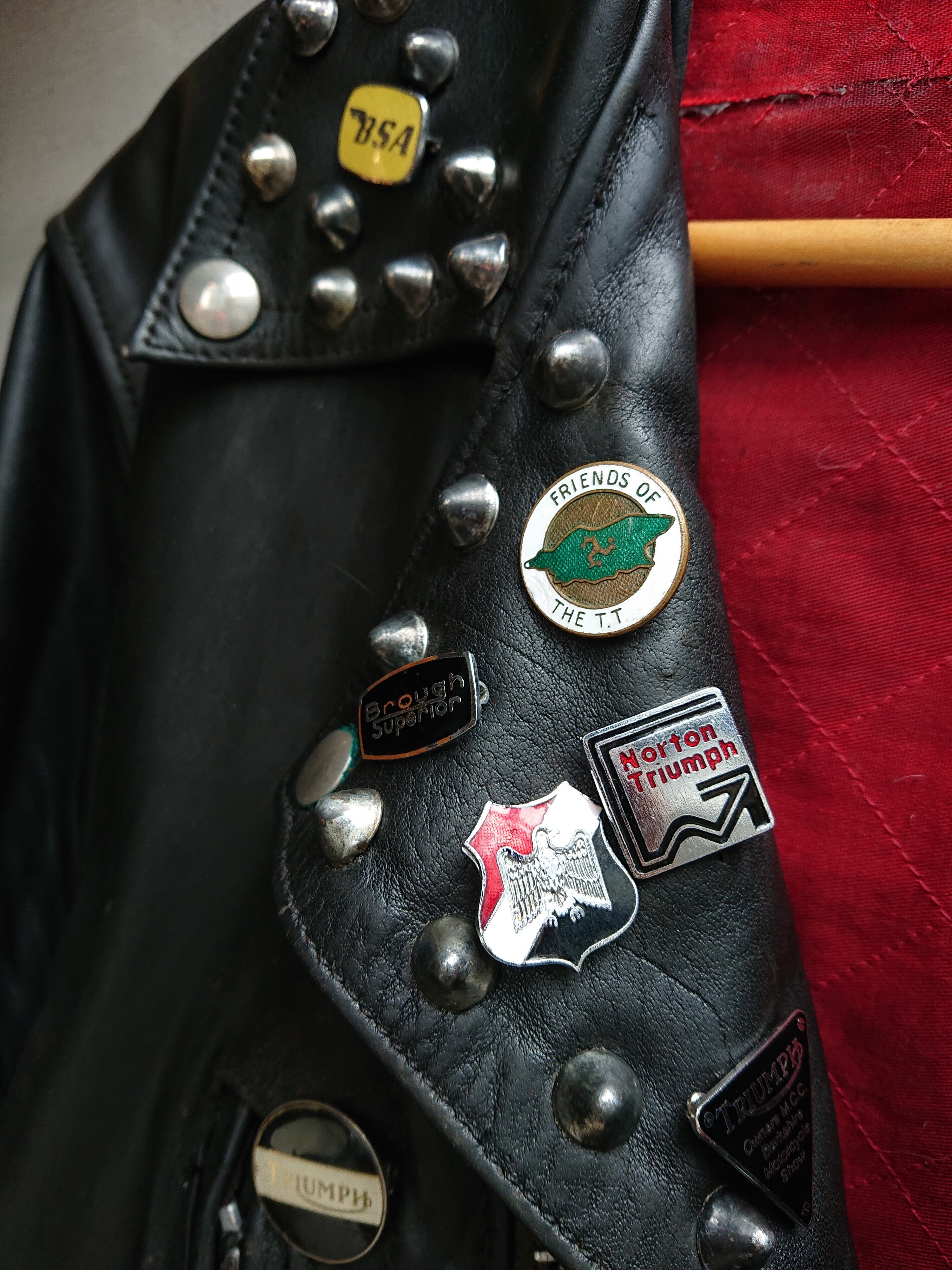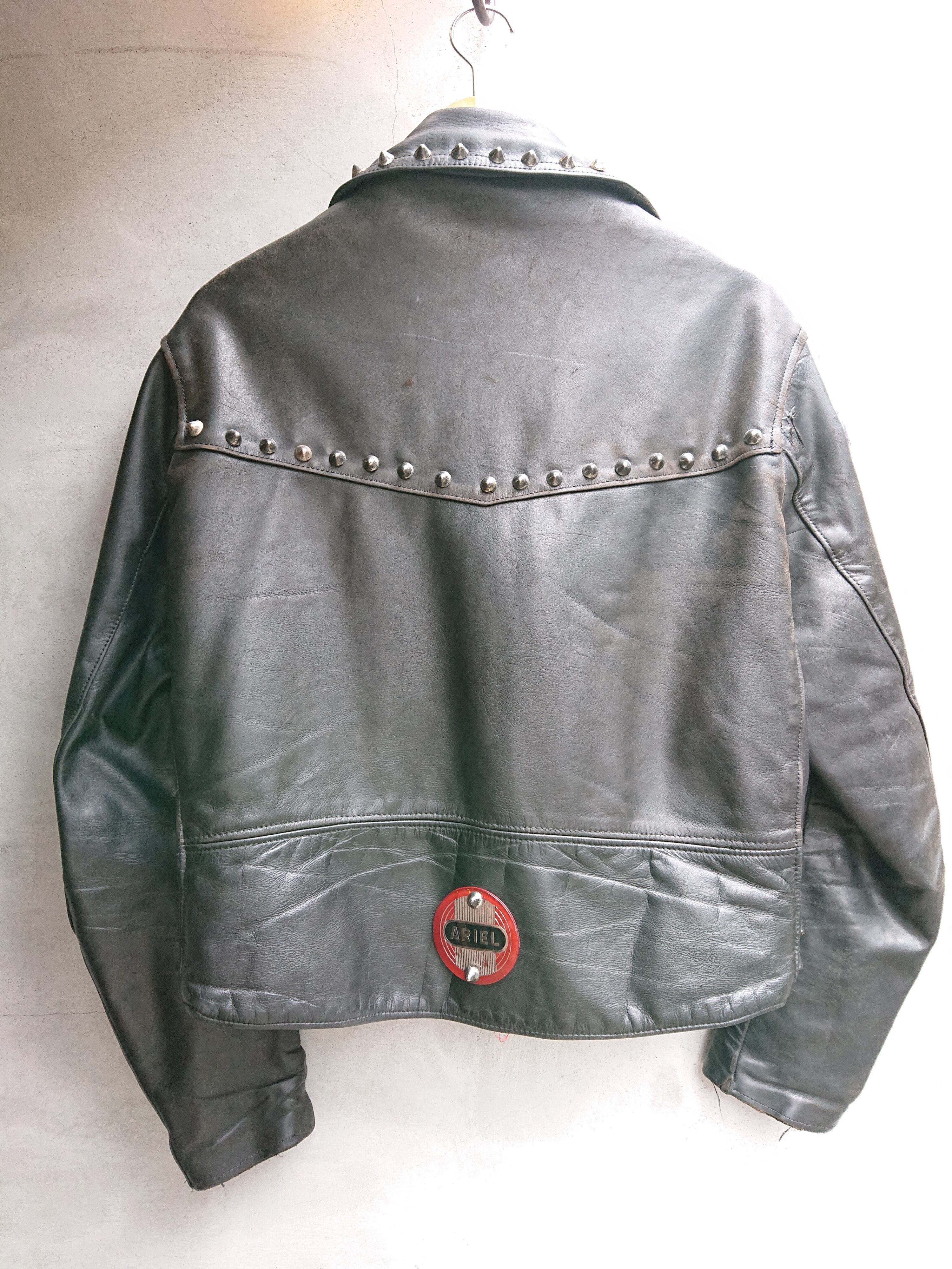 フロントの4つのジップポケットにサイド裾につくアジャストバックル。ロンジャンと言えばこのデザインが頭に浮かぶほどイギリスを代表するライダース。両腕に59のワッペン、TRIUMPH、Norton、BSA等のピンズにスタッズ。当時もののスタッズではないですが、全く気にならないインパクトを持つジャケット。右袖つけね辺りにリペア、キルティングが所々破れやリペアがありますが着用に問題はありません。まさに一点物と呼べる