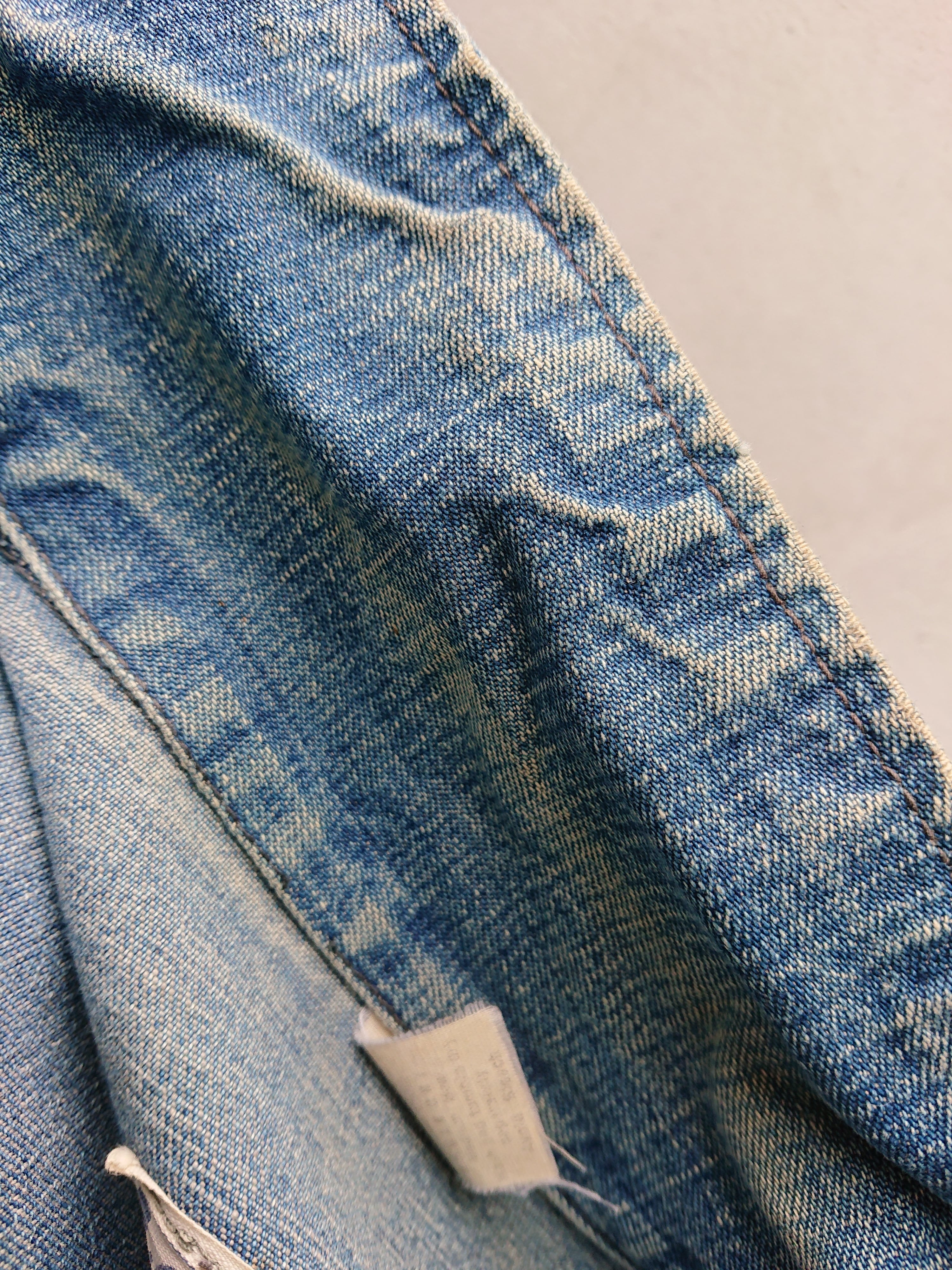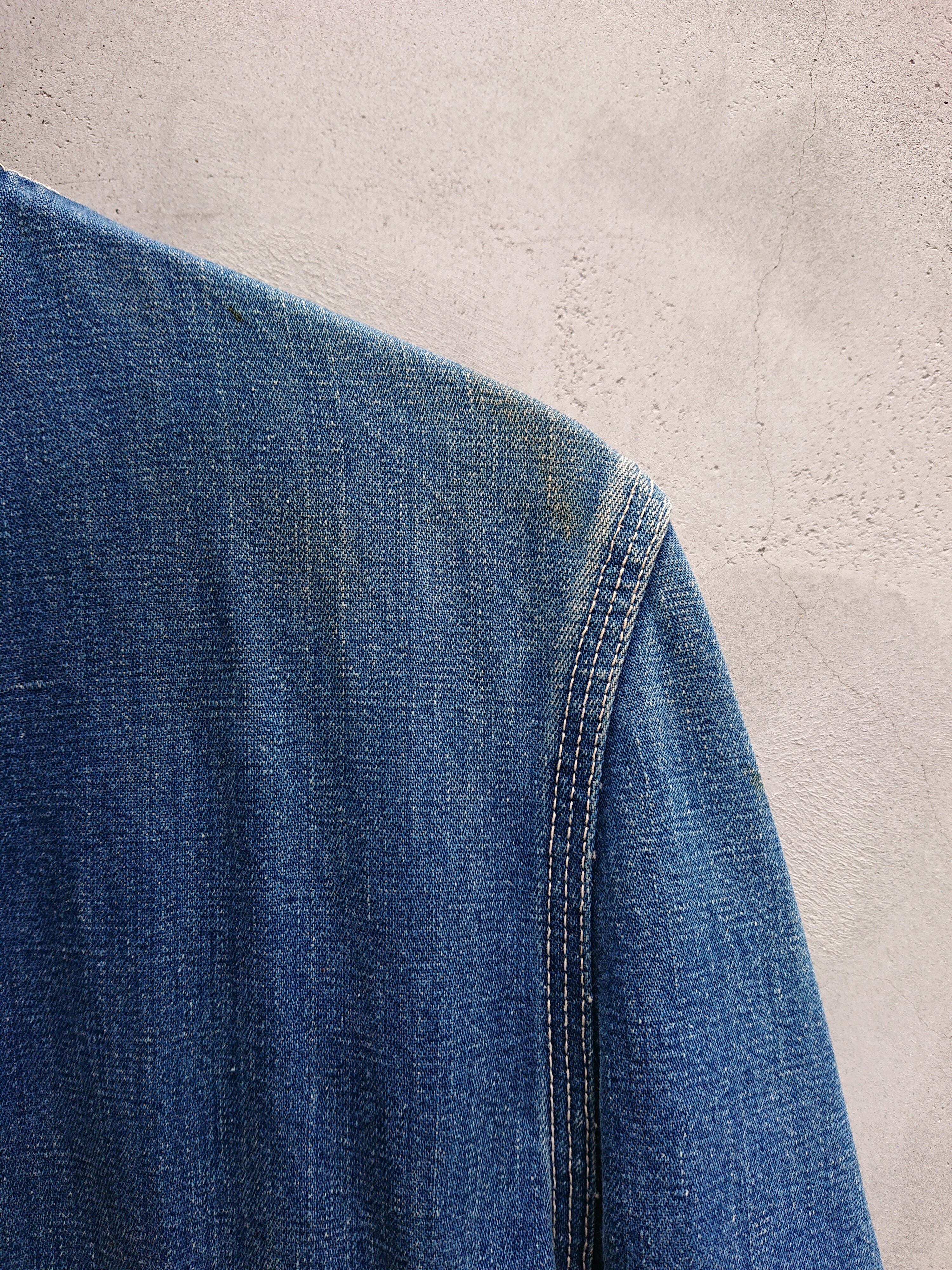 1970年代頃の Lee 91-J デニムカバーオールになります。Leeのアイテムの中で代表的アイテムの1つでもある"91-J" 。ジェルトデニムを使用。襟と右下ポケットの端に織り柄が出てるのが見た目に特徴があります。襟の織り柄が見方によってデニムなのにコーデュロイのようにも見えます。色落ちした雰囲気も良く、背中に破れがありますが