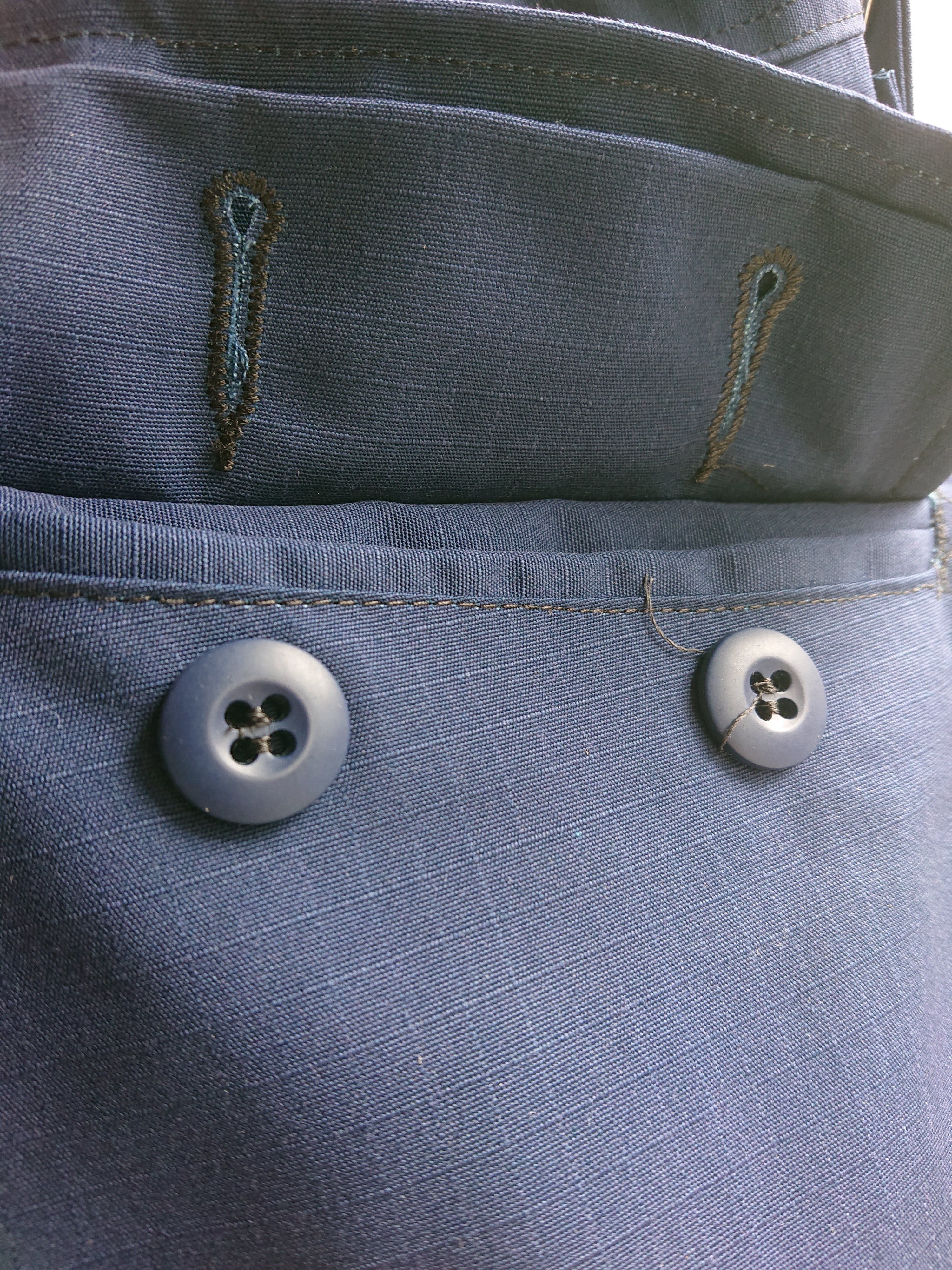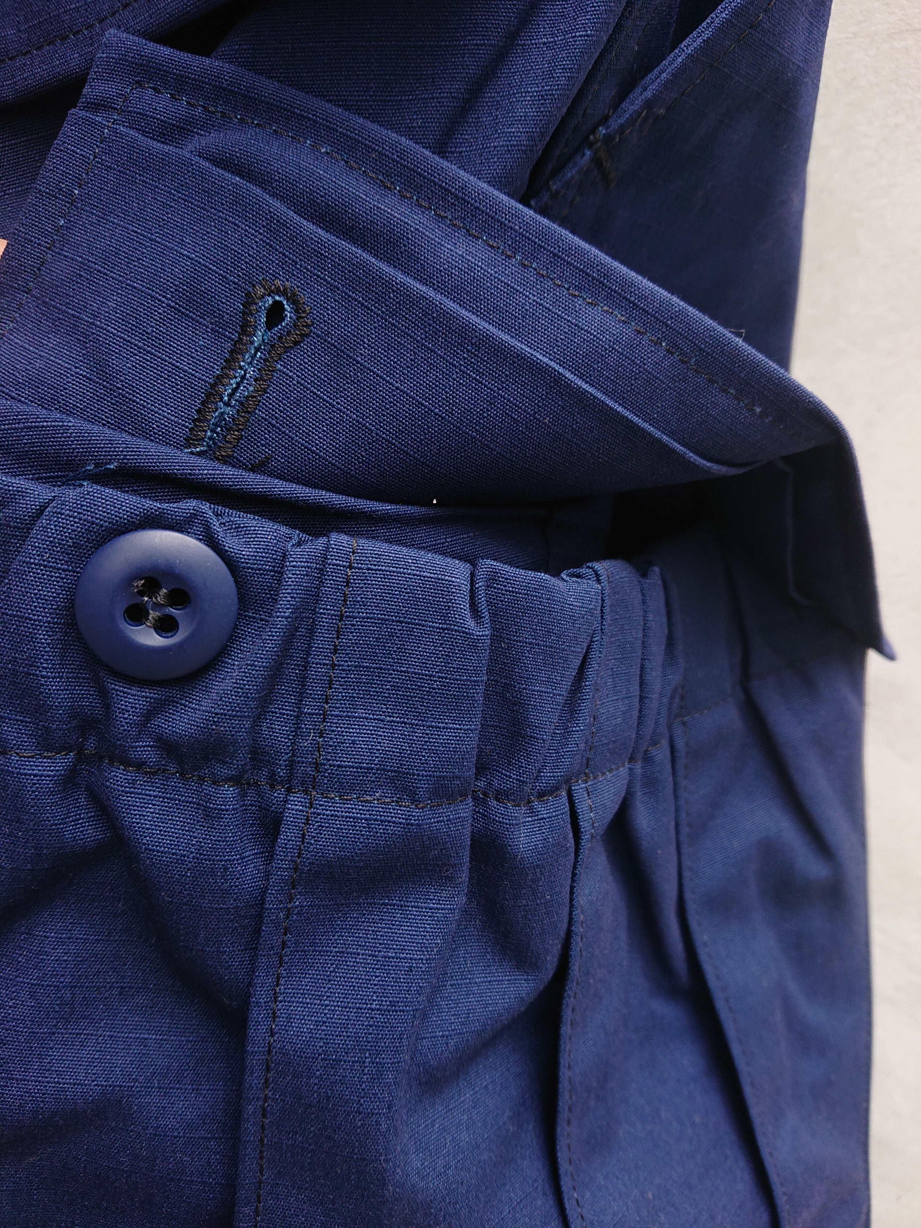 米軍のBDUパンツのようなデザインで、サイドポケット、バックポケット、カーゴポケットがそれぞれ2つずつ配置されています。バックポケットとカーゴポケットには2重構造のフラップが付いており、ボタンが外に露出しない仕様で、カーゴポケットは正面と底部分にもマチ付きで立体的な構造になっています。カーゴポケットのボタンは1箇所ですが、ゴムシャーリングが付属することで荷物の落下を抑える独特なデザイン。