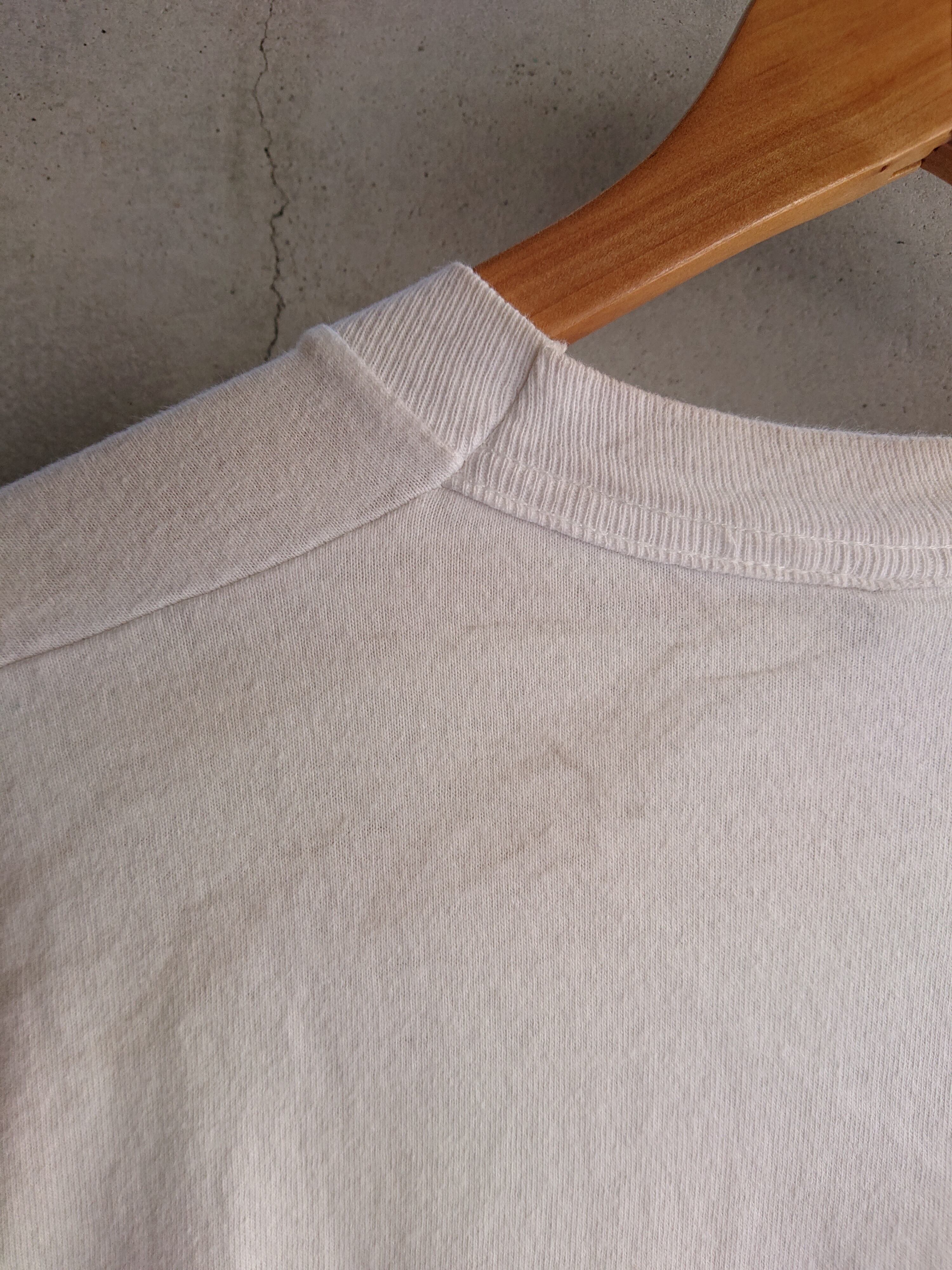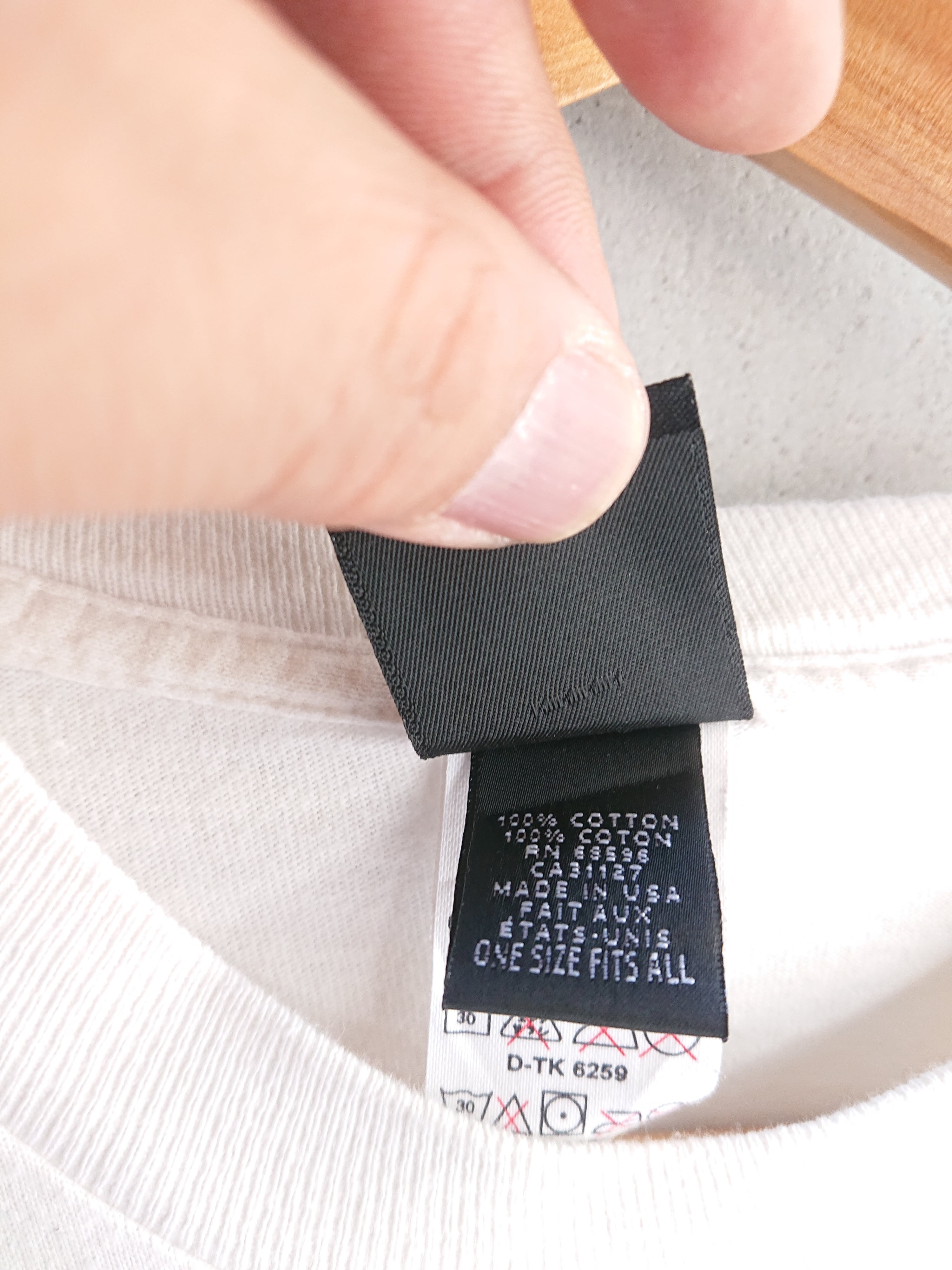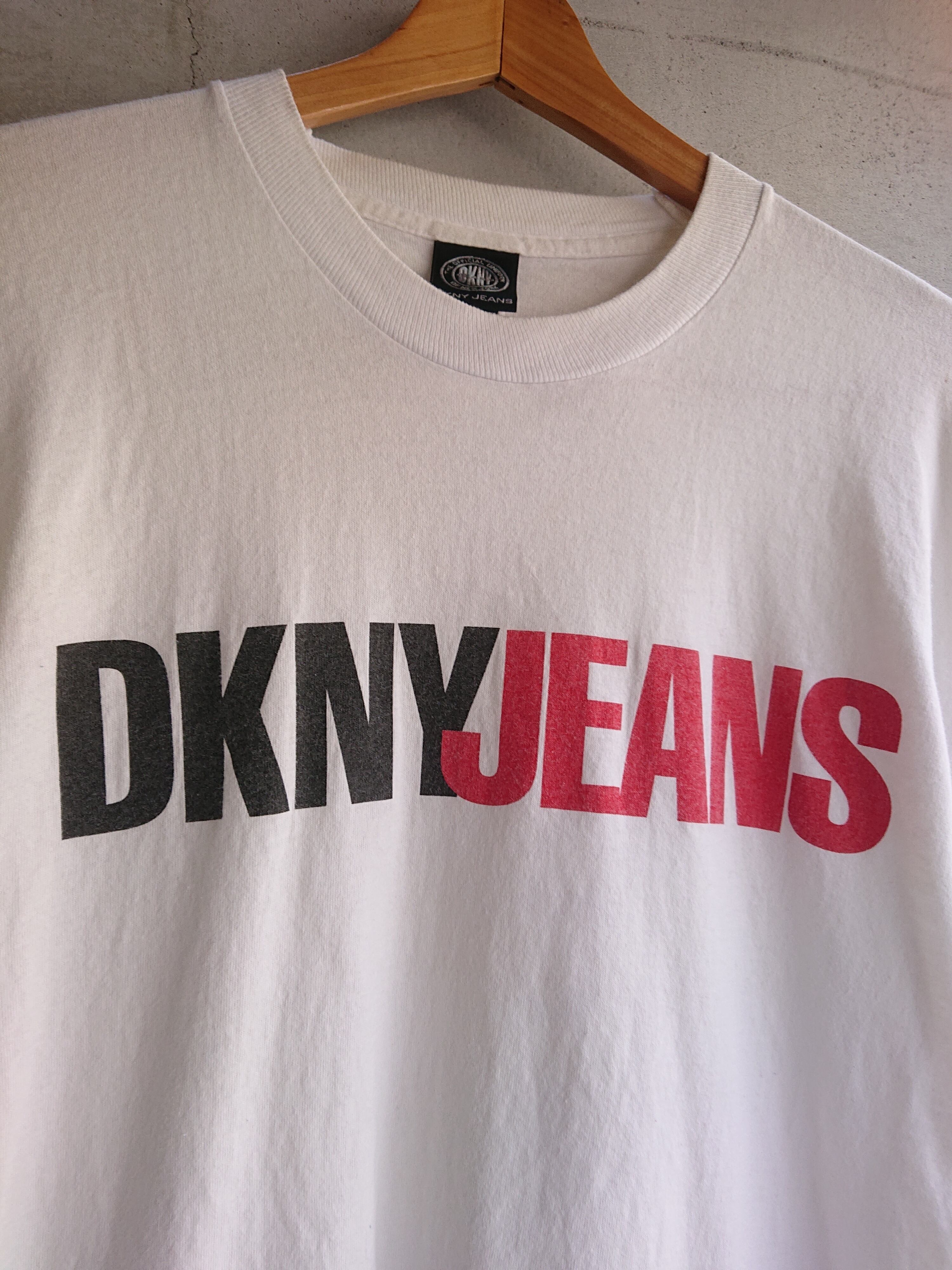 90年代 DKNY JEANSのプリントTシャツになります。ホワイトボディにブラック/レッドプリント。ブランドロゴのみのシンプルさが格好良いです。背中の左肩辺りがうっすらと汚れあり。ストリートなスタイルのポイントに。MADE IN USA製。