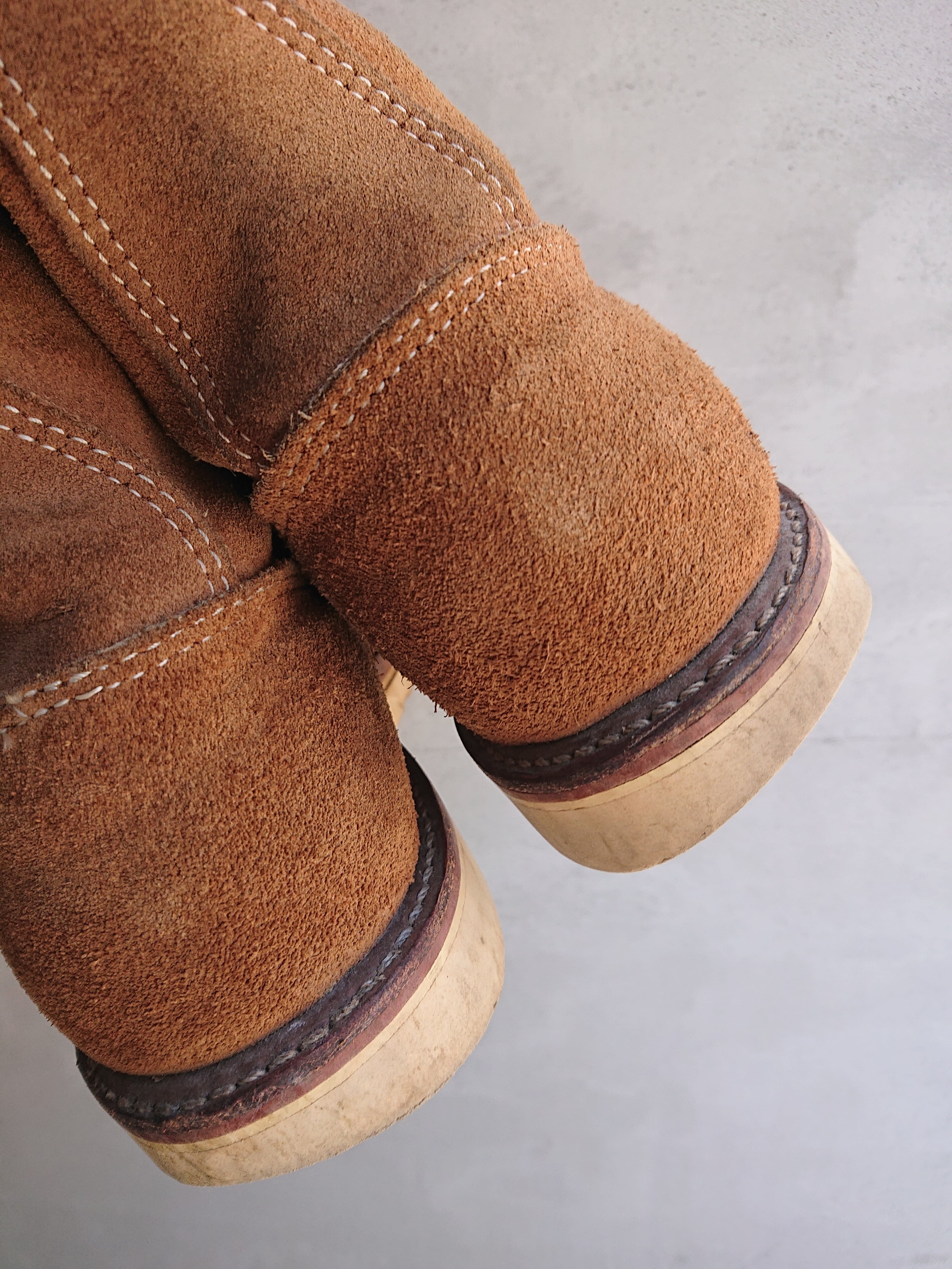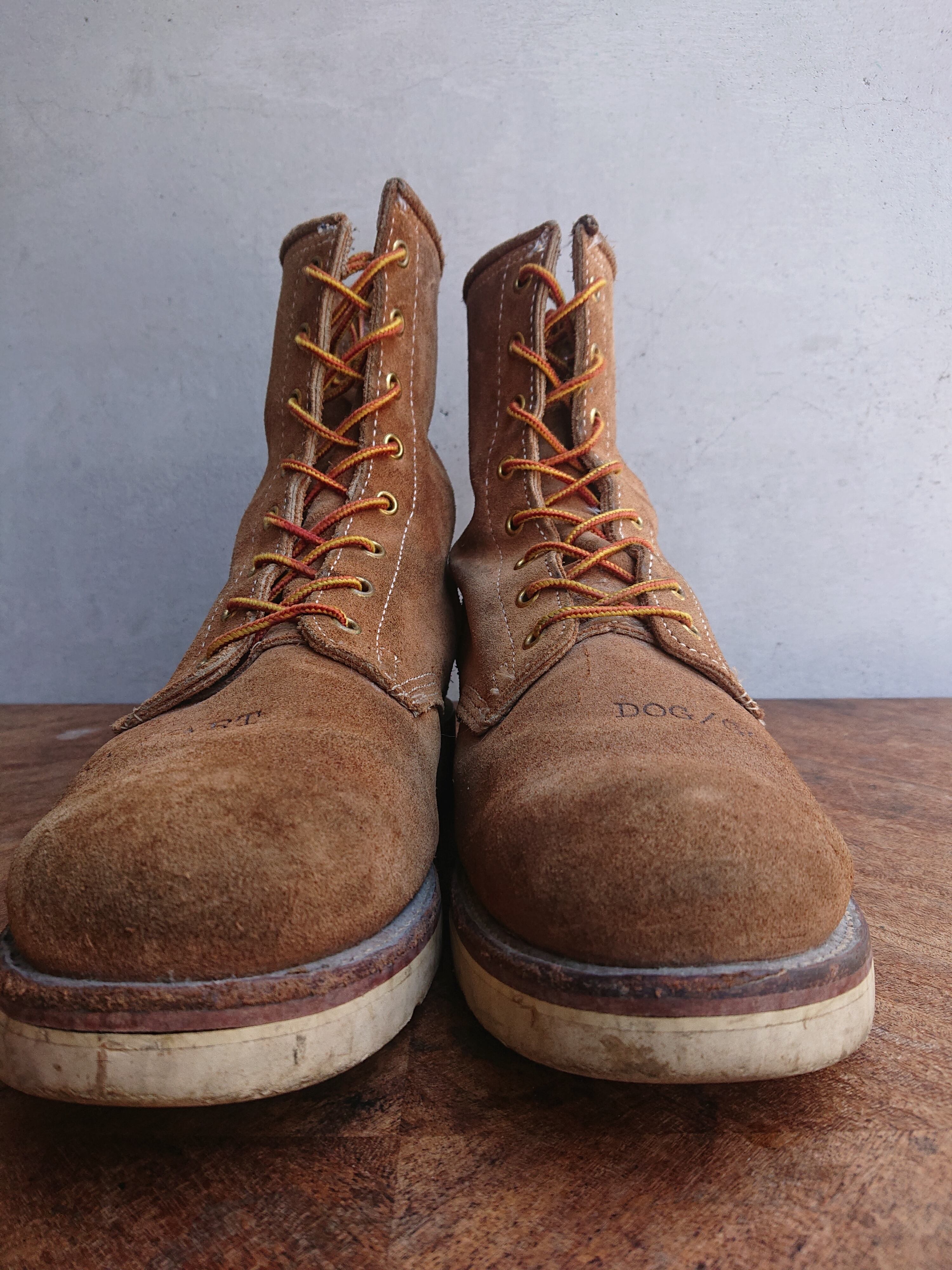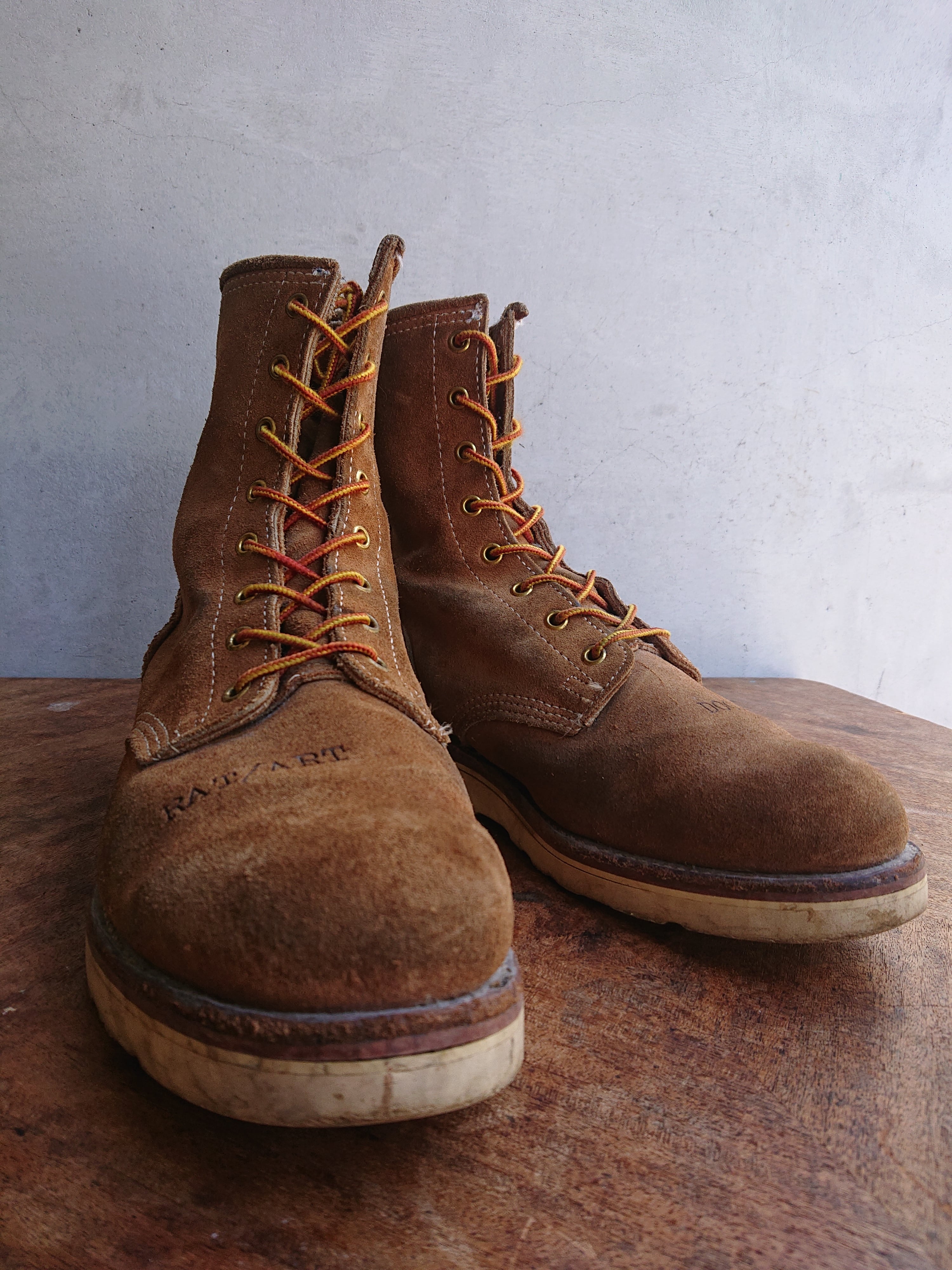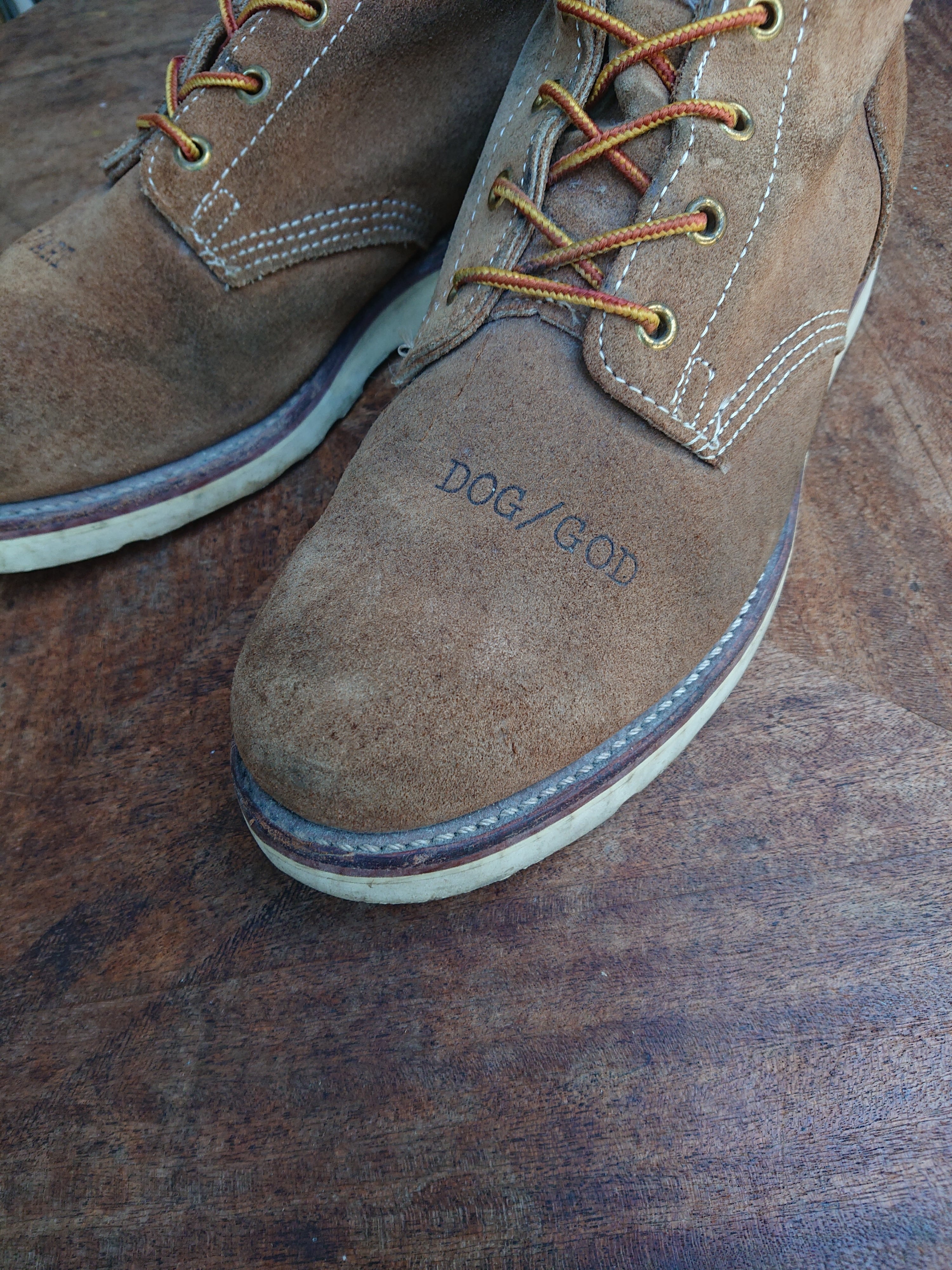 HYSTERIC GLAMOURのスエードブーツになります。8ホールのレースアップブーツ。一見シンプルなスエードブーツですが右足にはRAT/ART、左足にはDOG/GOD、両足踵にはHystericの文字が入ります。レッドウイング等の他のスエードブーツではなく、違うのを求めたい方にはもってこいではないでしょうか。本来内側にサイズが記載されてますがほとんど消えてしまってますが、実寸サイズ的に恐らくUS 10位かと思います。クレープソールはビブラム。多少の汚れに若干ソールの減りもございますが履くのに問題はございません。