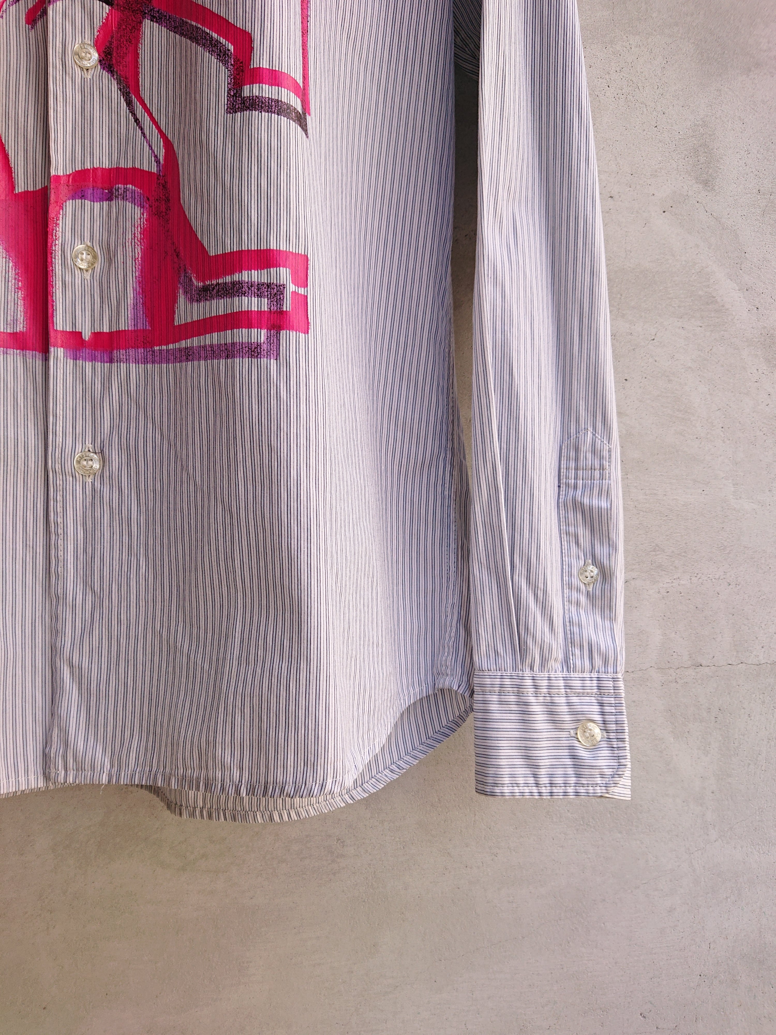 HYSTERIC GLAMOUR XXXのストライプシャツになります。シンプルなストライプシャツもフロントにアート的なプリント。フロントにデザインが入るだけでストライプシャツも一気に雰囲気が変わります。着用感ありますが致命的な傷等ありません。