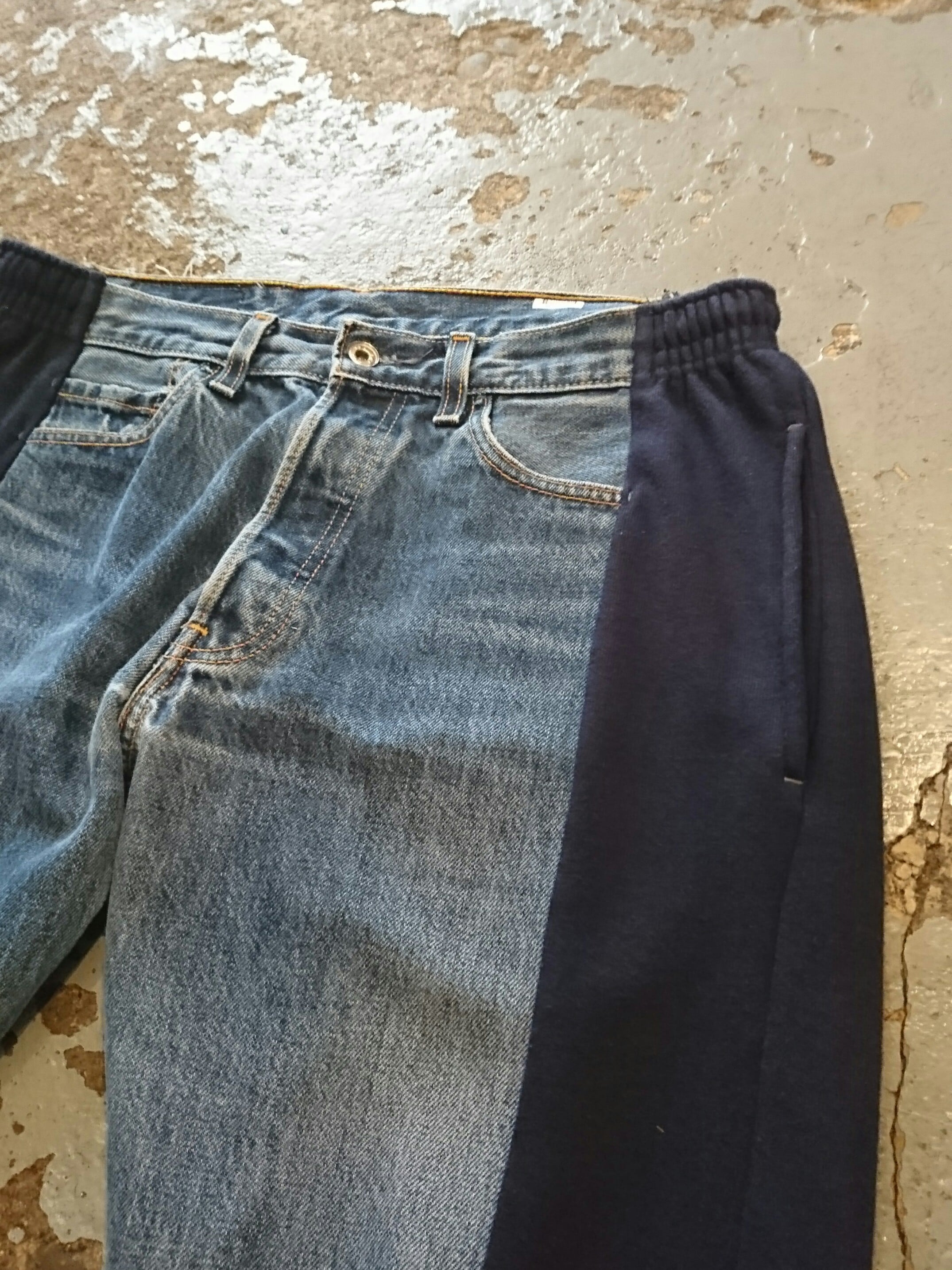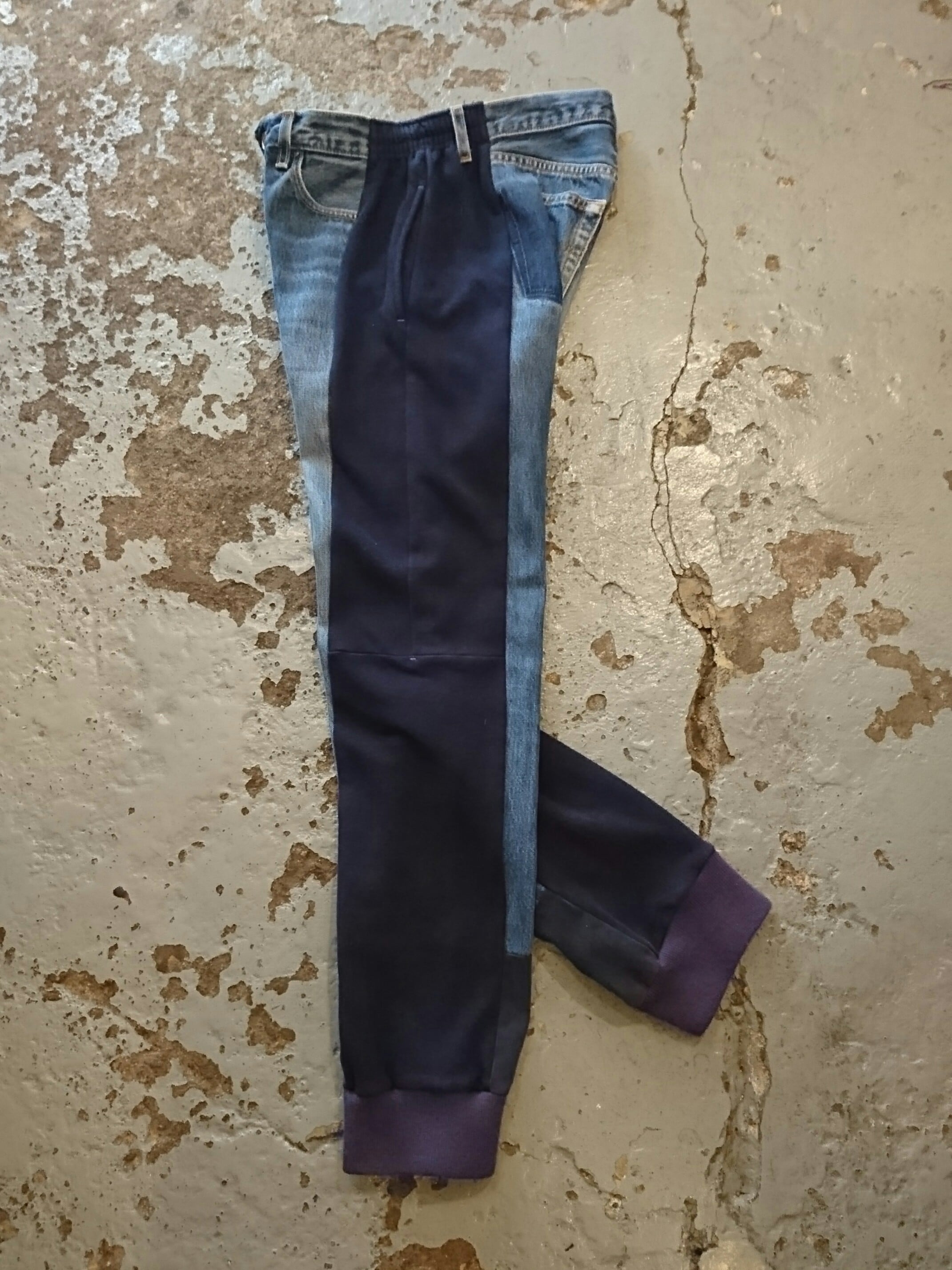 フランスのブランドです。デニムとスウェットを合わせたリメイクパンツ。デザイン性は勿論のこと、シルエットも細身で綺麗なパンツです。