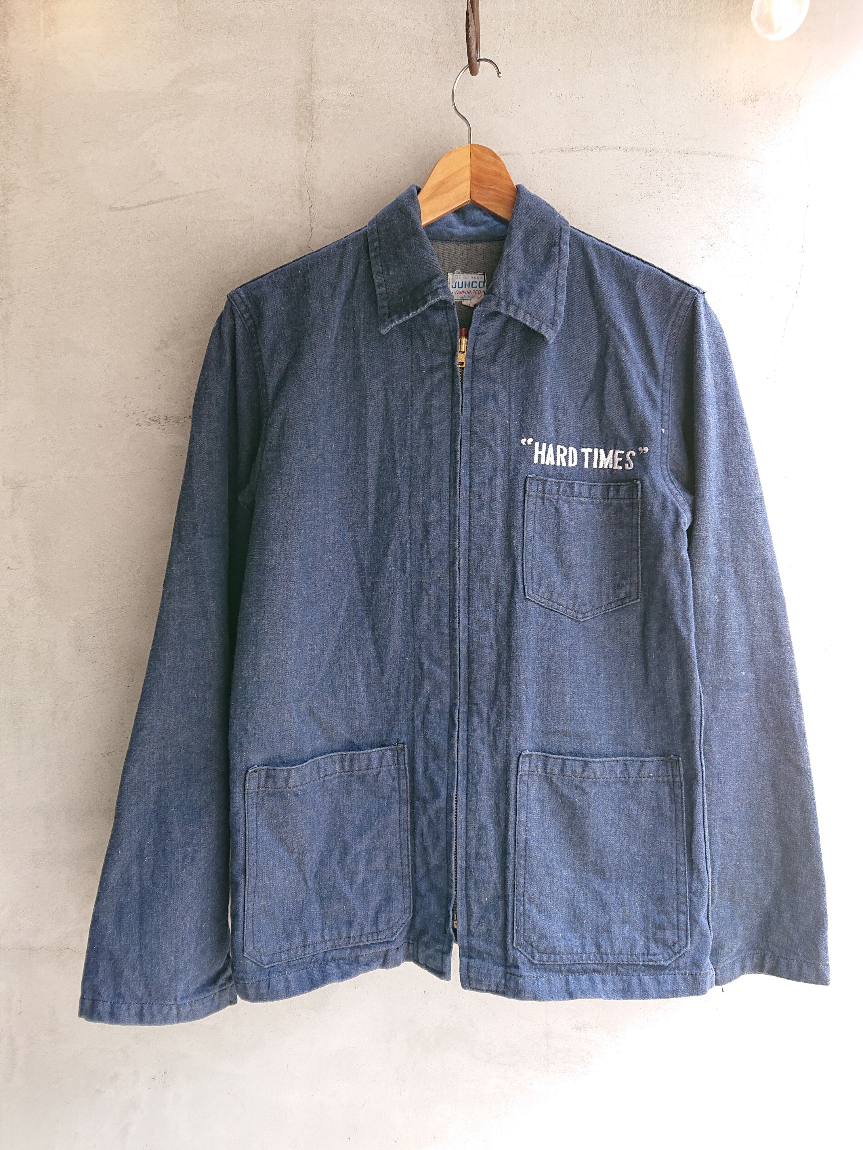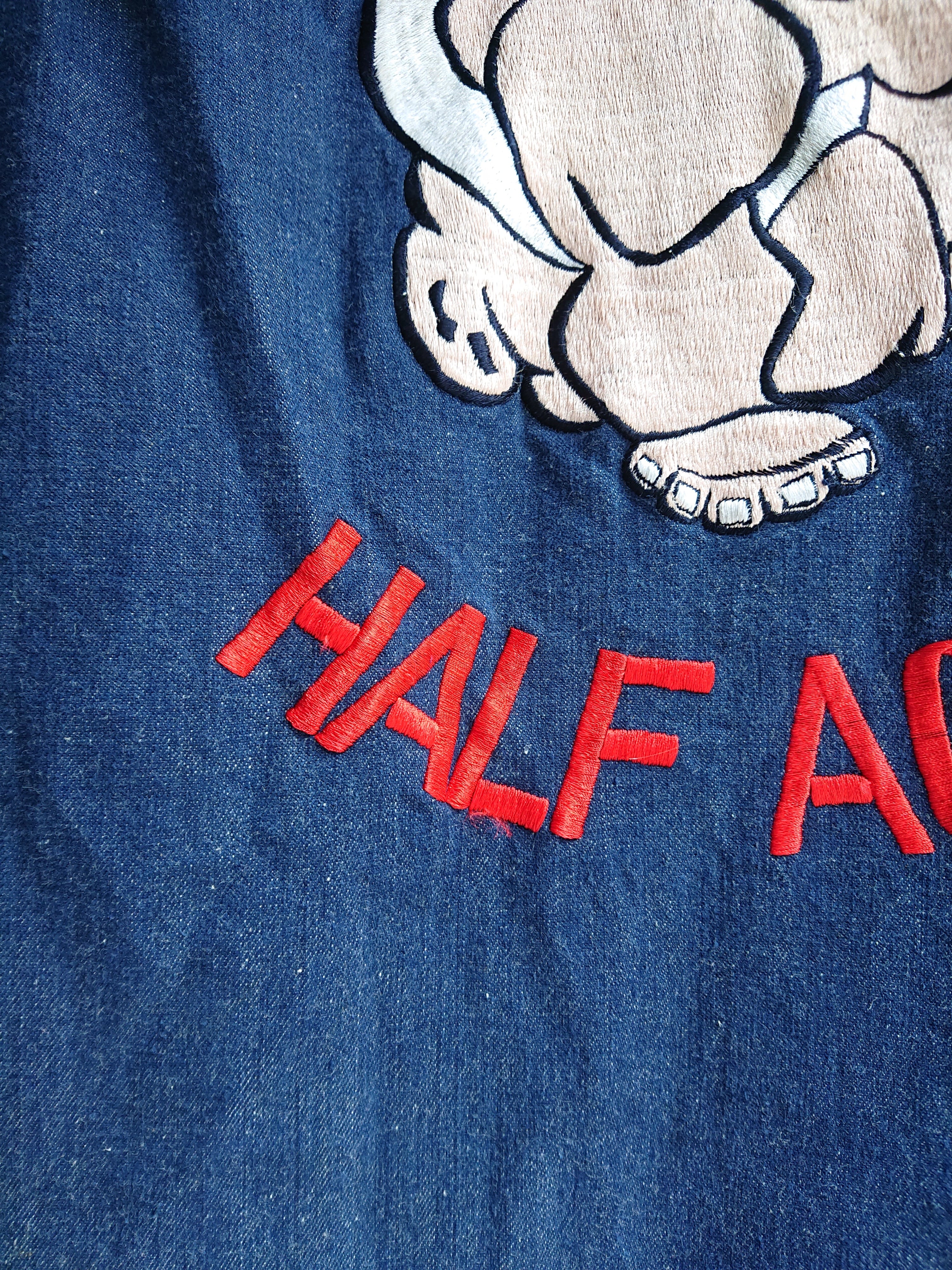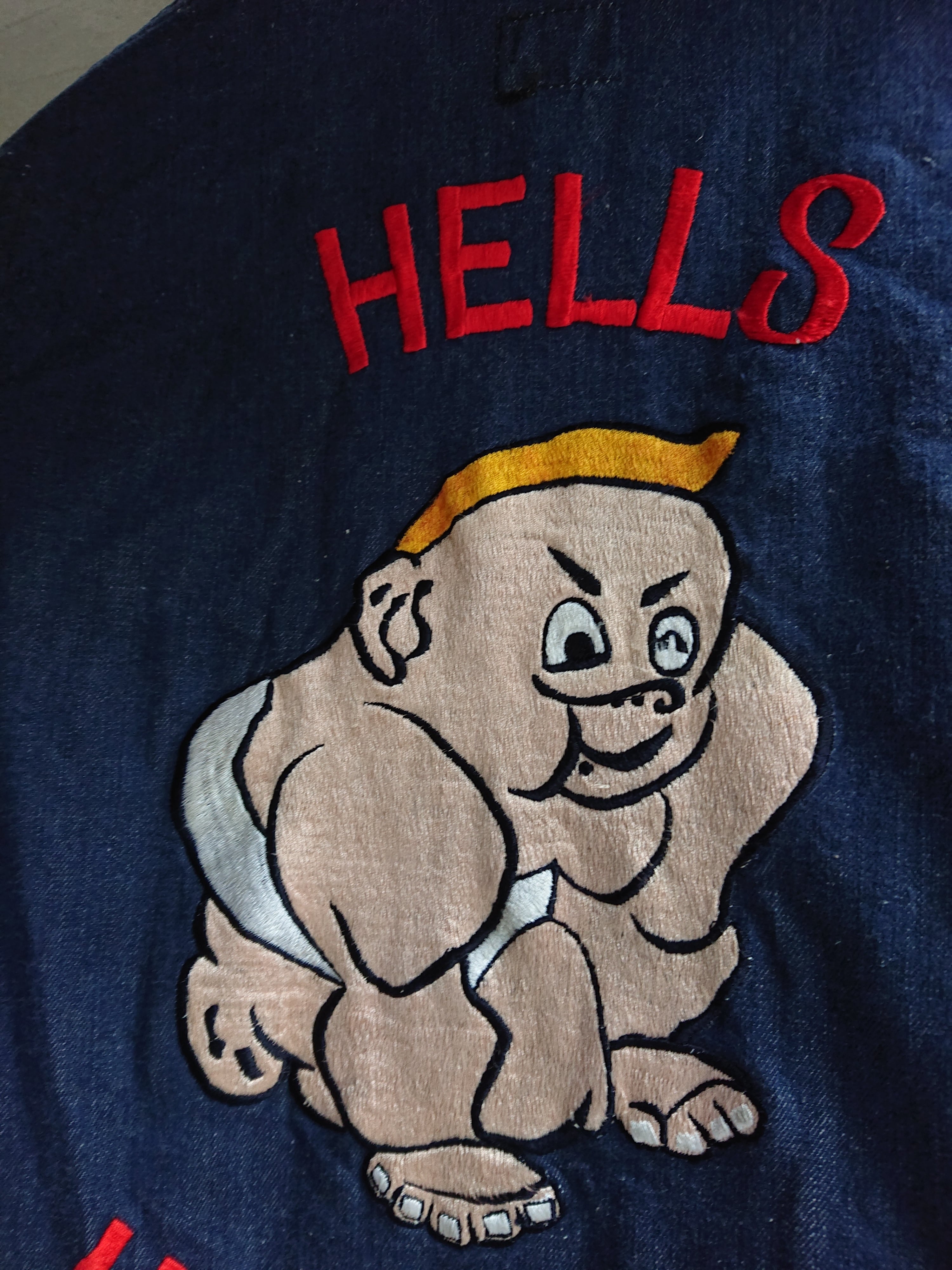 フロントはジッパー使用でパッチポケットの付いたカバーオールに近いデザインのジャケットになります。このジャケットの魅力である背中に入る刺繍。デニムのスーベニアジャケットです!ボディはMADE IN JAPANのものでYKKジッパーが付きます。サイズ表記がS-M付き、恐らく36くらいのサイズ感になるかと思います。早々お目にかかる事ないスペシャルピース!色残り、コンディションも良いのでサイズ合う方に是非オススメしたい一品です。
