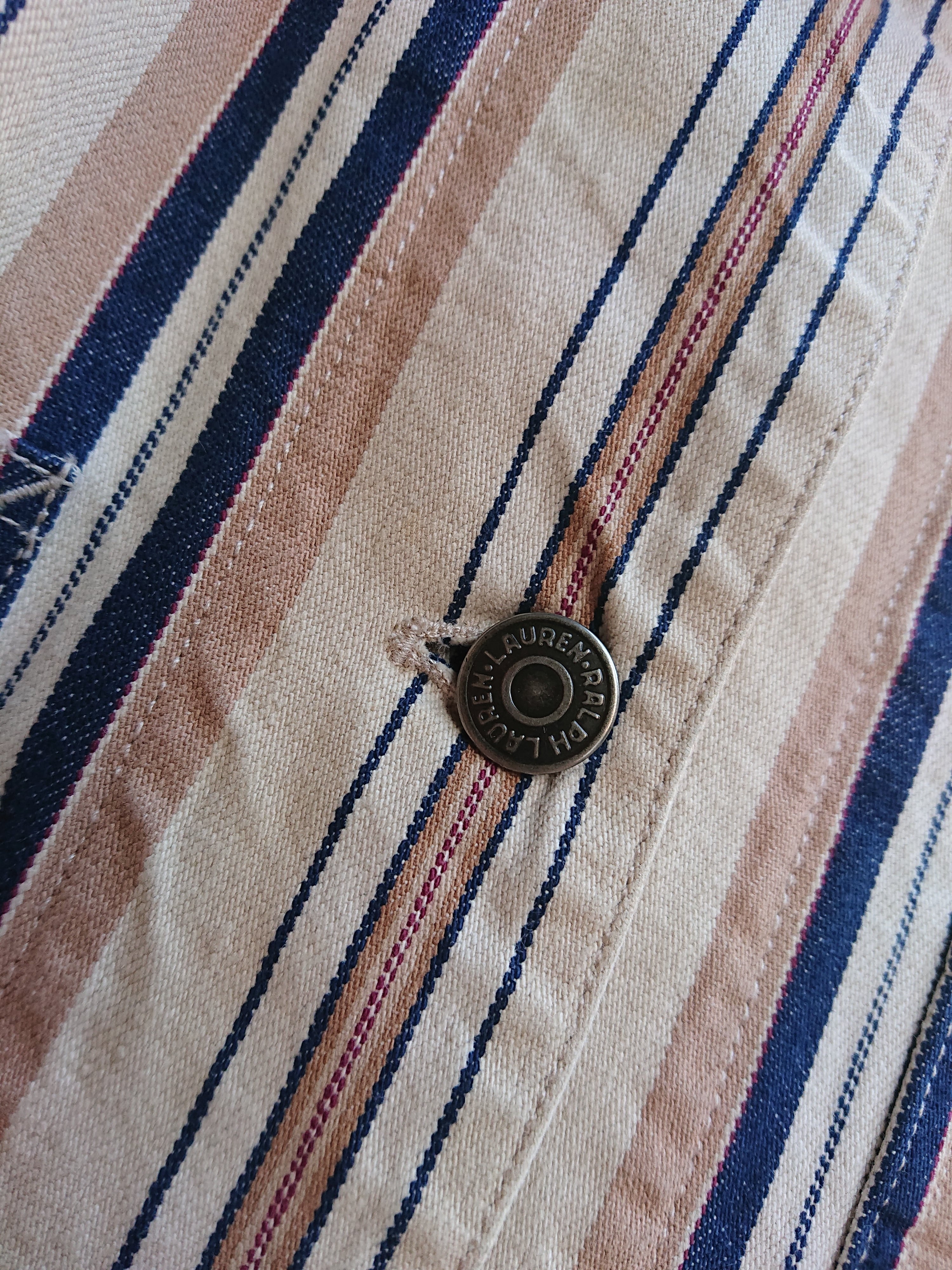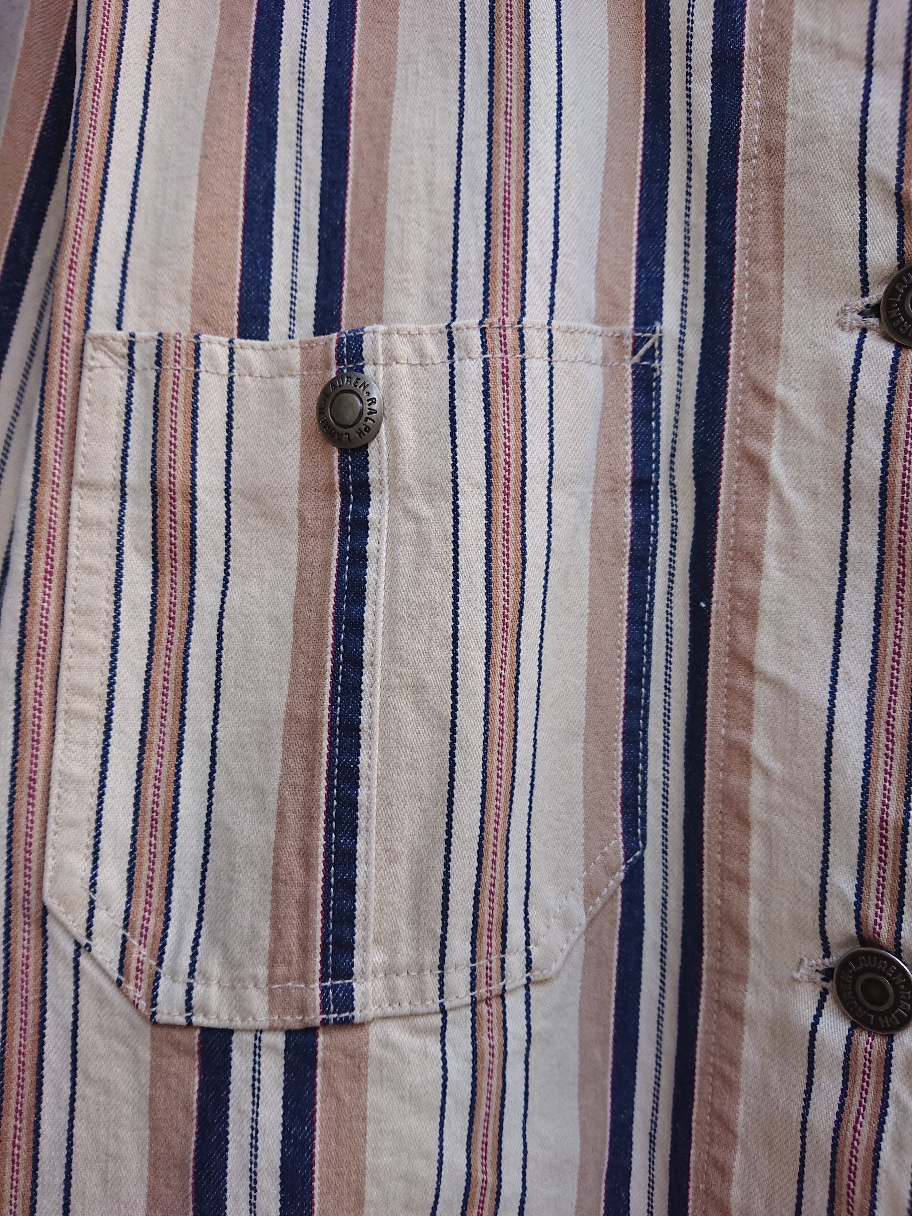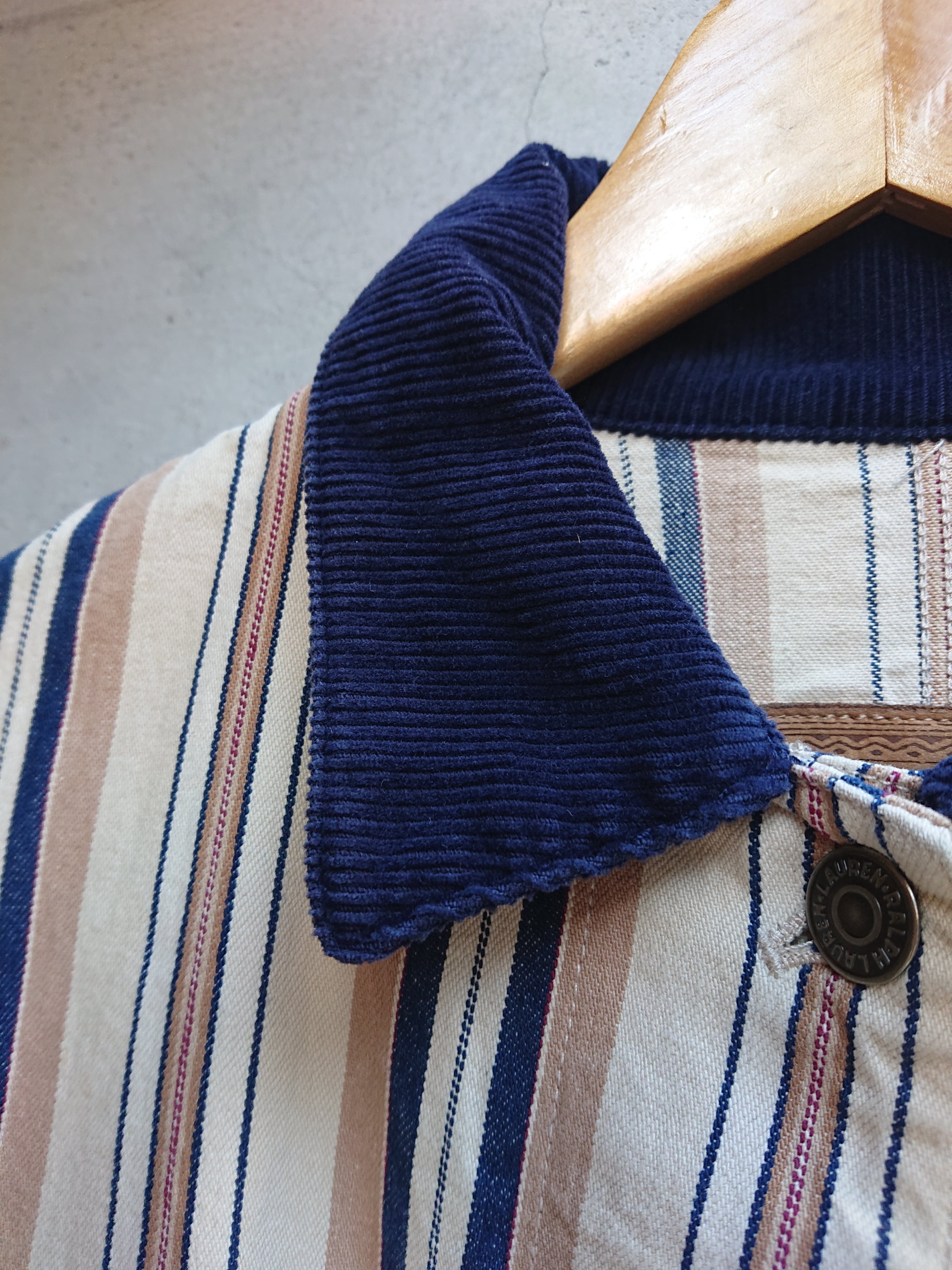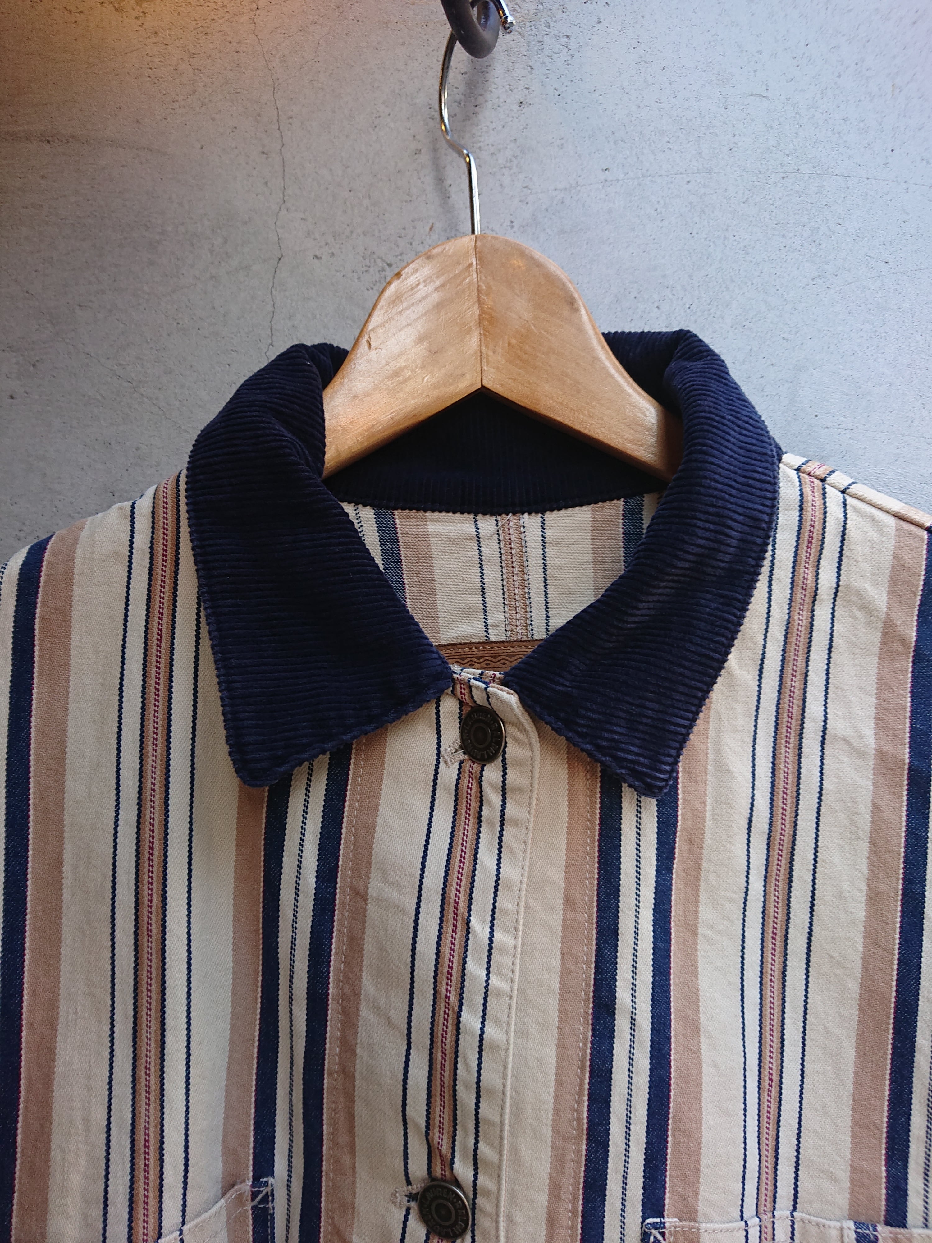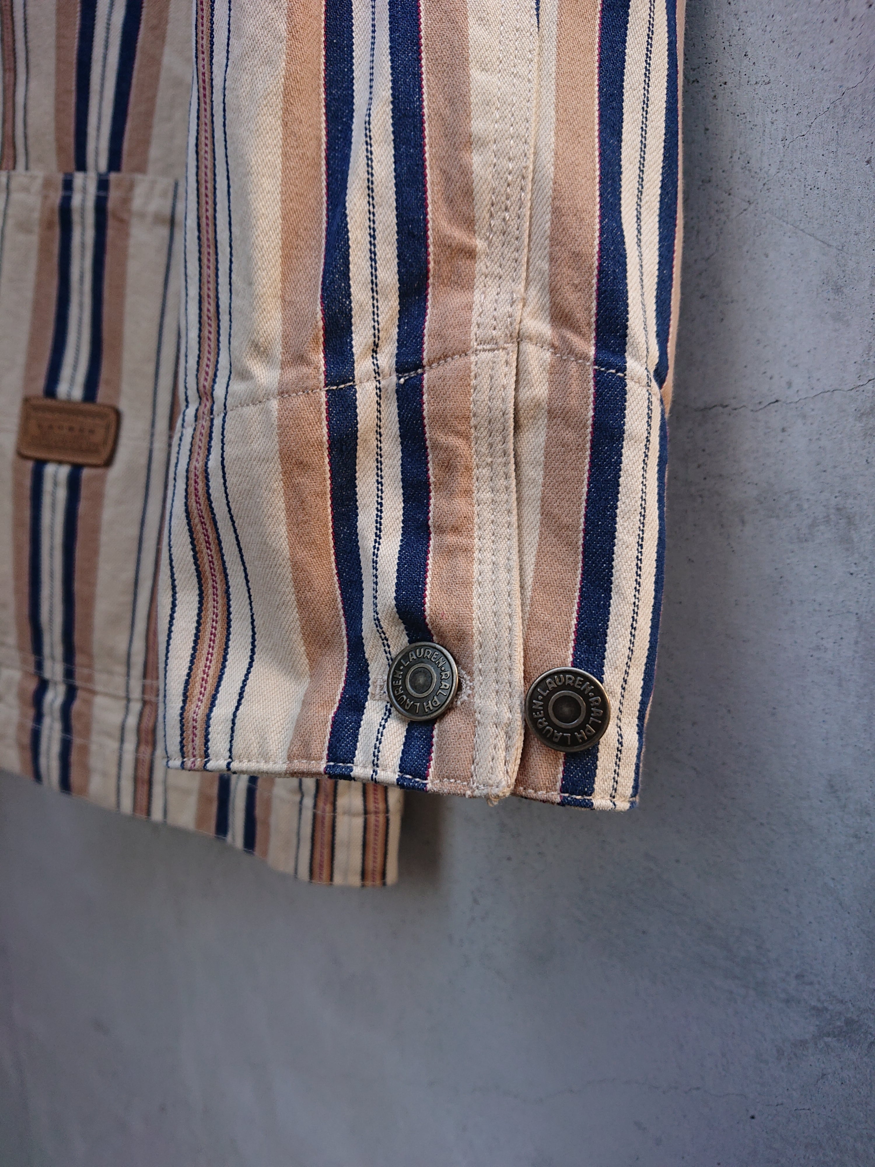 90年代 LAURENのストライプカバーオールになります。Ralph LaurenのレディースラインのLAUREN。前身ごろの合わせがレディースアイテムなので右上でメンズと逆になりますが、そこを気にならなければ全然男性の方に着ていただけるサイズ感とデザイン。襟部分はコーデュロイ使用。着用感はありますが致命的な傷等はございません。