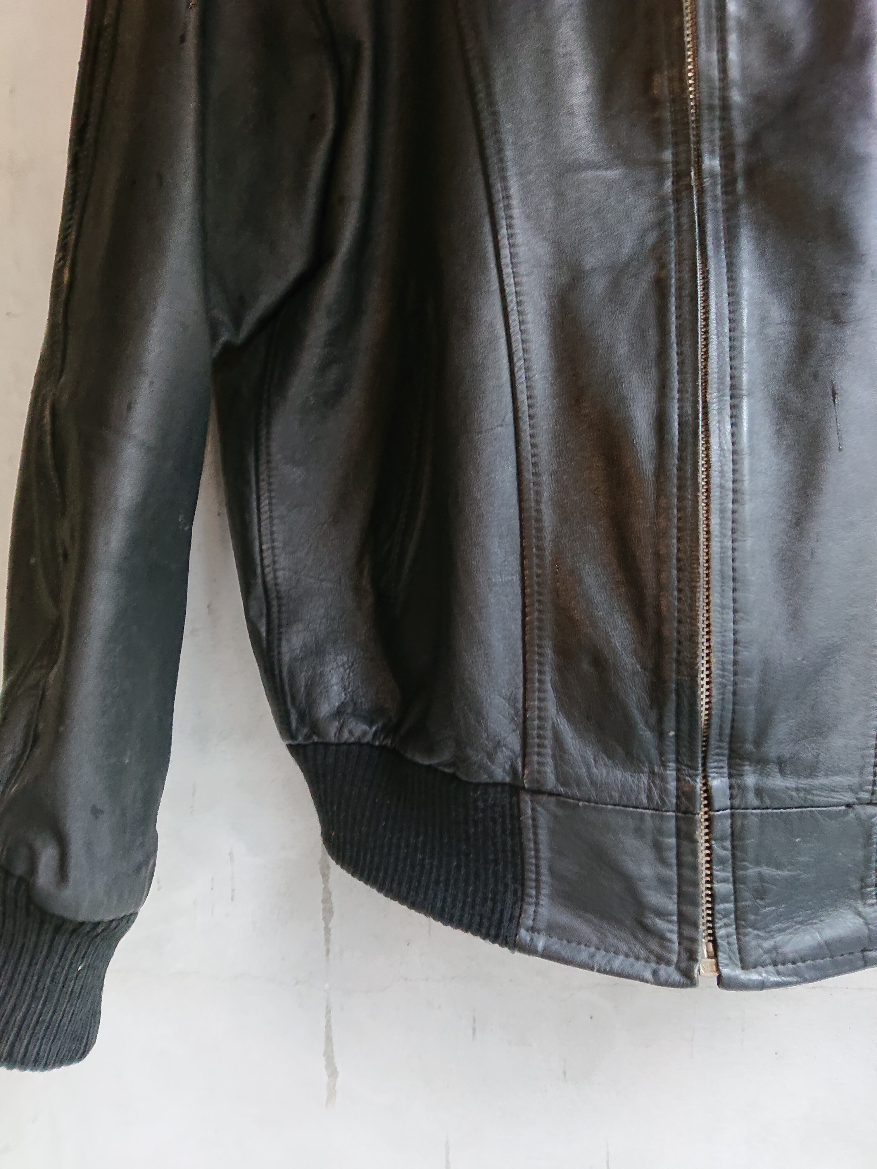 たち襟で袖口と裾がリブ仕様。80~90年代のレザージャケットには多く見られたデザインの1つかと思います。懐かしさも感じるレザージャケット。ネルの裏地が付きます。着用感ありますが致命的な傷等はありません。