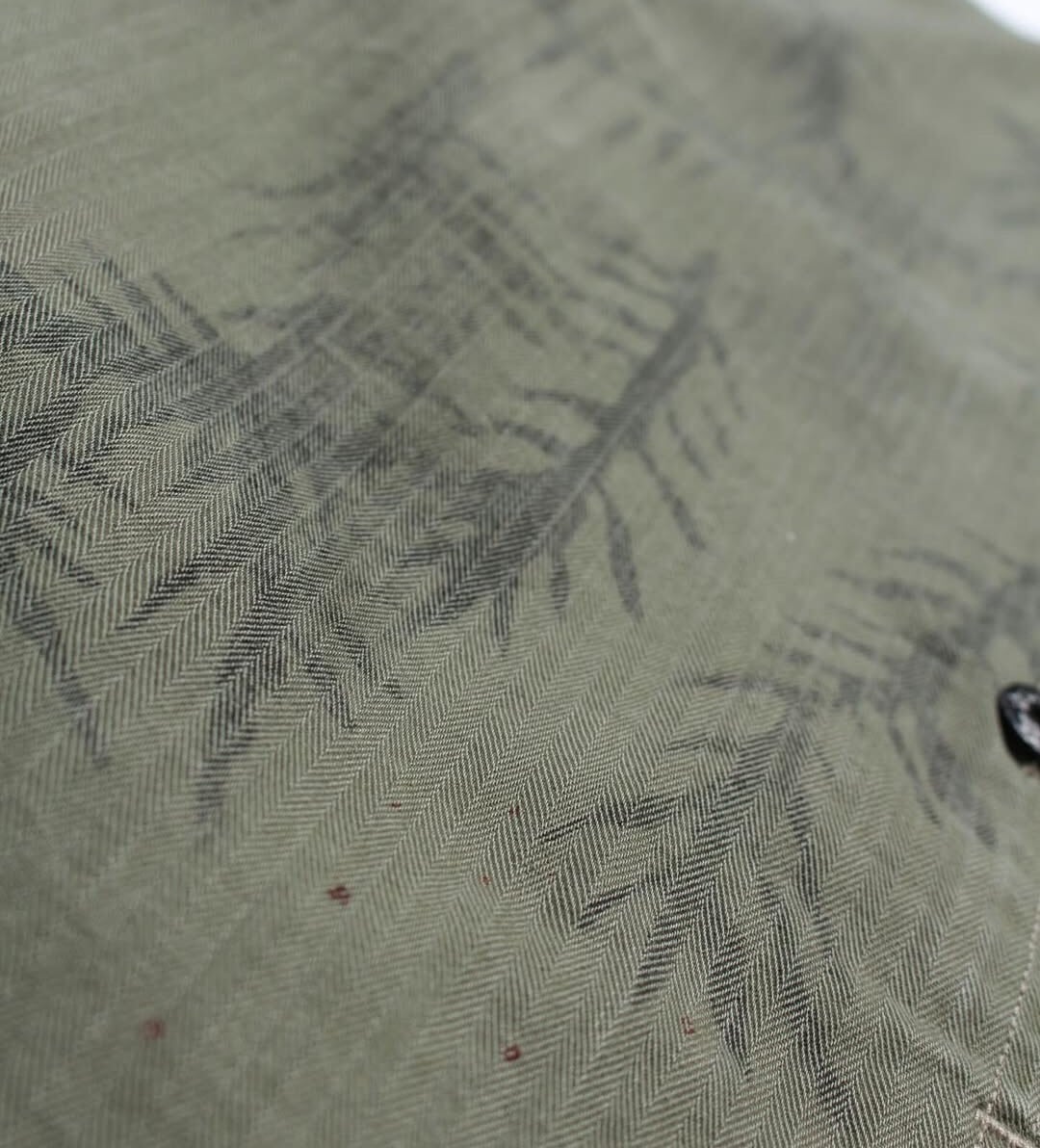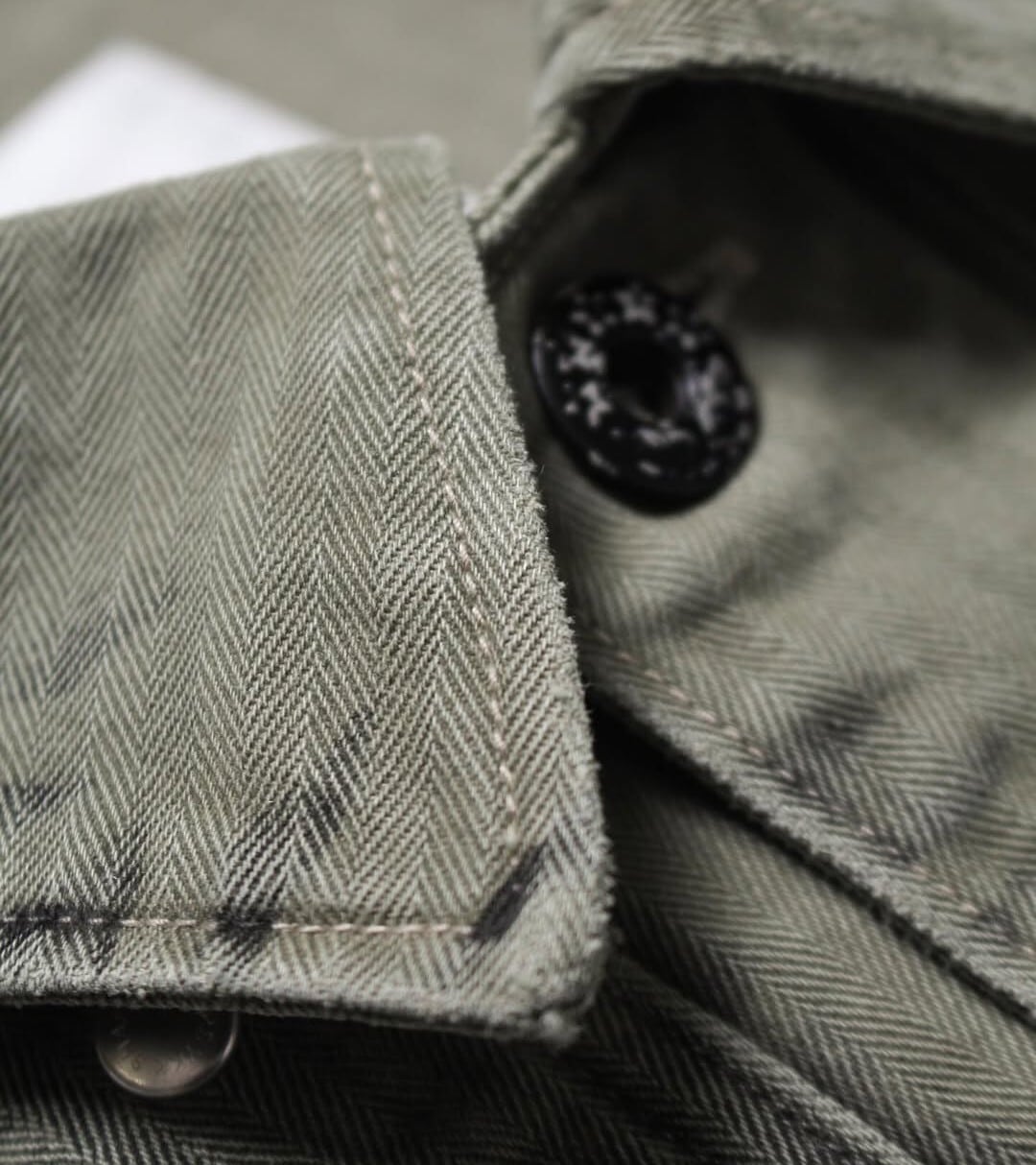 USMCに採用されたM-44ジャケットをベースに再構築。ロ米陸軍グリーンベレーがフィールドで用いたとされるハンドペイント迷彩を、塗料の乗りやインクムラ、色抜けまで含めて再現し、さらに着古しのフエード、擦れ、縫製のパッカリングまで追い込んだ加工で“戦地の空気感”を纏わせた一枚。ミリタリーの実用美を核に、現代ストリートで映える新しい力モフラージュを提案。