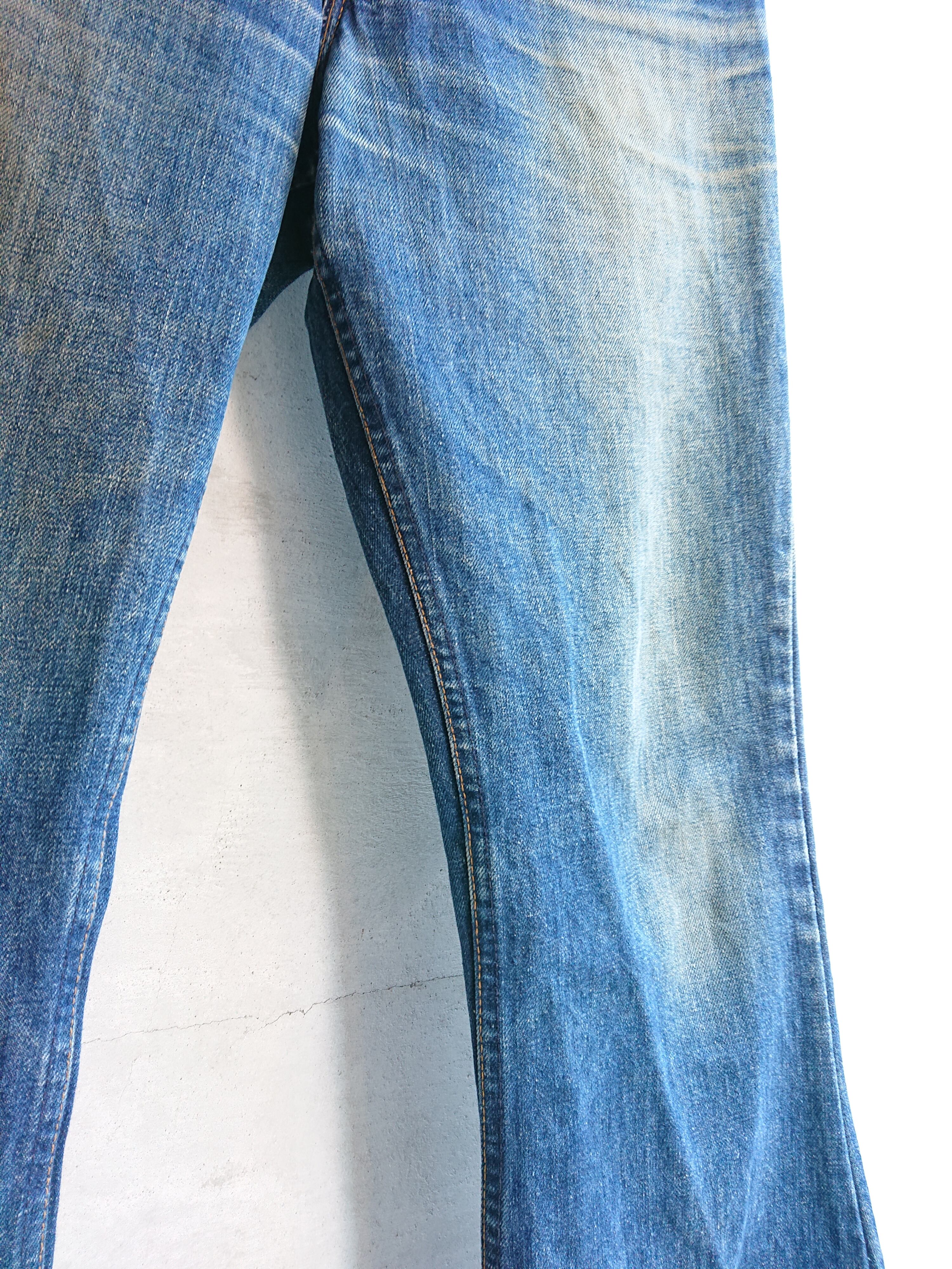 久しぶりの入荷となる646デニム。この一本がめちゃくちゃ良い色落ち!アタリもバッチリ出ております。写真より実物のほうが見た目、雰囲気共に男前です。ダメージはなく、裾は直されています。昨今フレアーデニムをお探しの方が増えてきております。サイズ合うかたに是非オススメしたい1本です。ボタン裏刻印23。