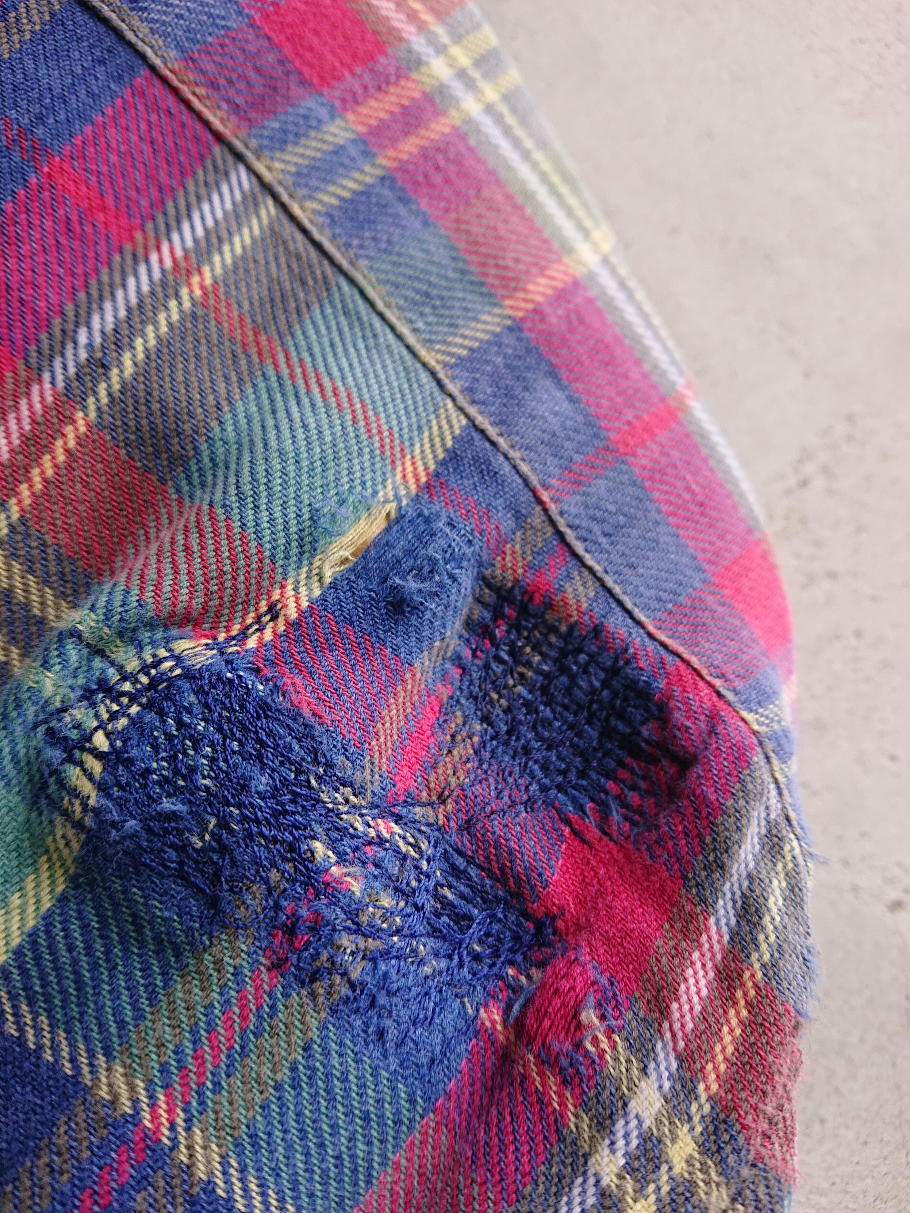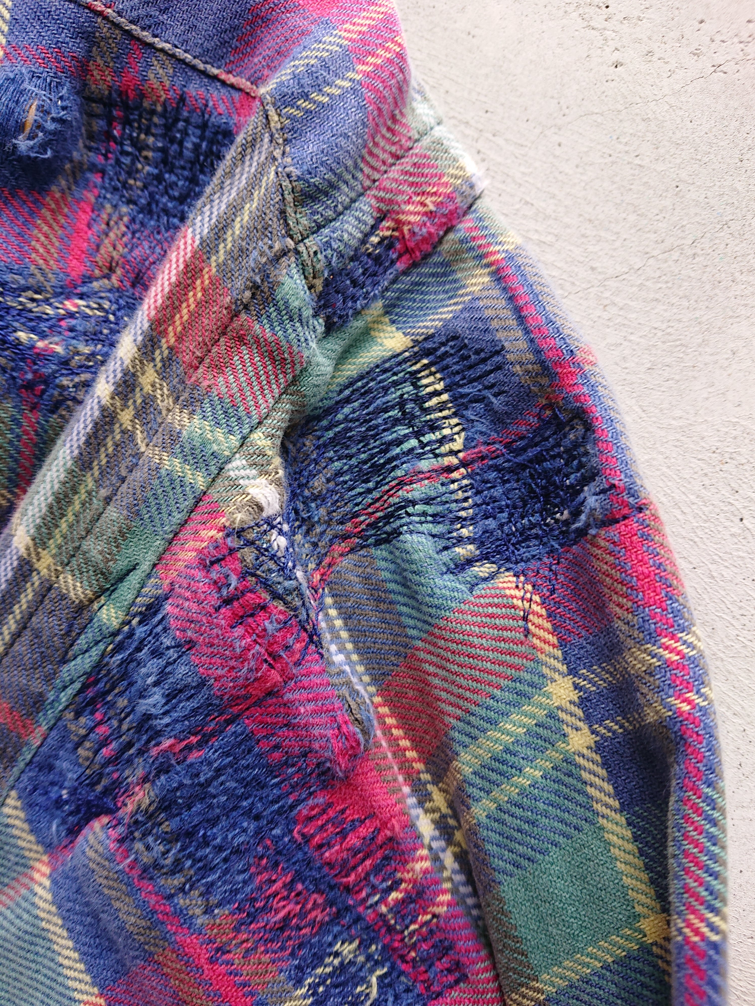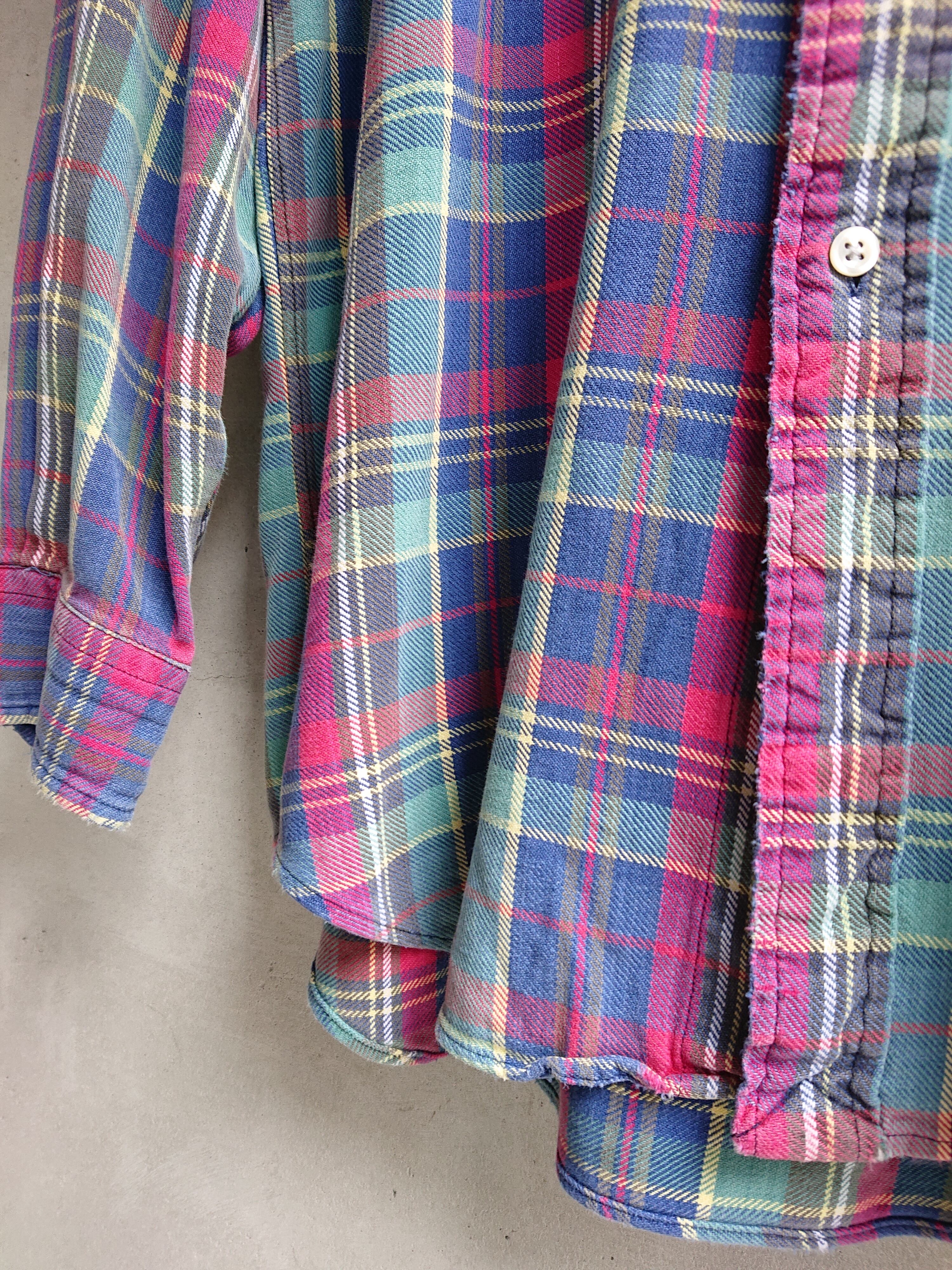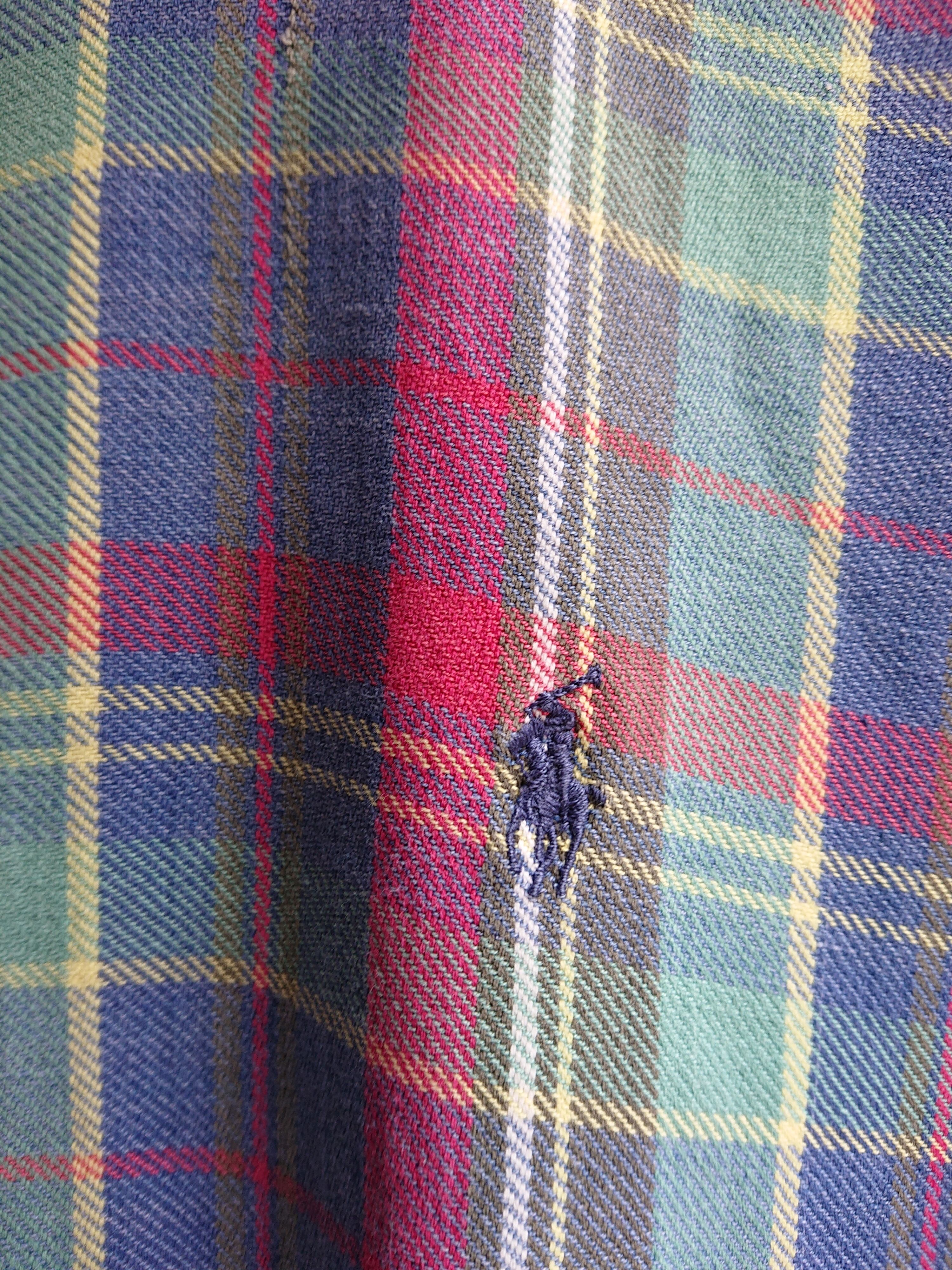 Ralph Laurenのボタンダウンのフランネルシャツになります。ソフトで肌触りのいいフランネルで、このシャツの魅力は雰囲気!!全体的の色褪せに襟部分や裾、袖口の擦れと右肩のリペア箇所。チェックのボタンダウンでこの感じがたまらなく大好きなポイント。共感してくれた方いかがでしょうか。