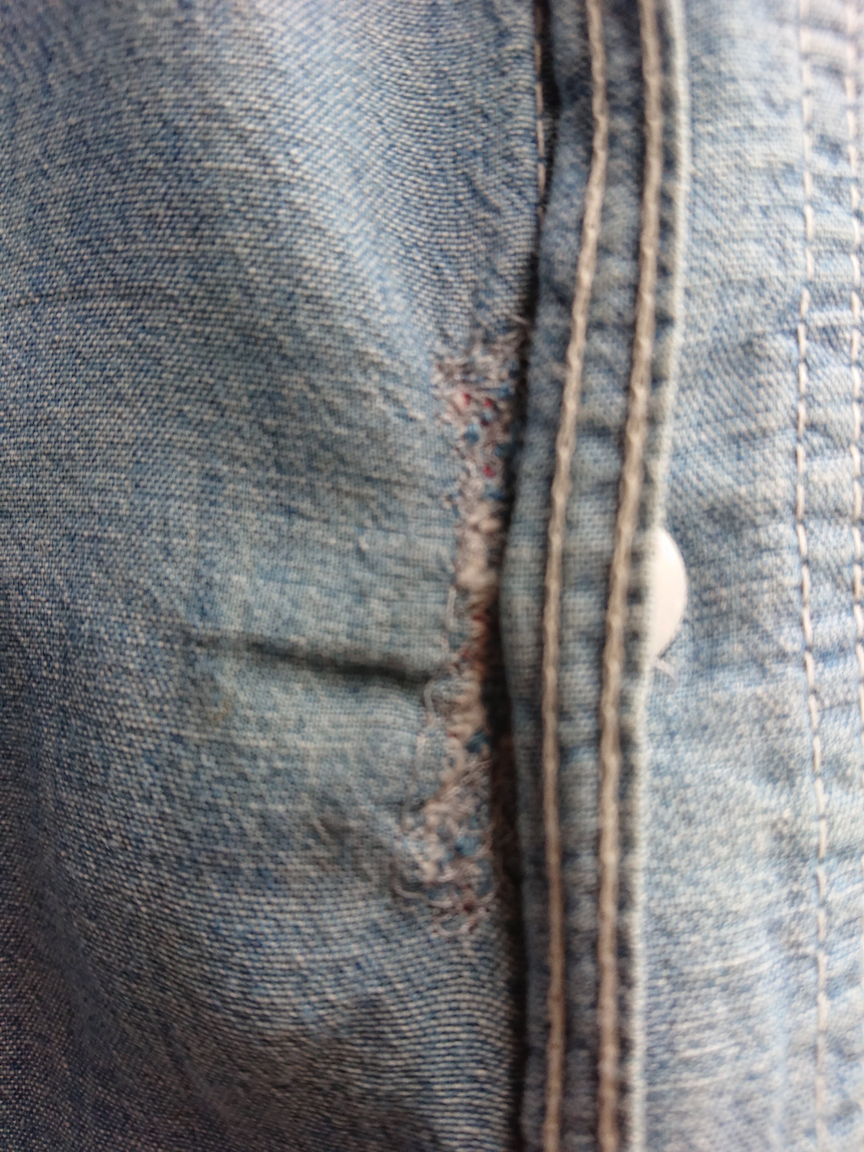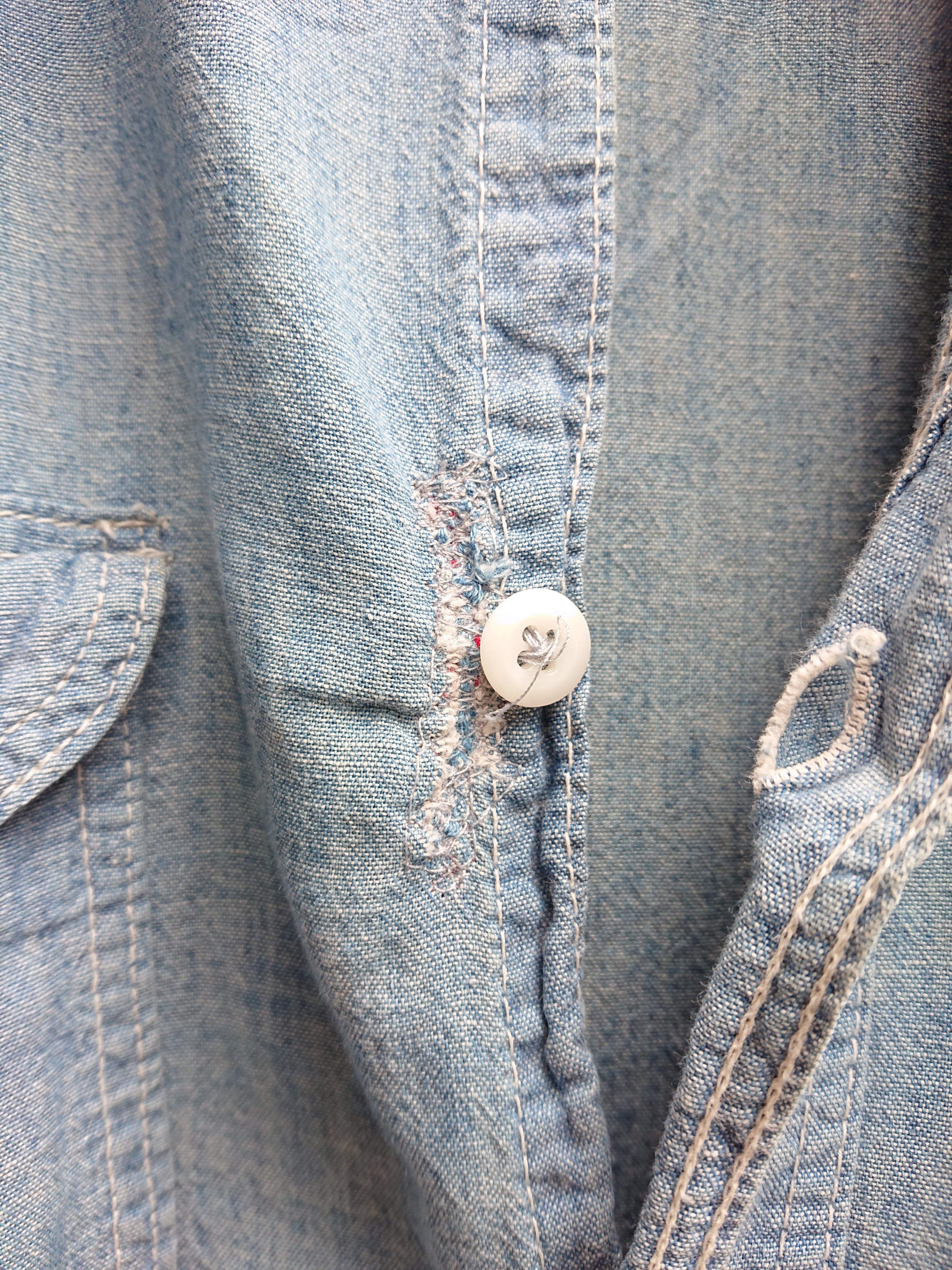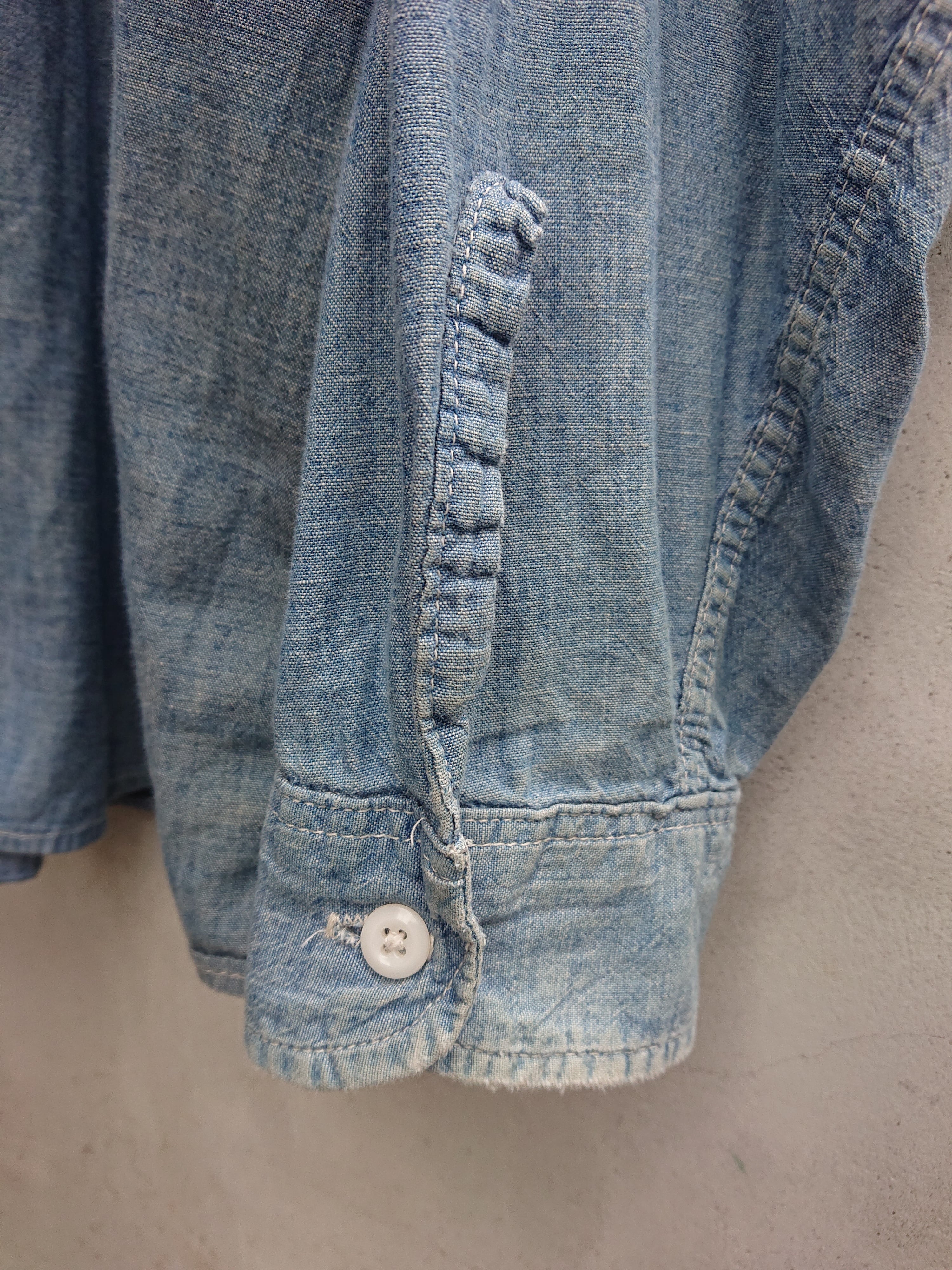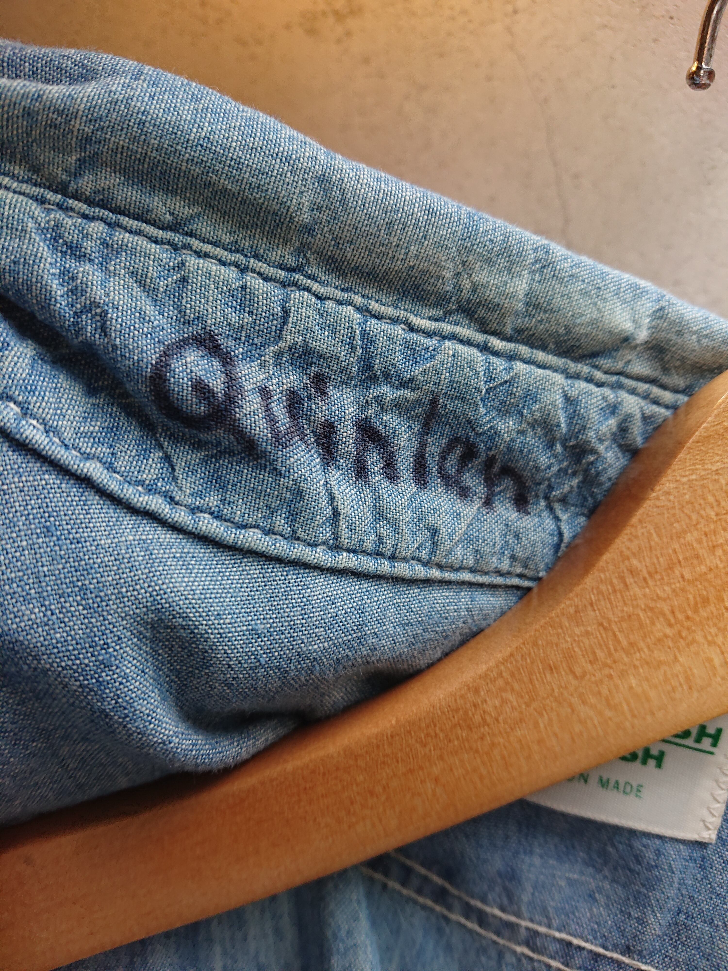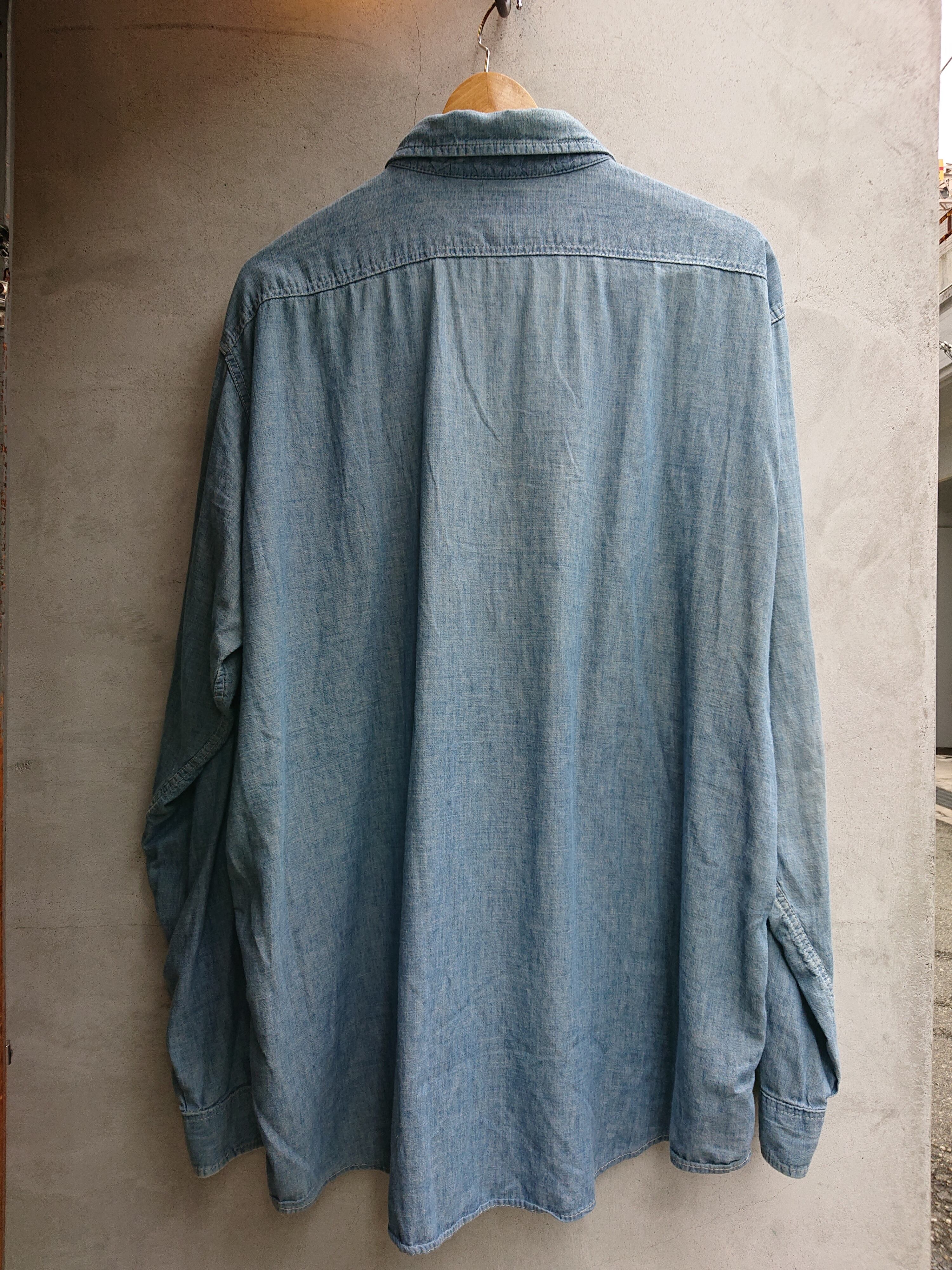 1970年代 OSHKOSH B'GOSHのシャンブレーシャツになります。17Hと大きめなサイズ感。ざっくり羽織るの丁度良いかなと思います。COTTON 100%のタイプ。フロントボタンの上から3個目横にリペア箇所がありますが着用に問題はありません。一着あると重宝するシャンブレーシャツ。気になった方いかがでしょうか。