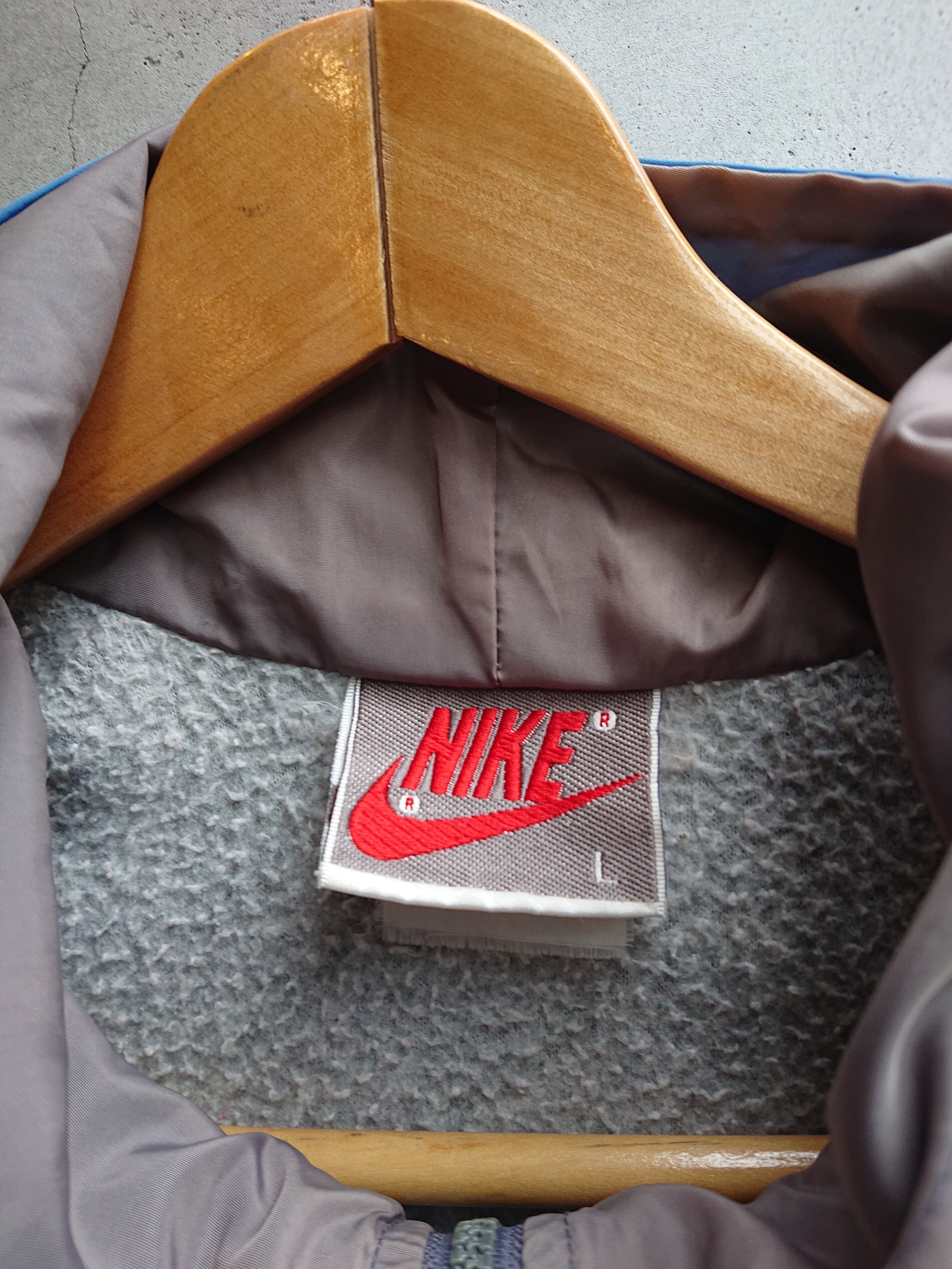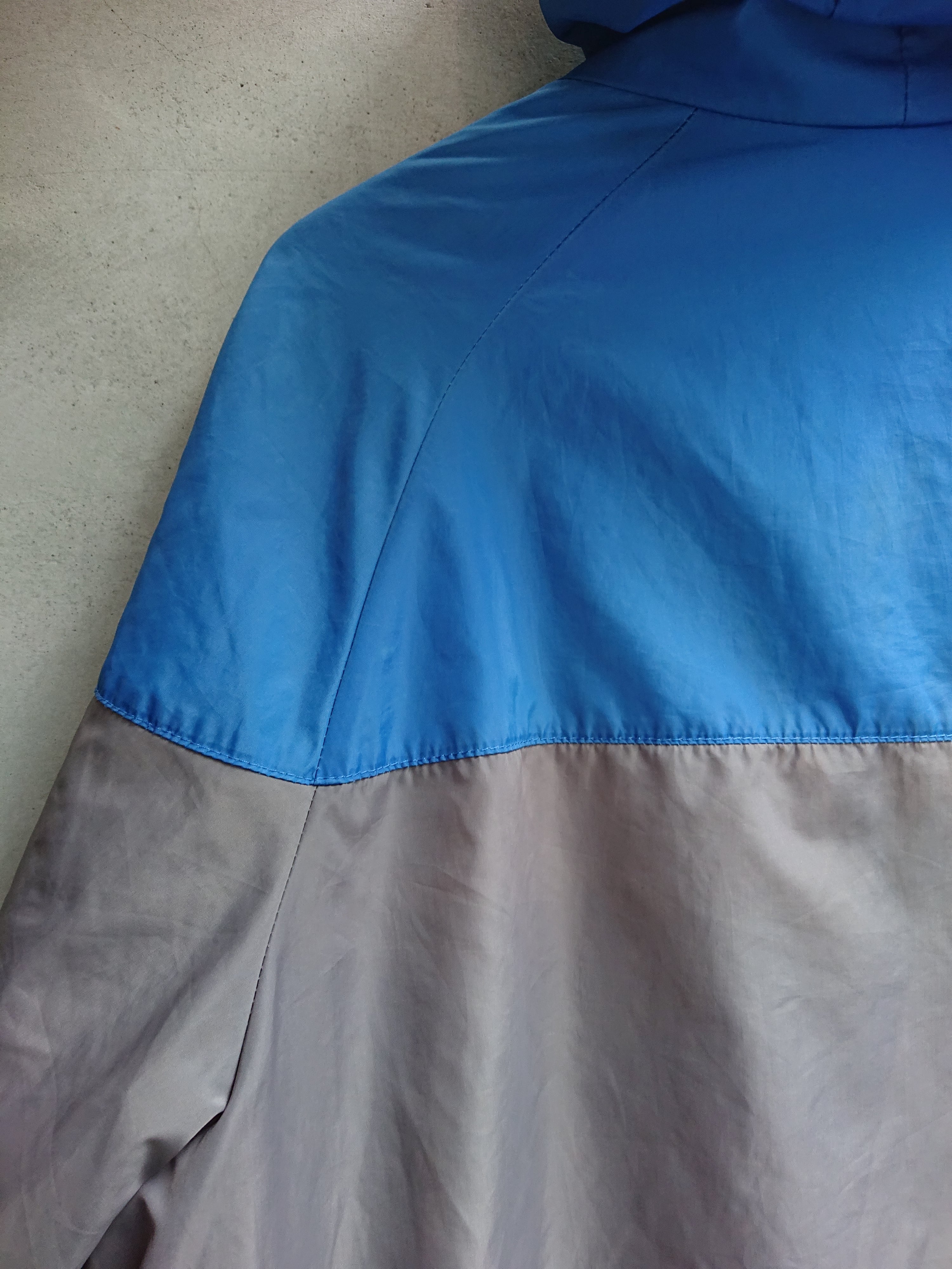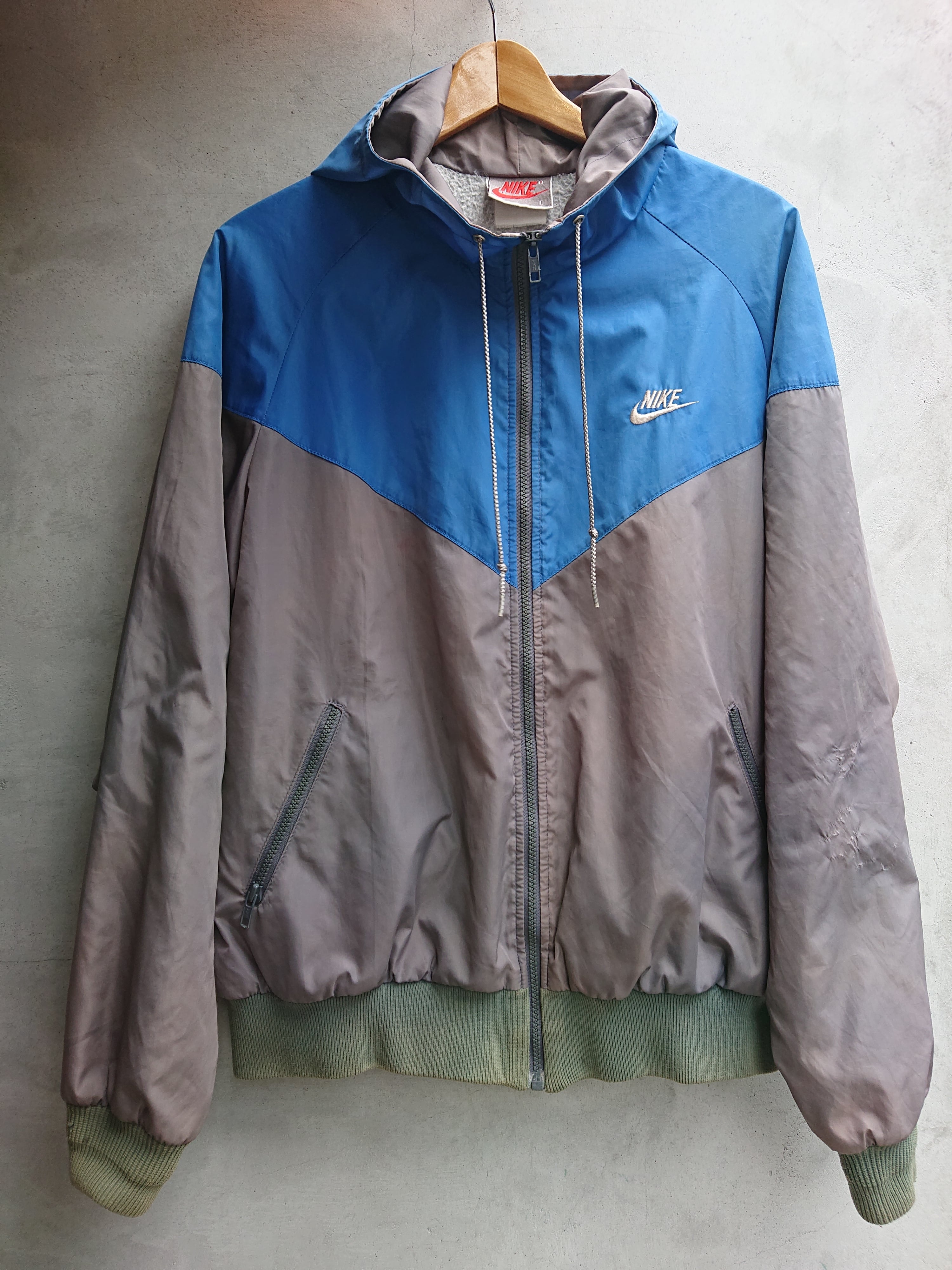 フード付きでブルーとグレーの切り替え。ヴィンテージ ナイキらしい配色。裏地付きで袖口と裾はリブ仕様。リブの色褪せと穴はあいてないですが左腕にベール傷みたいなのがあります。