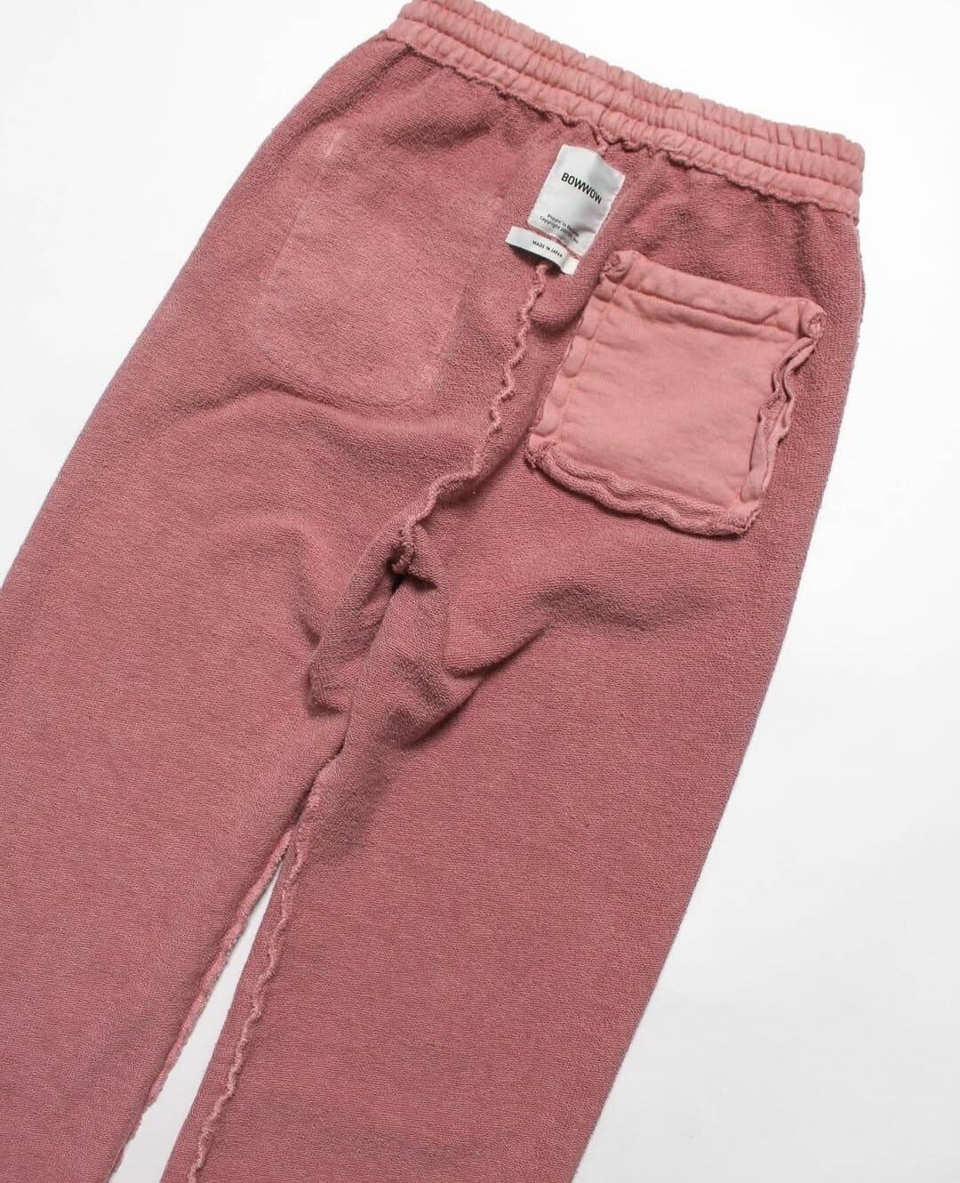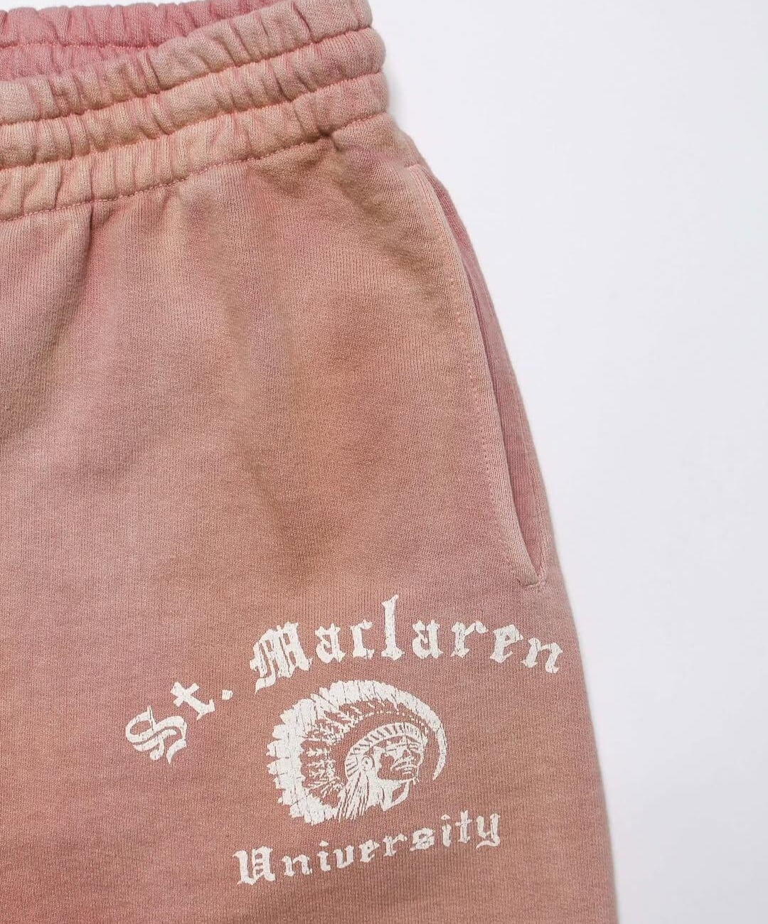 架空の大学 ST.MACLAREN UNIV. のキャンパスライフから着想を得たスウェットパンツ。ロボディにはパーカーと同じ、色褪せたピンクの裏毛スウェット生地を採用。長年の着用で生まれた退色や生地の柔らかさを加工で再現し、当時の学生たちが履き込んだかのようなリアルな佇まいを表現。ロ両サイドには使い勝手の良いスラッシュポケット、バックにはスクールライフの実用を意識したパッチポケットを配置。BOW WOW T定番のフィッティングで、セットアップはもちろん単品でも存在感を放つ。