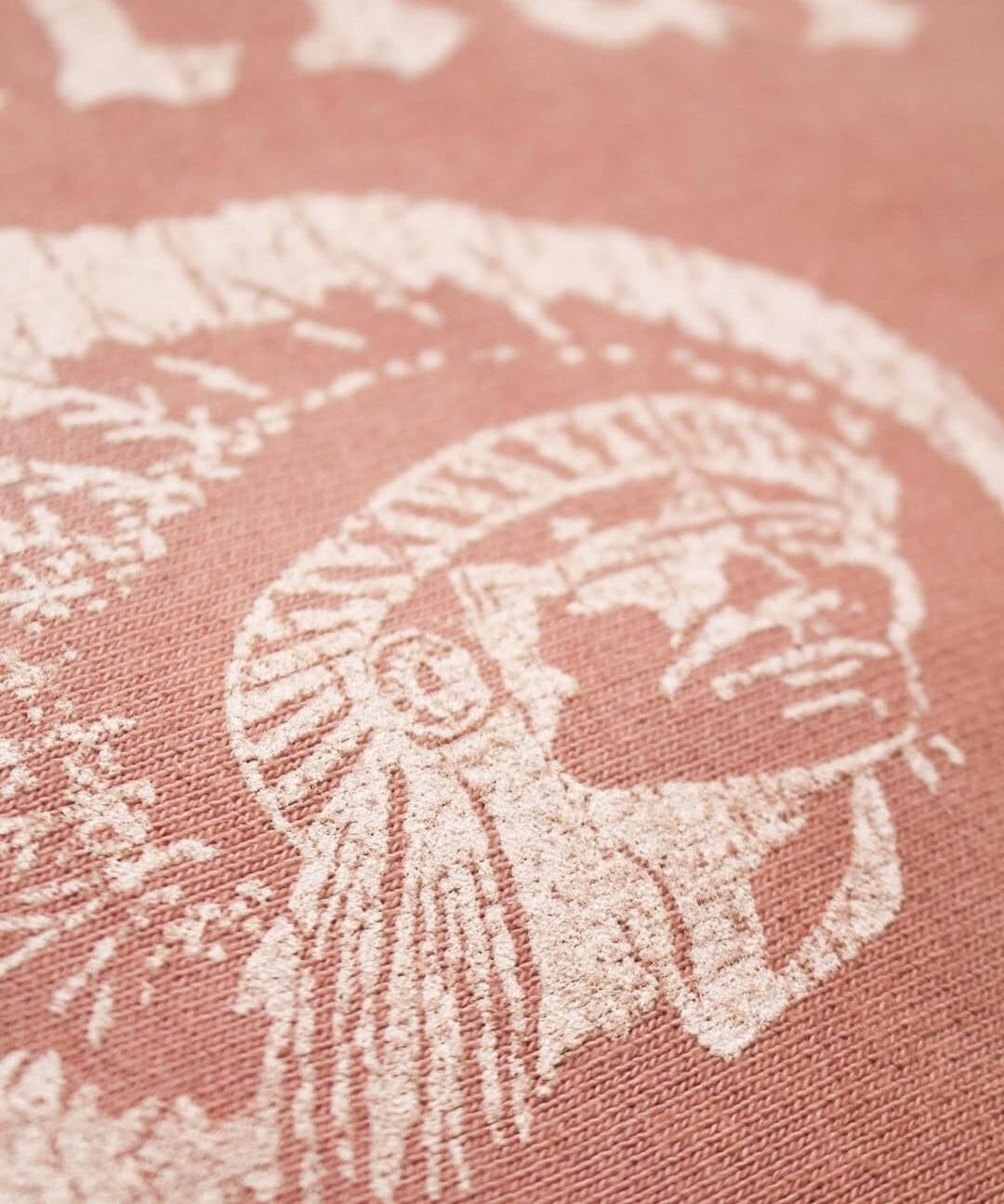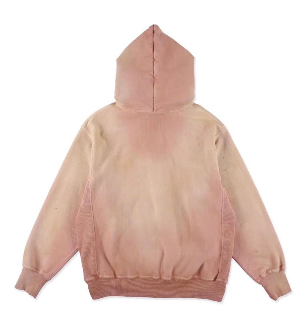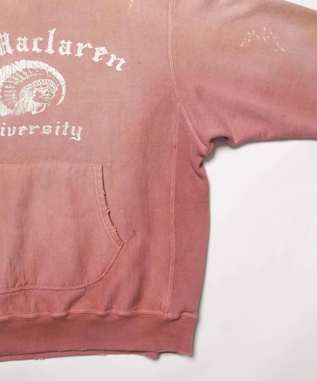 架空の大学 ST.MACLAREN UNIV. からの着想にて製作したスウェットパーカー。ロスクールシンボルであるインディアンヘッドをフロントにプリントで表現。プリントは使い込むうちに自然と掠れたような質感を加工で再現し、ヴィンテージさながらの存在感を引き出している。ロボディには色褪せたピンクの裏毛スウェットを採用。長年の着用による退色や縮み、柔らかな生地の落ち感を再現し、まるで学生時代から愛用し続けたかのような佇まいに仕上げた。ロセットアップのスタジャンやクルースウェットとは異なるアプローチで、同じスクールスピリットを表現。BOW WOWらしい色遊びとリアルな経年表現が光る一着。