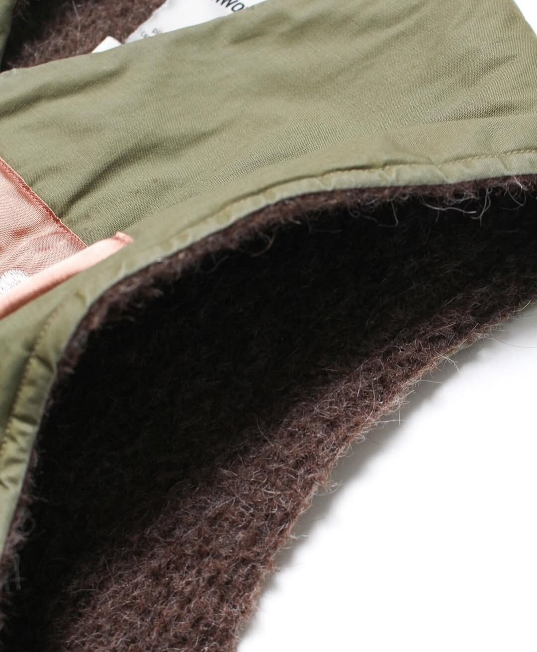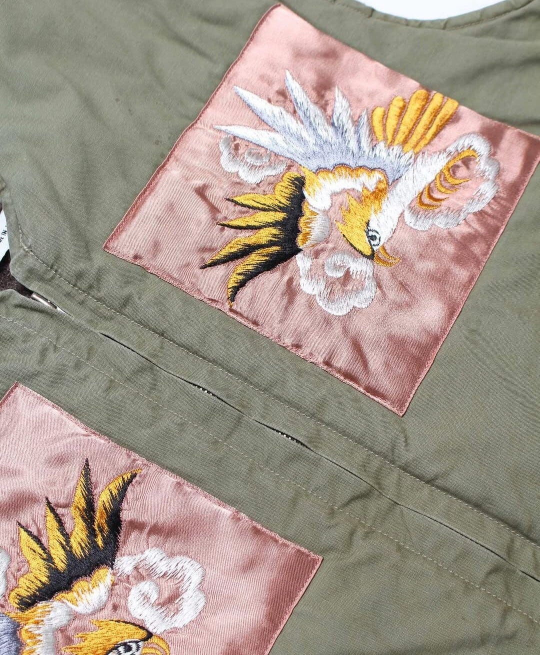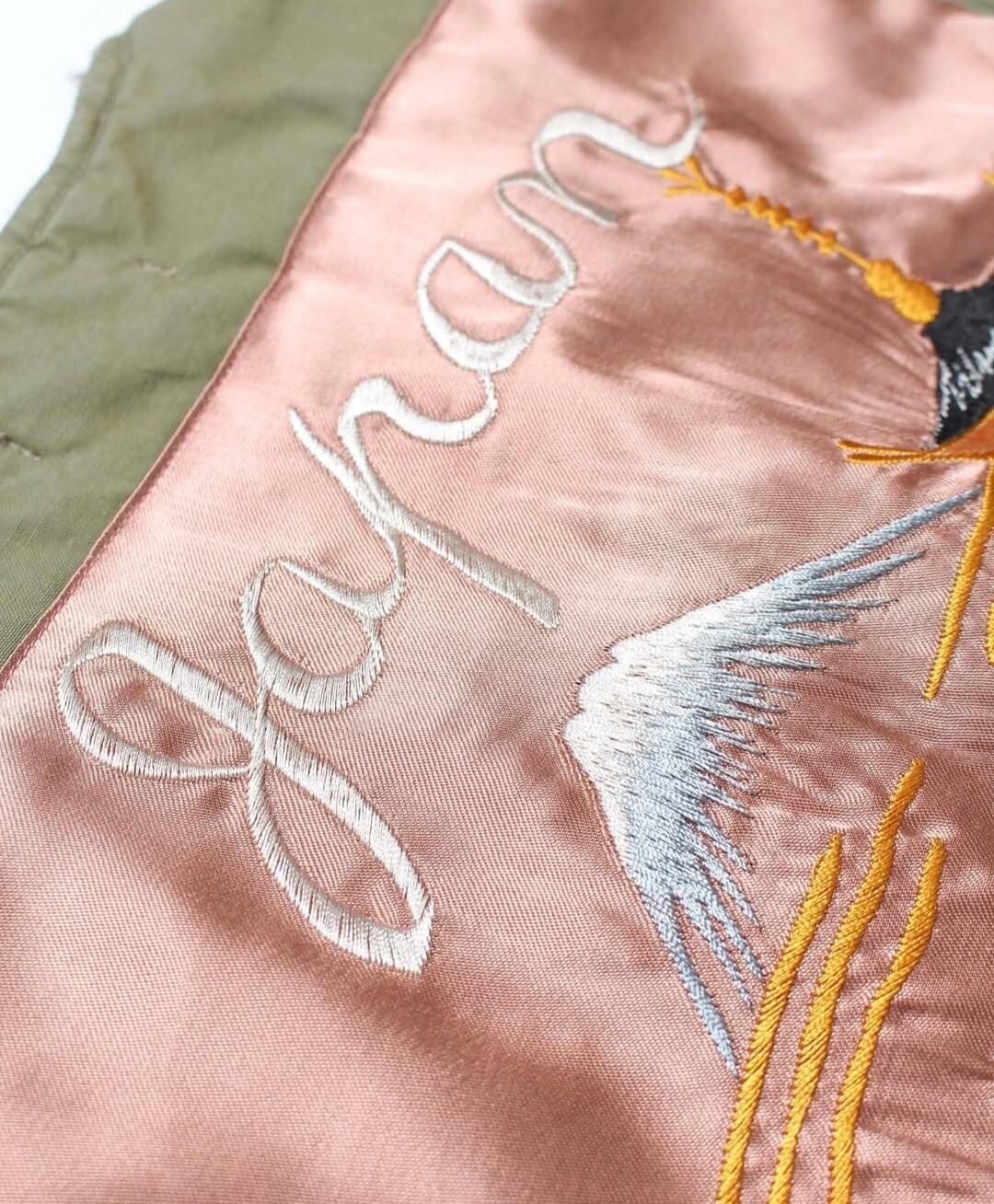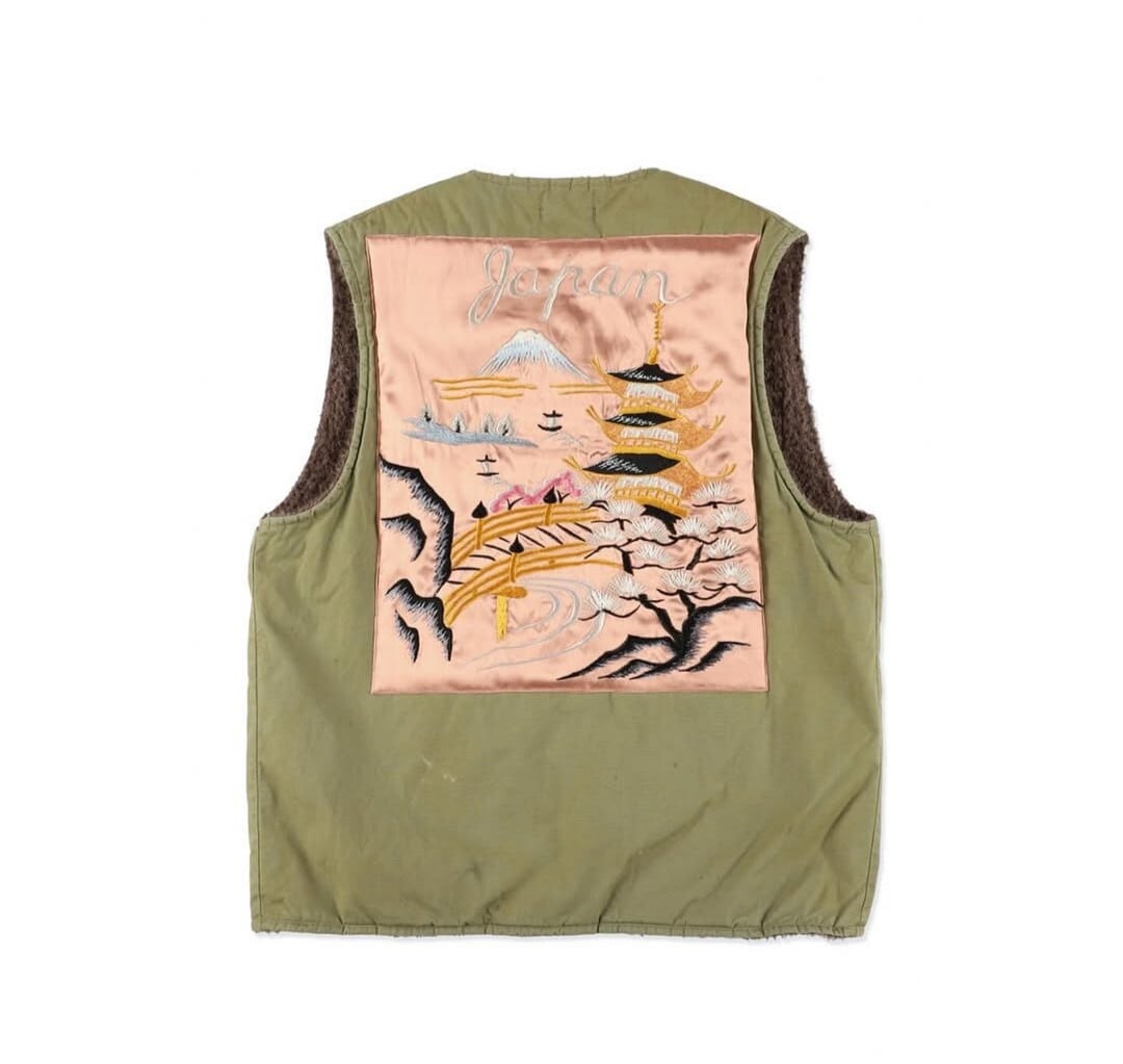 40年代にUSNで採用されたアルパカボアライニングのデッキベストをデザインの出発点に、BOW WOW は“そこで終わらせない”。当時、日本に出向いた兵士が土産のスカジャンから刺繍を切り出し、私物のベストへ縫い付けた――そんな物語を設定し、レーヨン刺繍パーツの艶と糸の経年差、ベスト単体で着倒された汚れ・擦れまでリアルに再現。ミリタリーとスーベニアの記憶が交差する一着は、50年代が生んだ“着るアート”をいまに映す。