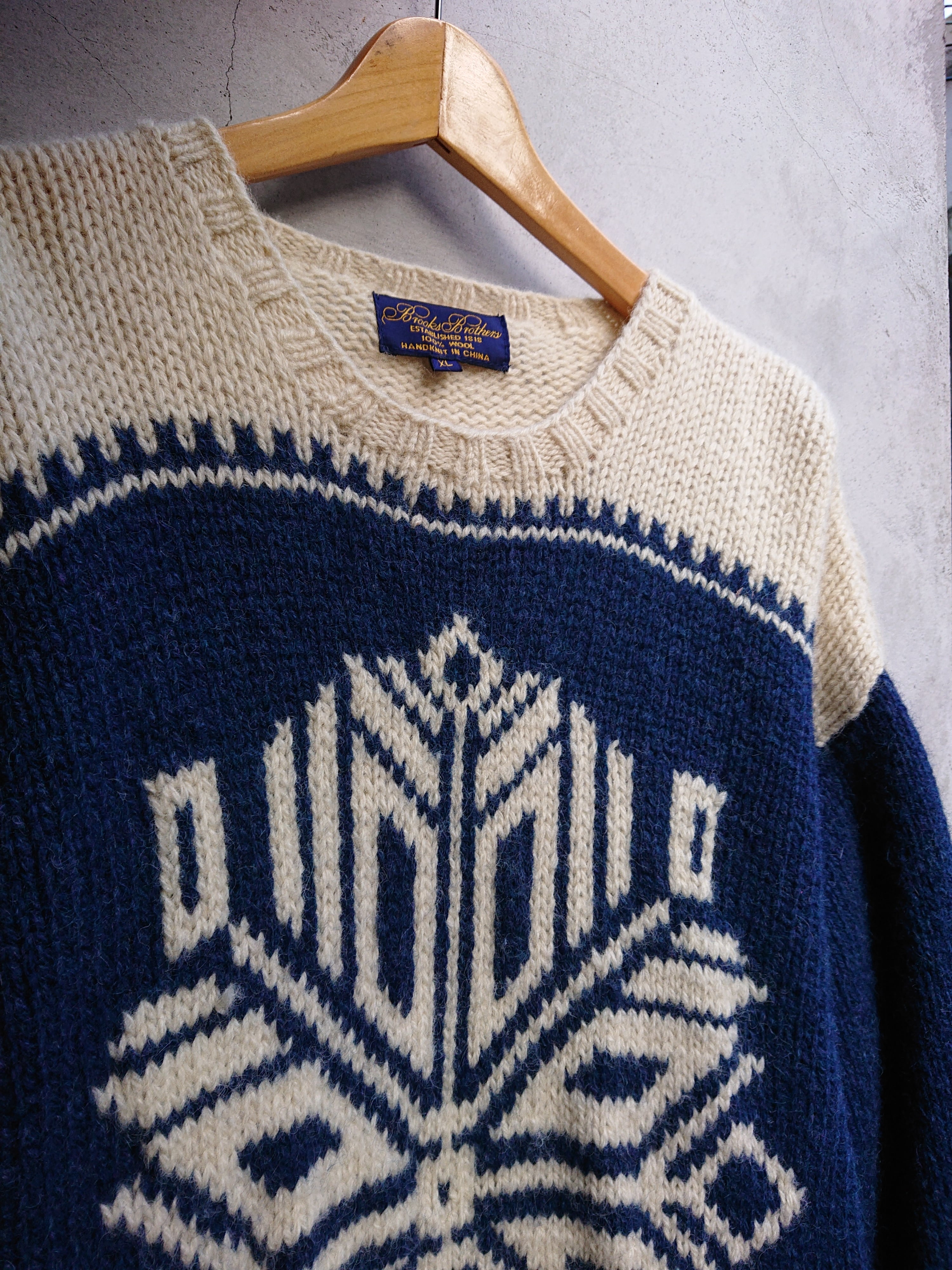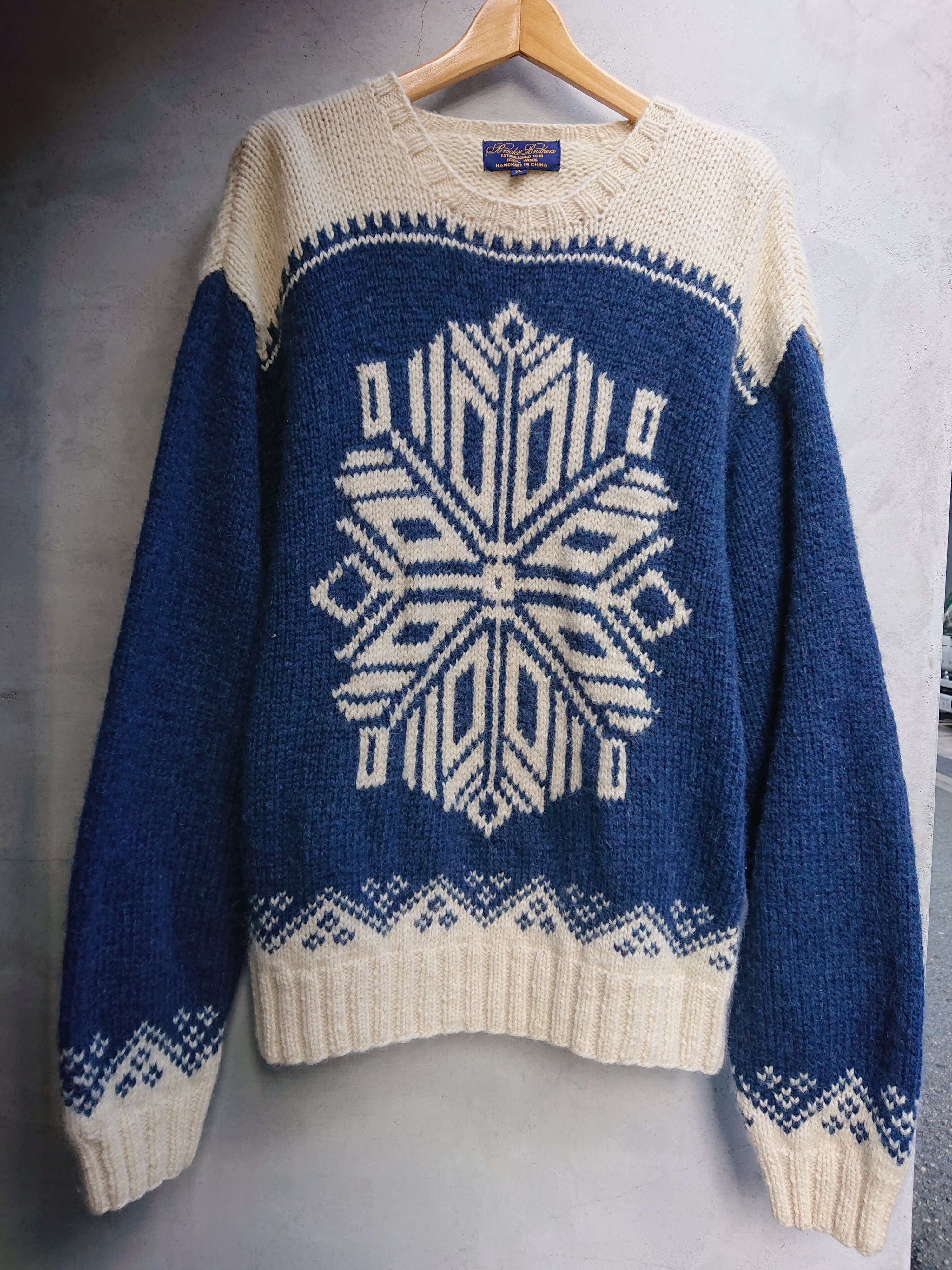 Brooks Brothersの雪柄ハンドニットになります。ホワイト×ブルーの配色。 コンディション、サイズ共に良く秋冬に向けてオススメなセーターになります。着用感少なく致命的な傷等はありません。WOOL 100%。