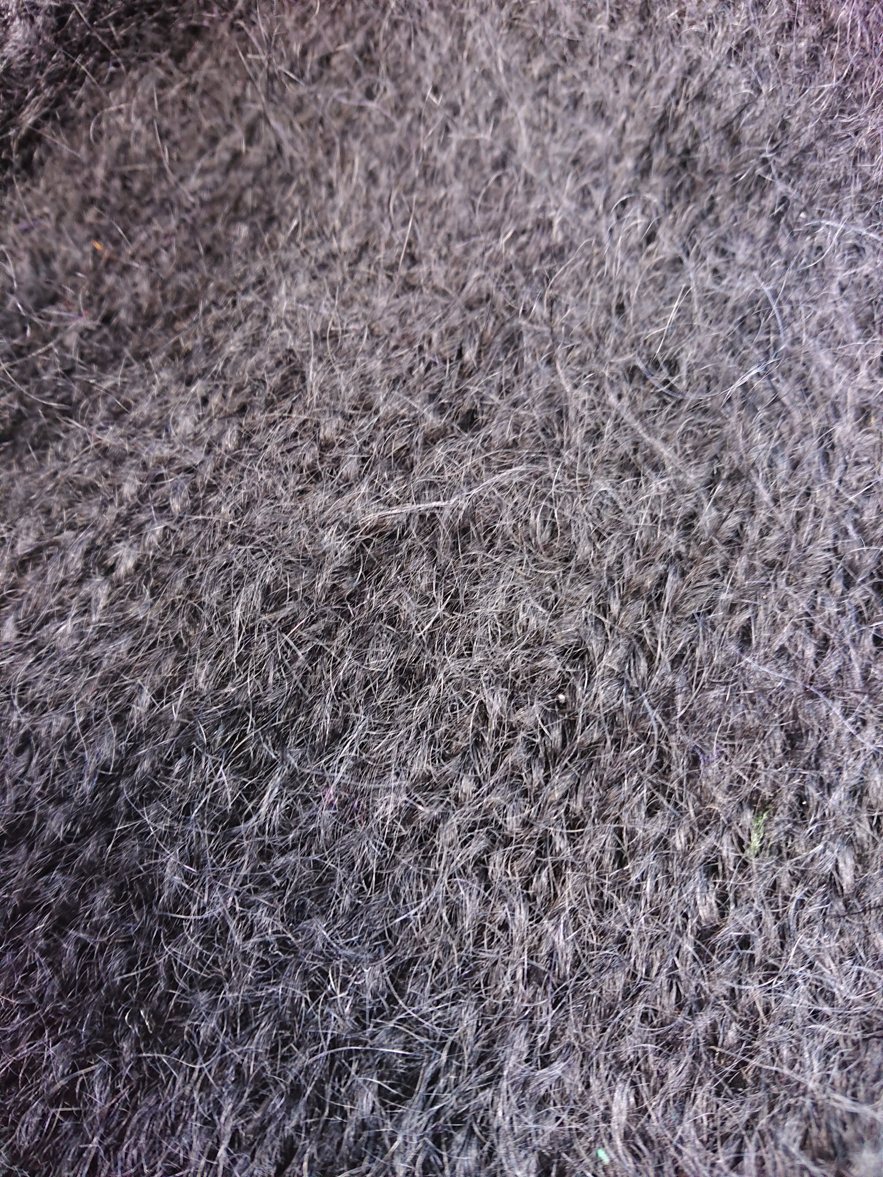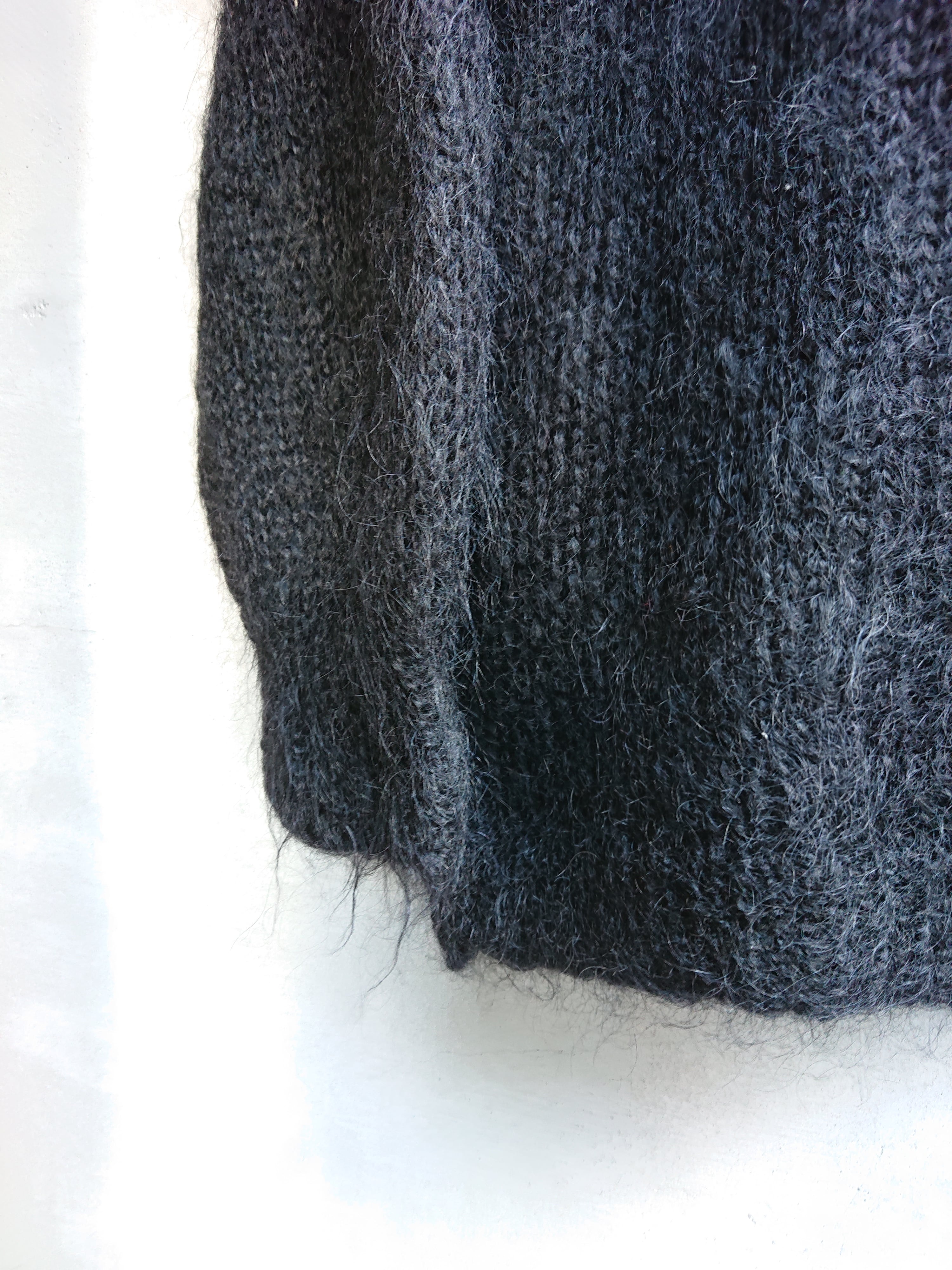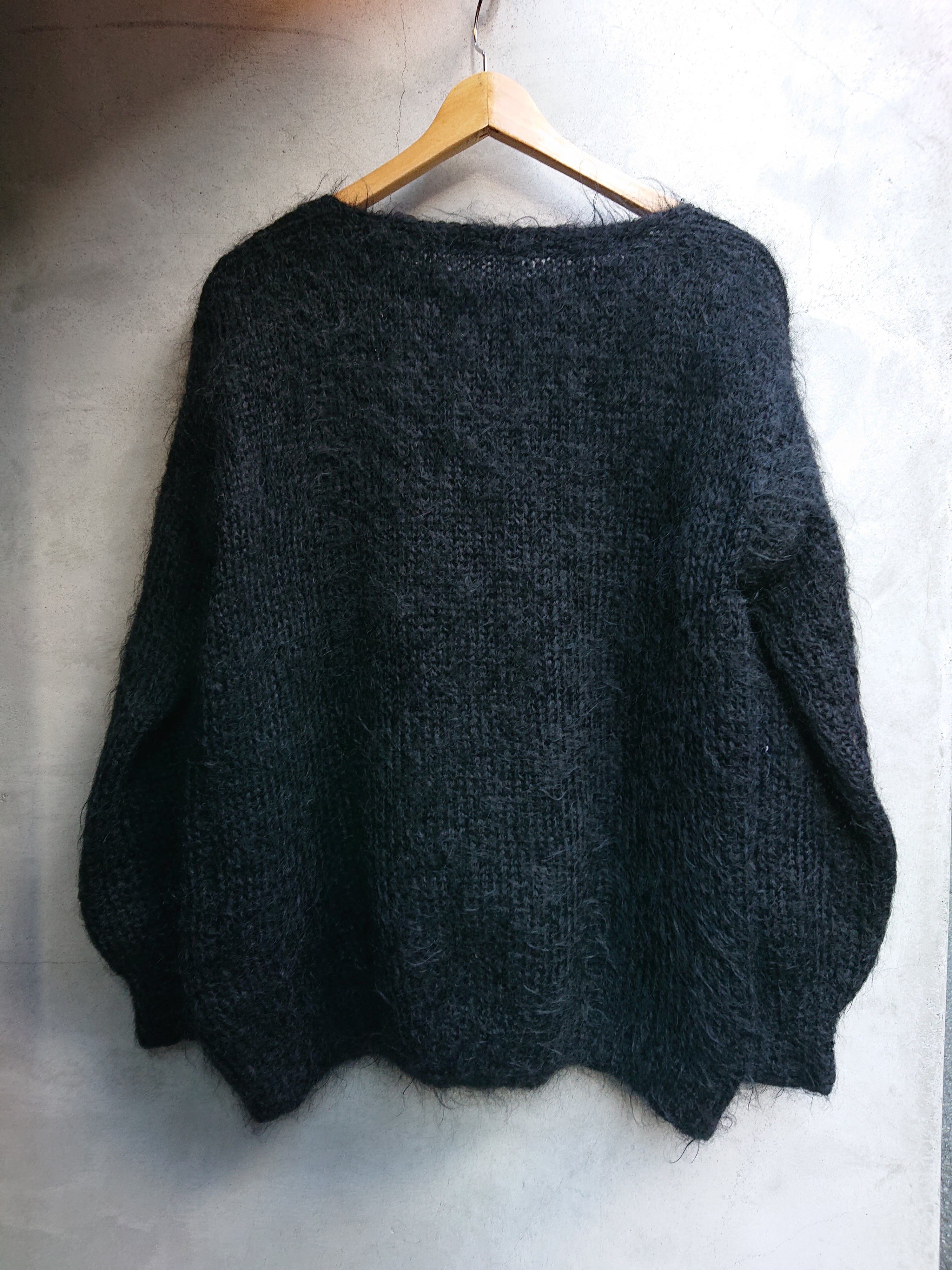 タグ等はついてないので年代、ブランド等不明。ボートネックのような首まわり。毛足は長め。昨今入手しずらいブラックモヘア。サイズ的に男女共にオススメしたい1着。