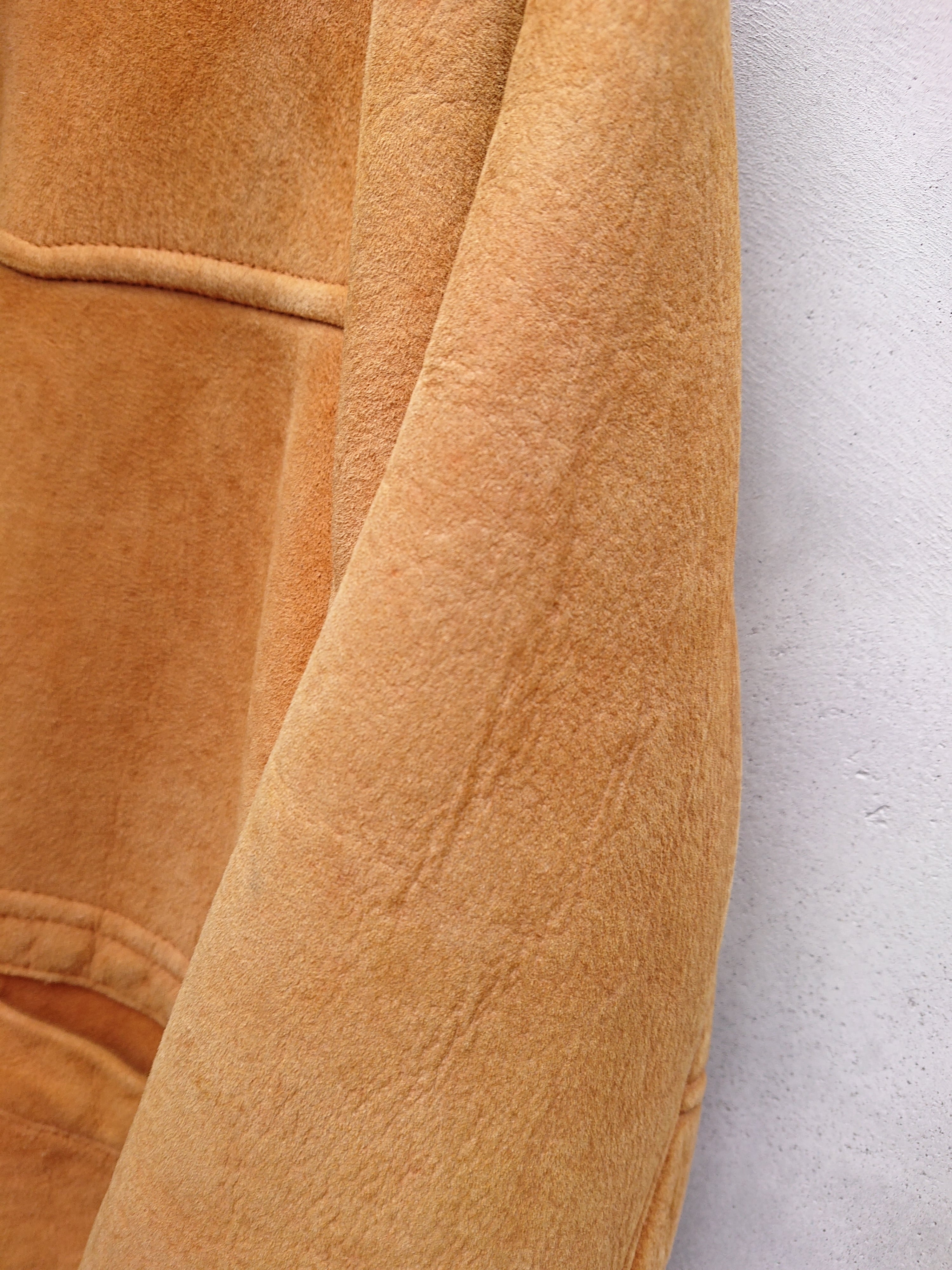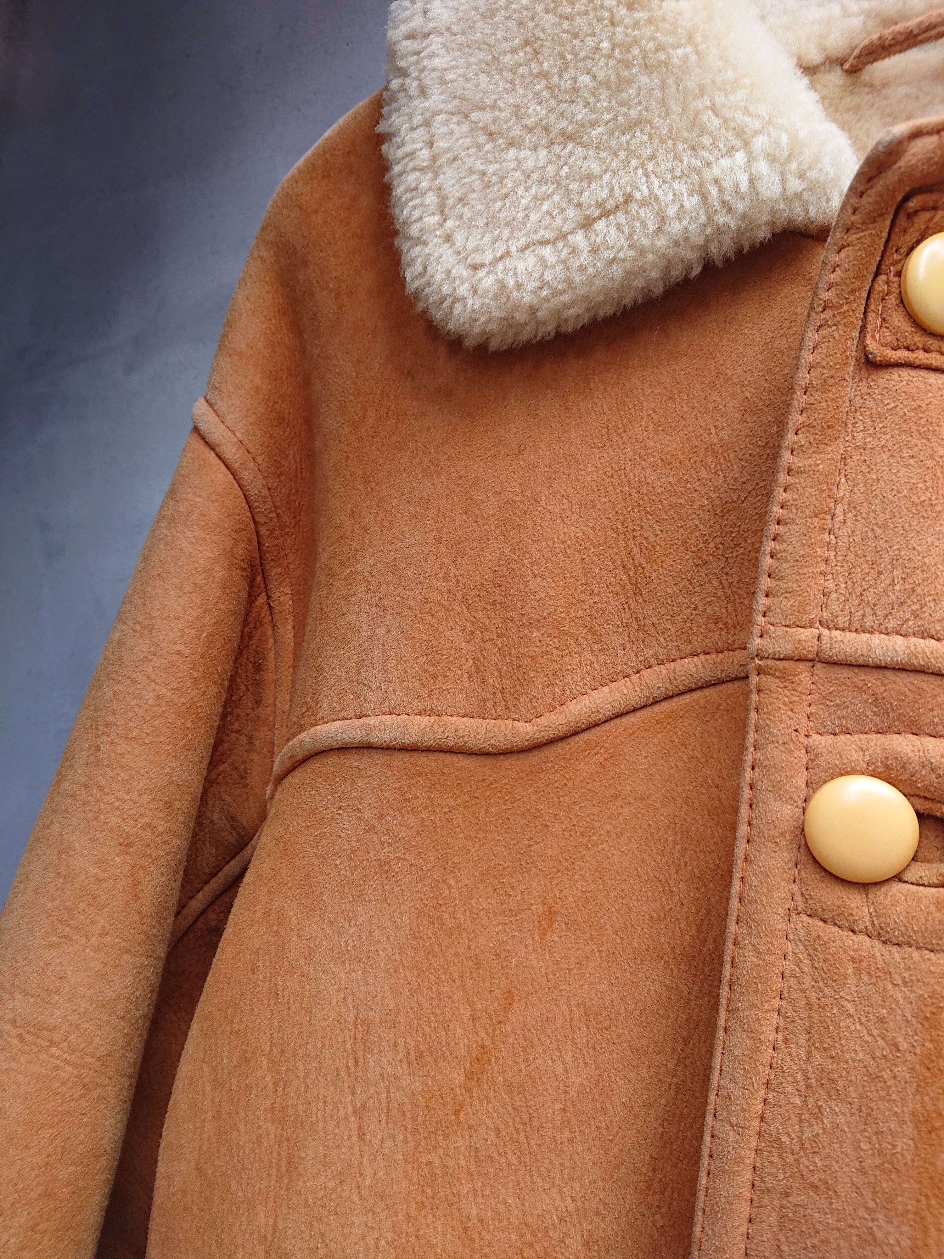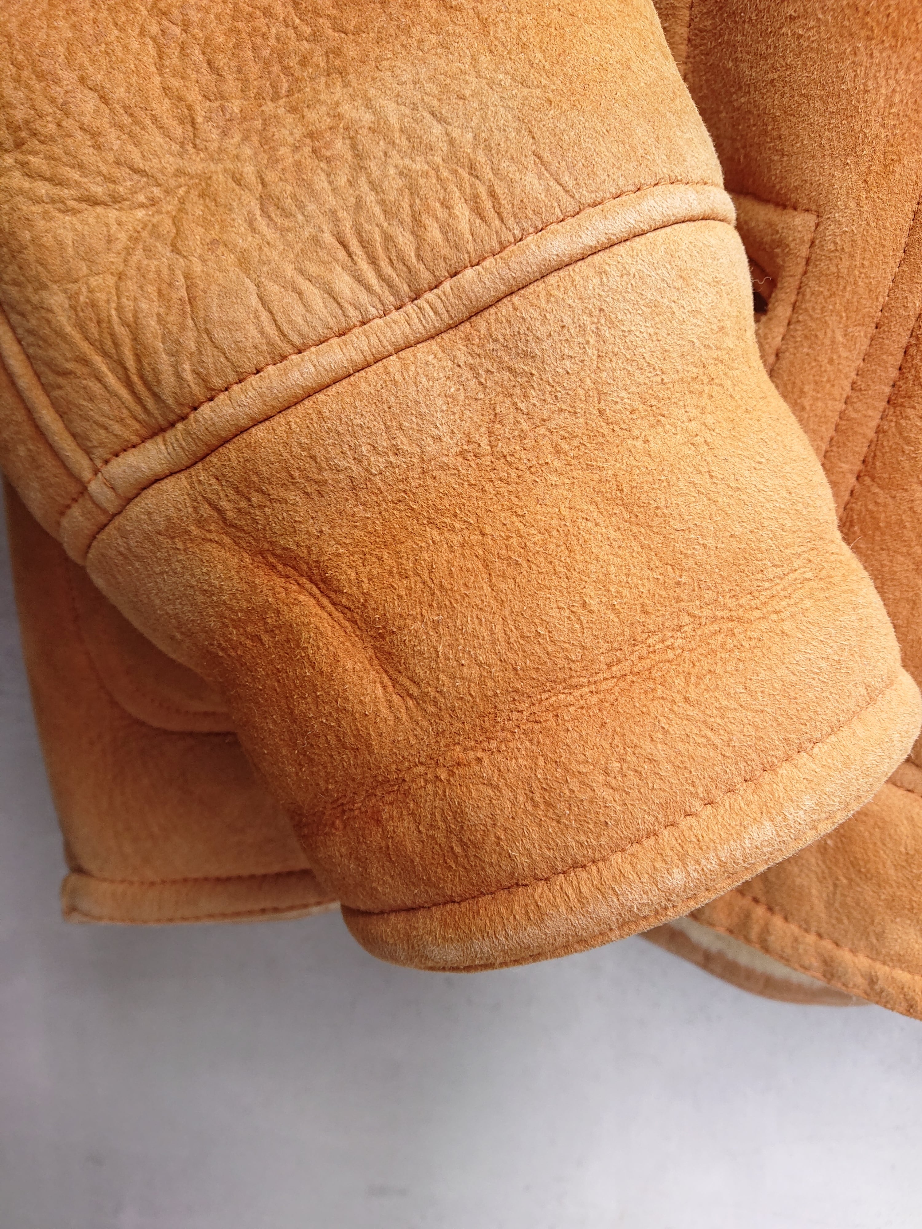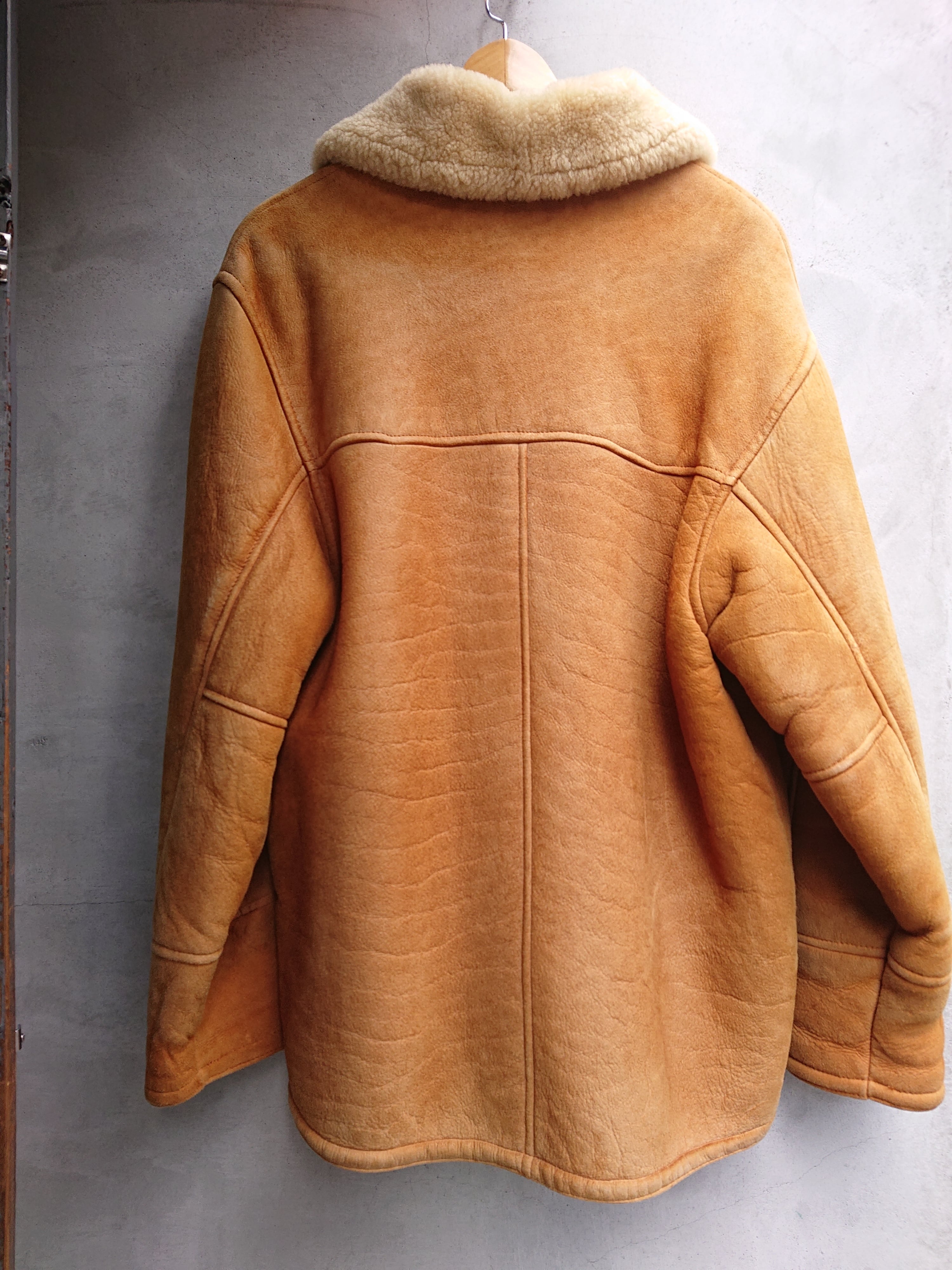 1980年代頃のWind Armorのムートンジャケットになります。ランチコートのようなデザインでフロントのヨークデザインにイエローボタンが映えます。ヤレ感あるムートンは男くささも感じ、イエローボタンなので見た目の可愛いさもプラス。着用感ありますが致命的な傷等はありません。