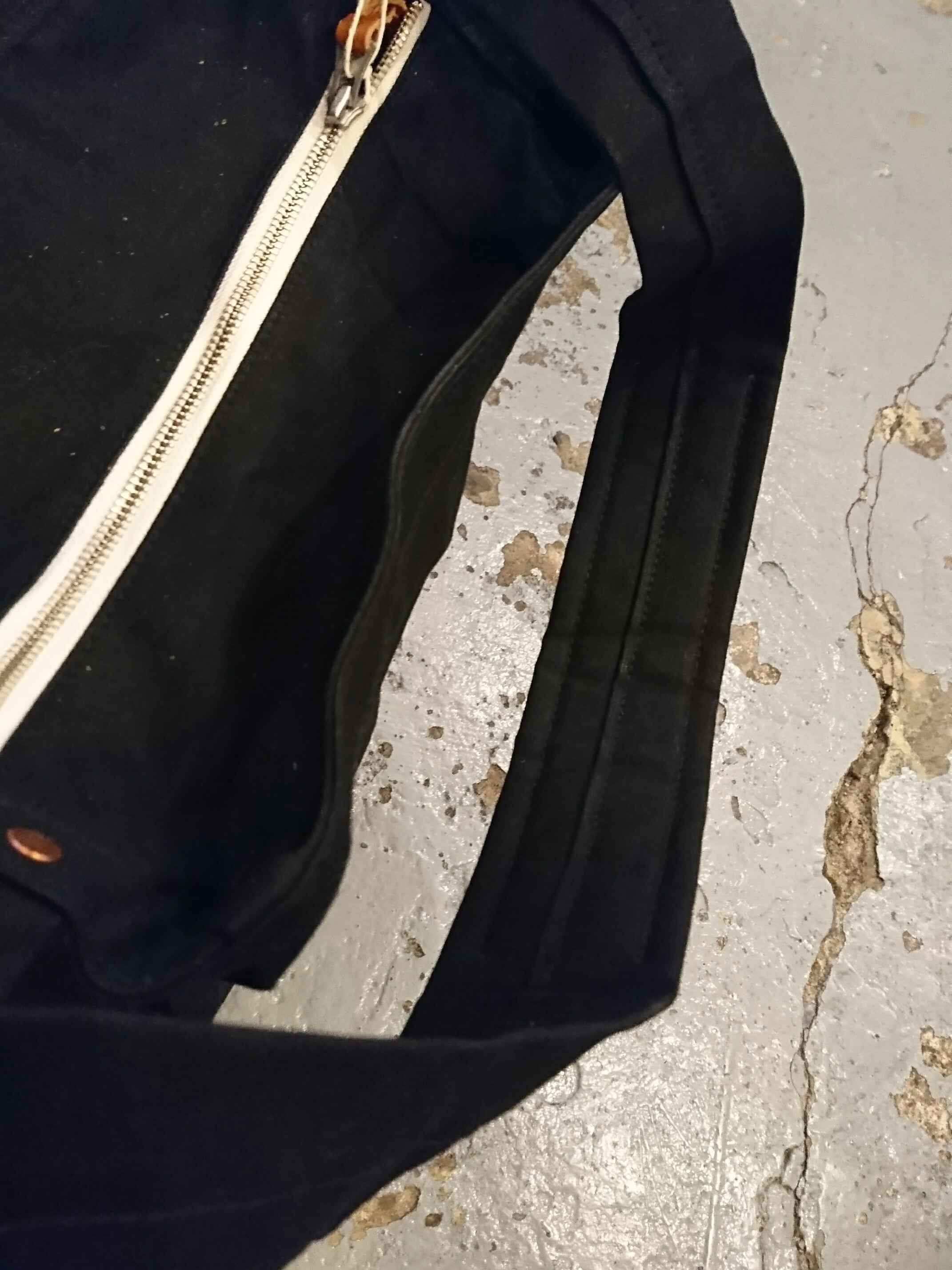 キャンバスを使用。使い始めはパラフィンの独特のにおい、生地が固く感じますがどちらも使うごとに無くなってきます。使っていくうちに味わいが増してきデニム同様使って育てていってほしい