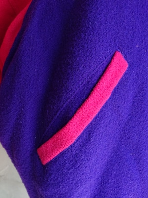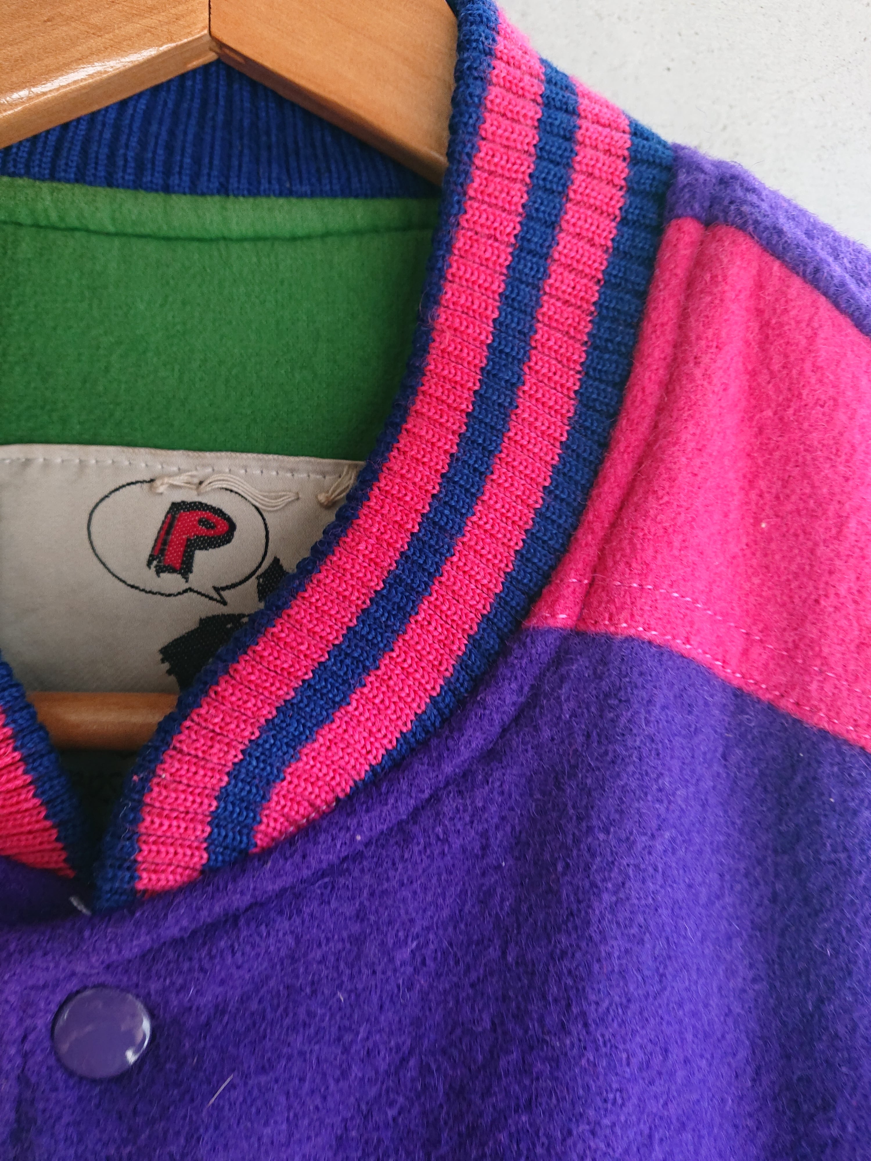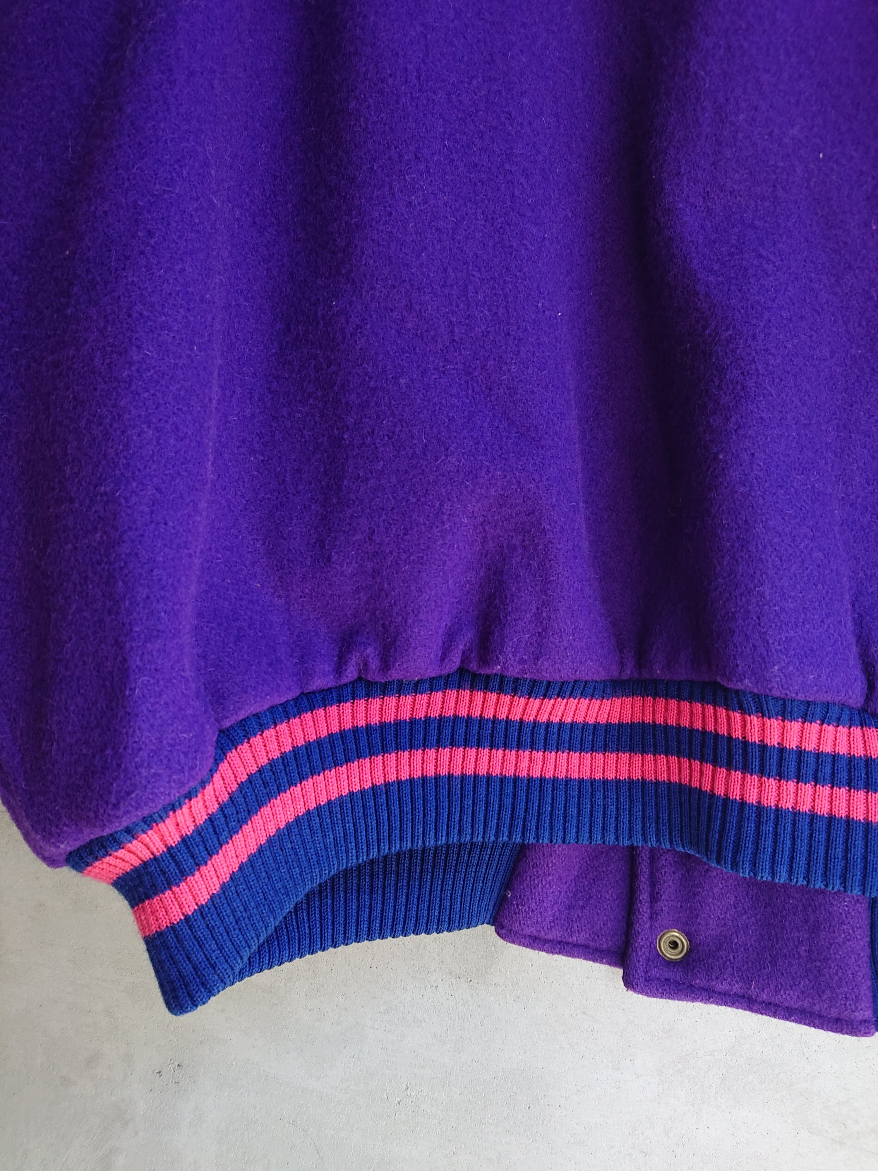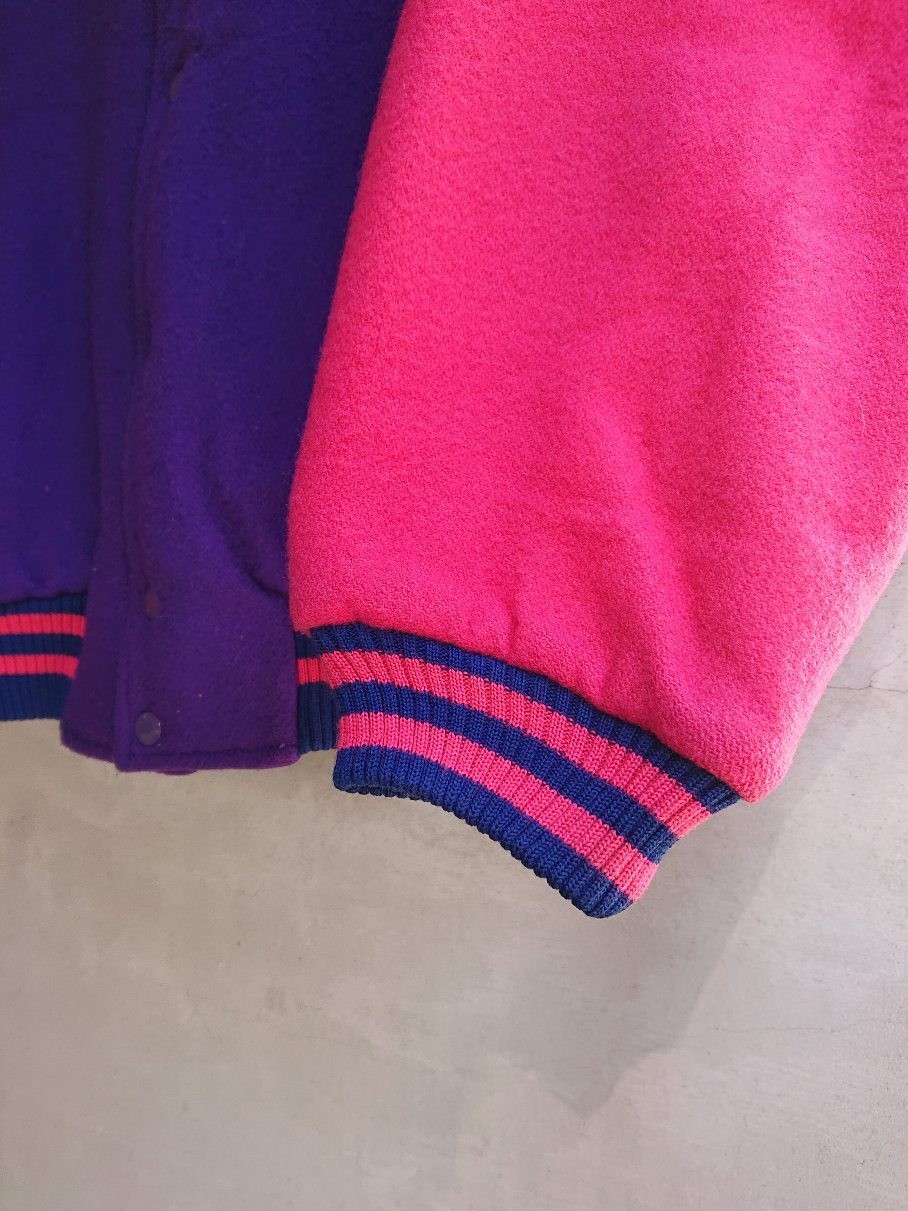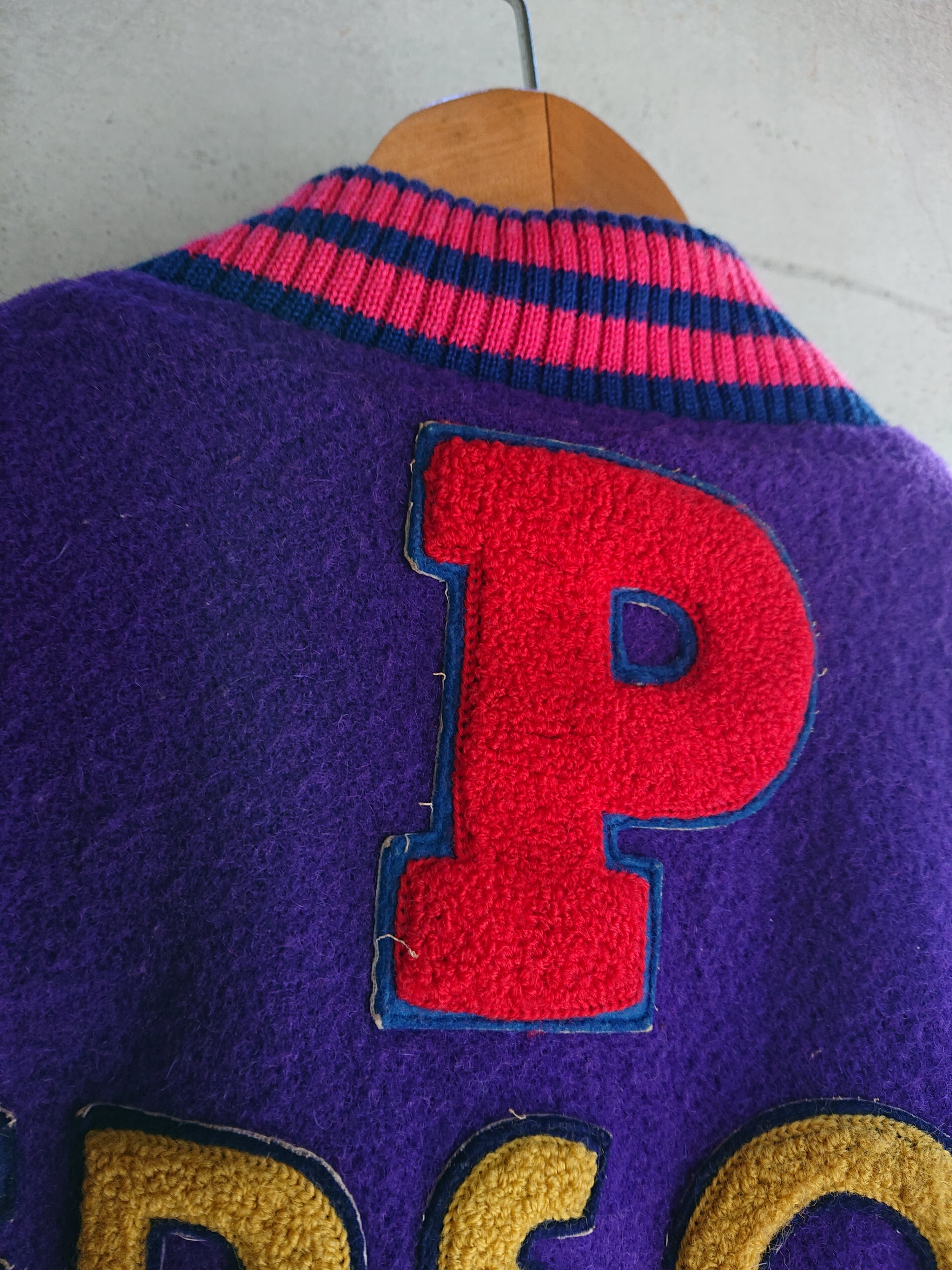PERSONS。スタジャンスタイルで色鮮やかな配色、ボリュームあるサイズ感等、年代を表すデザイン。中綿入りで保温性もあります。表地はWOOL90% NYLON10%。裏地はCOTTON100%。着用感ありますが、致命的な傷、汚れ等ありません。