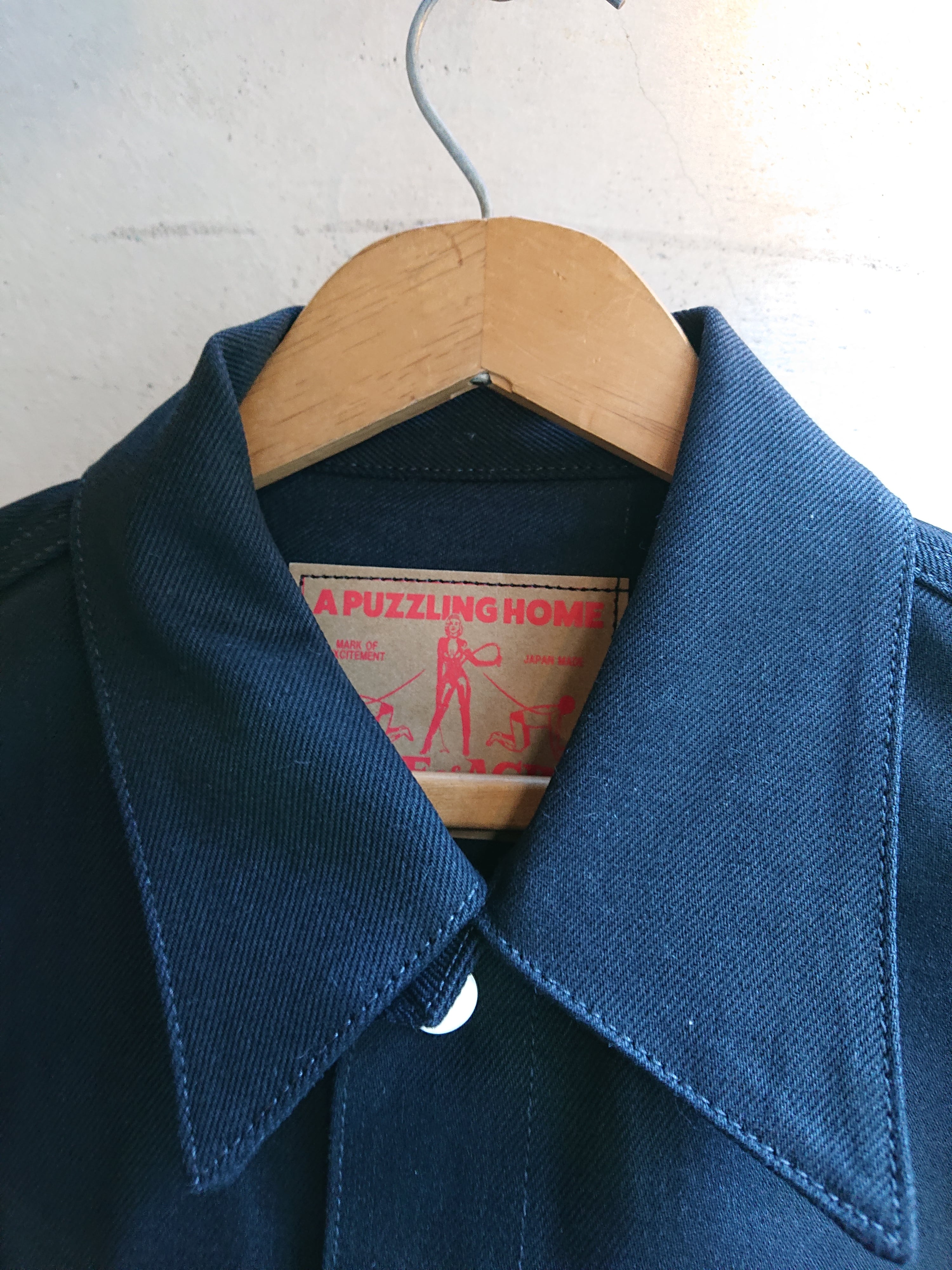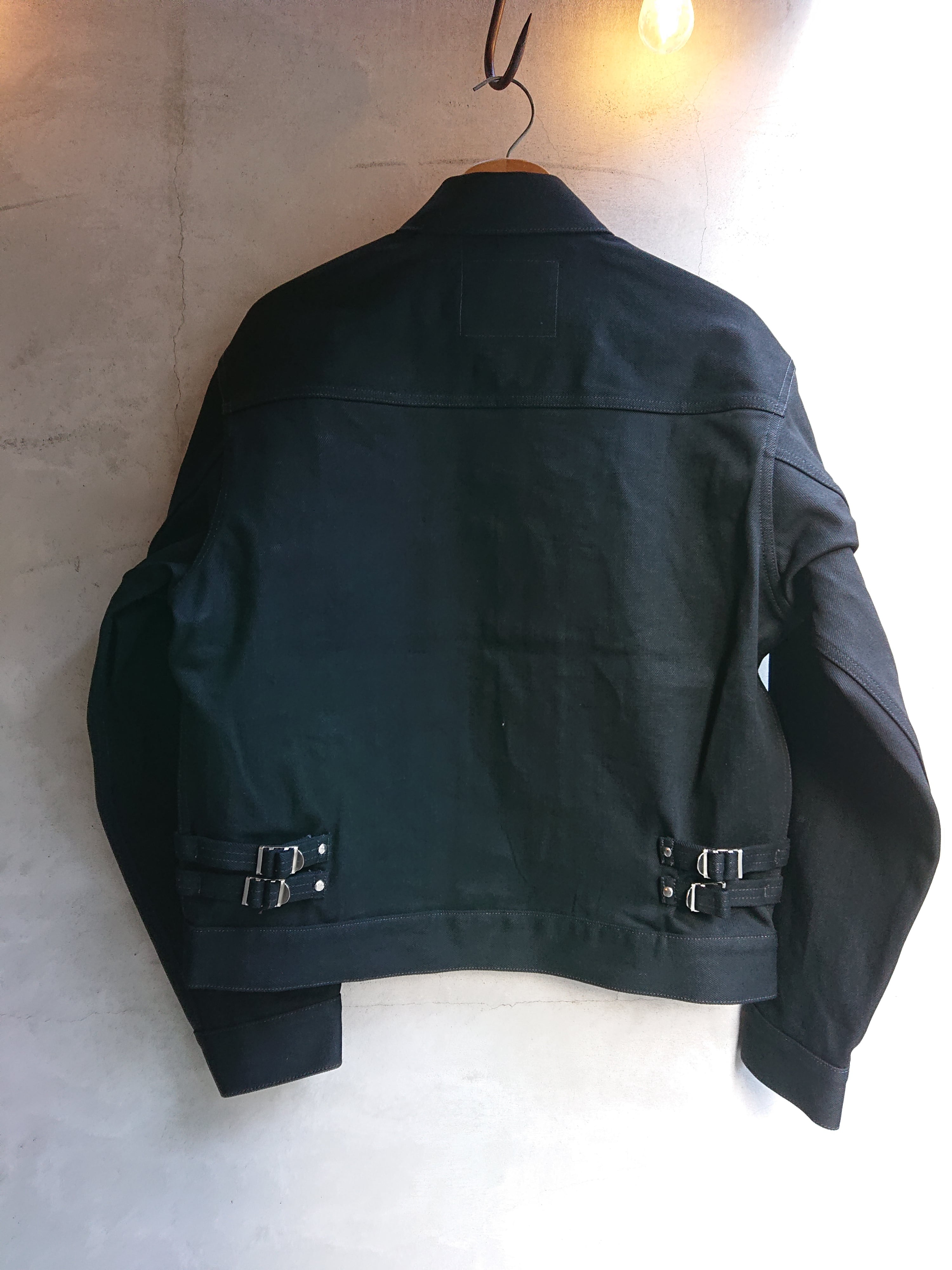 ジャケットのディティールですが、リーバイス等の王道ブランドではない、JcPENNY 等のストア系と呼ばれるスタイルのジャケットをモチーフに作成したディティール下側が小さく爪式の砂プボタンや、スクエア型のフラップがそのスタイルです。 また、背中のアジャスターは通常1本ずつですが、太いサイズにし 2連にすることで重厚感を持たせました