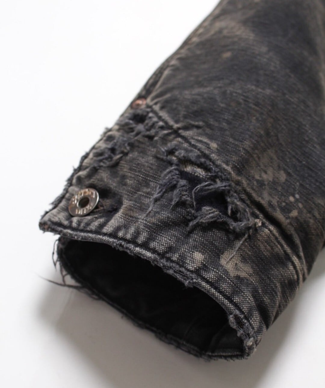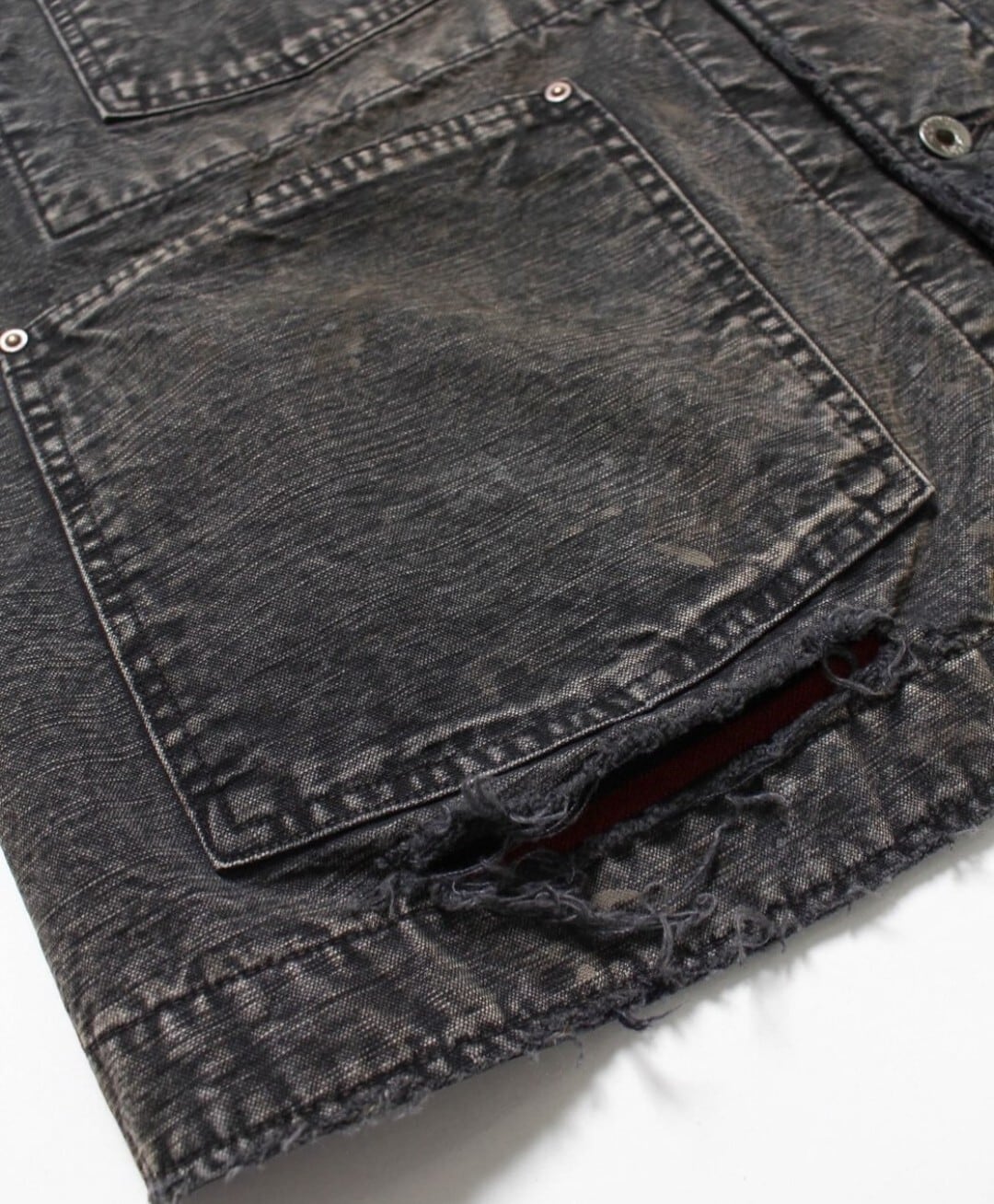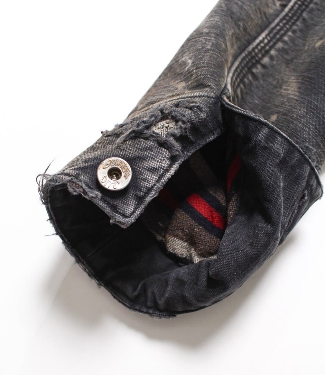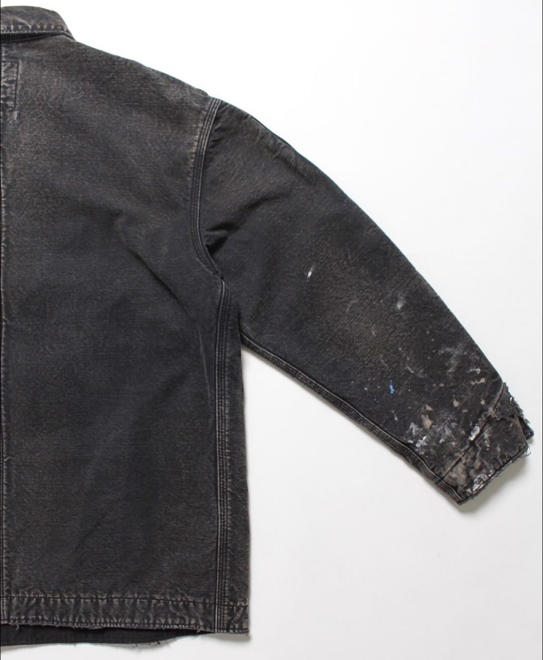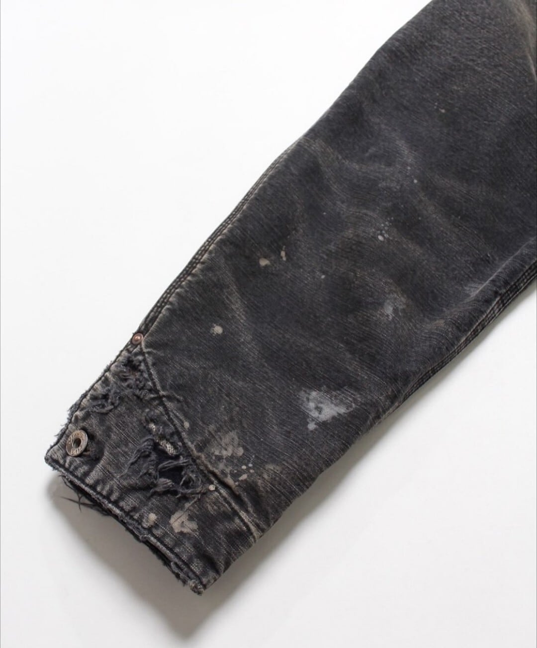本作は、当時の空気感と完成されたワークウェアのクオリティを現代に落とし込んだ一着。身頃にはへビーオンスのダック地を、裏地には温もりのブランケットを配し、日々の作業で知らぬ間に付いたペンキ跡や擦れ、味わい深い破れを加工で再現した。