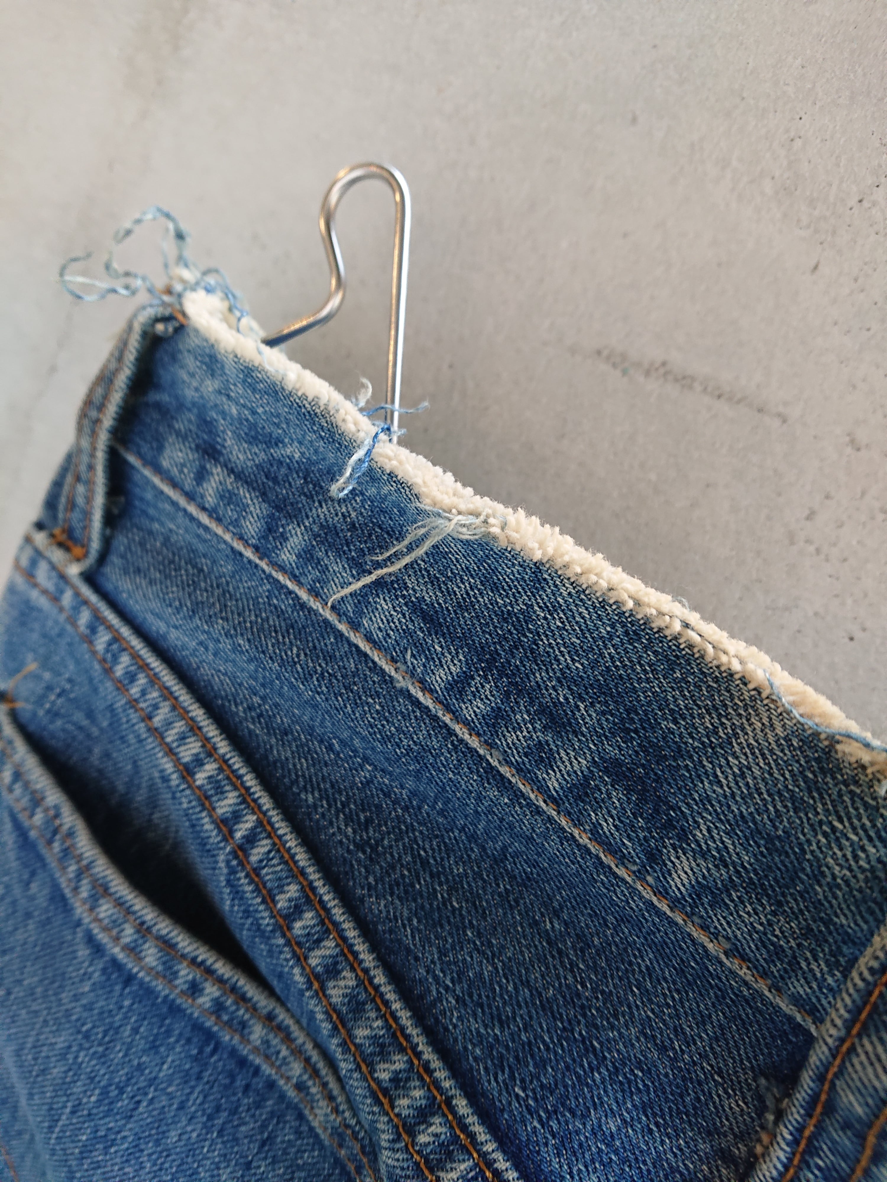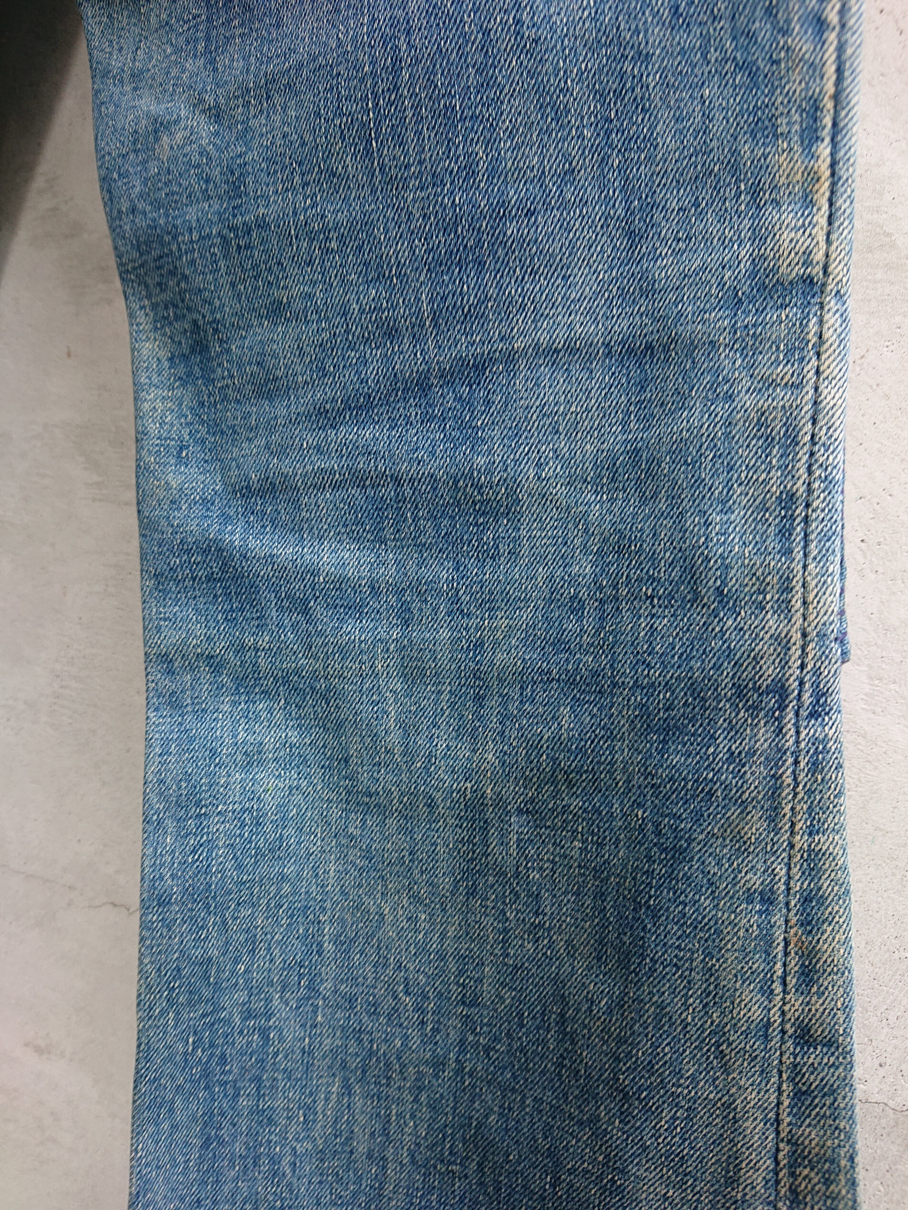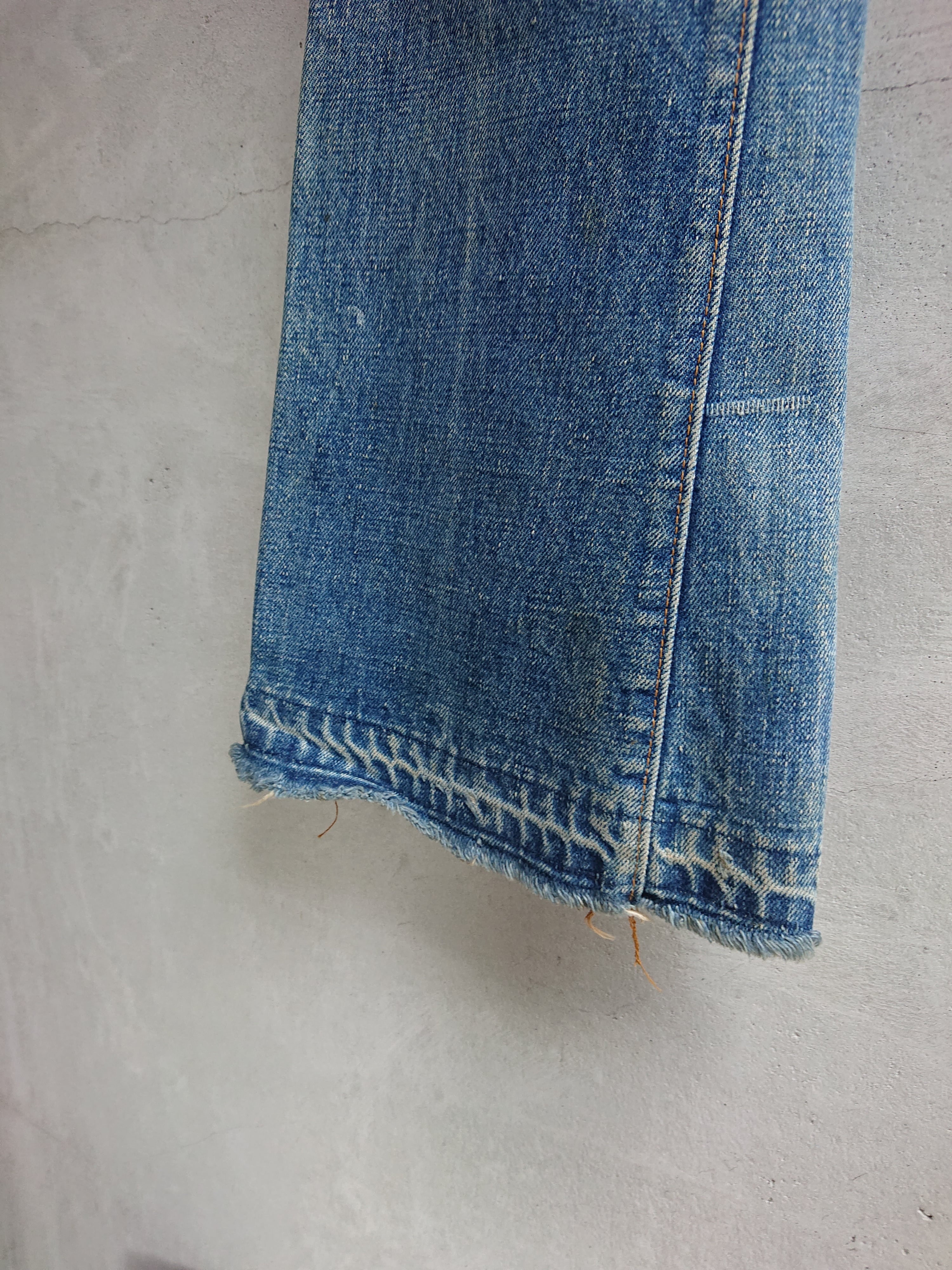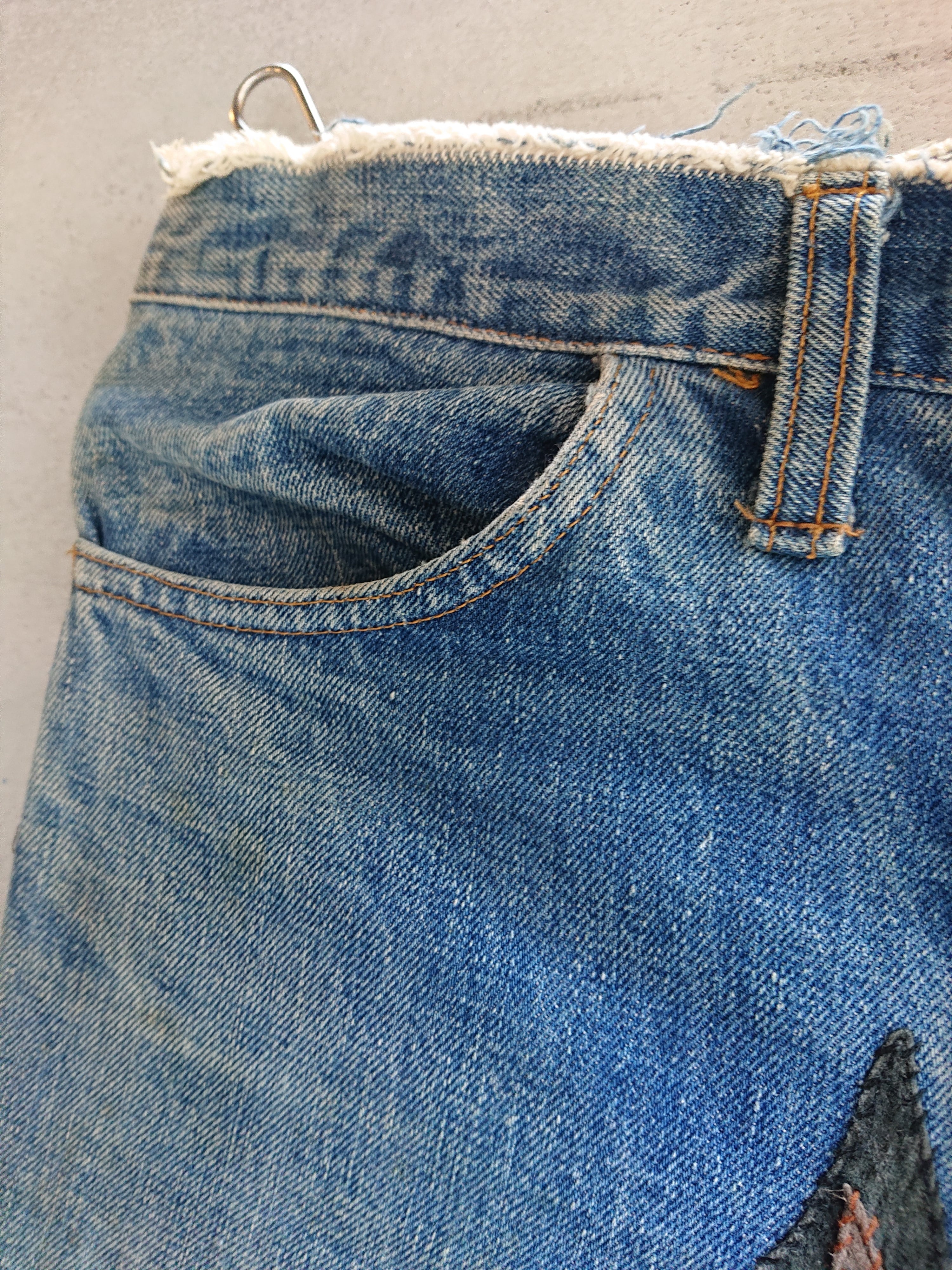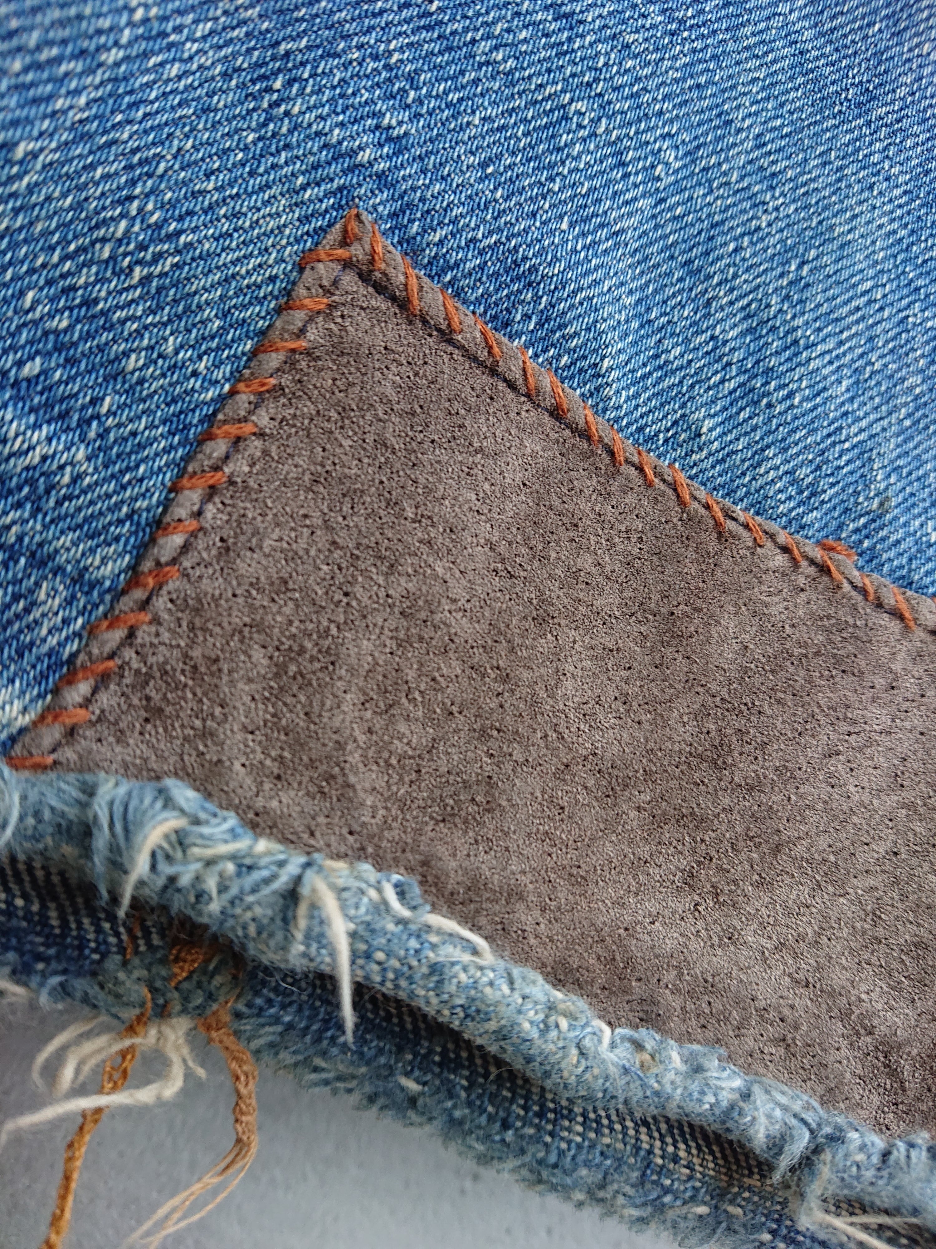 Ron Harman Vintageのリメイクデニムパンツ。70年代のヴィンテージ リーバイス 646のビッグEに所々レザーやデニム等のヴィンテージ生地を使いパッチワーク調にカスタム。タグにはカラーストーンのスタッズが付き、何より646ビッグEを使用するなど贅沢なパンツ。今展開されてるRon Harman Vintageよりも古い時に製作されたものなります。70s アイテムがジワジワ帰ってきてる今間違いなくオススメしたい一本です!