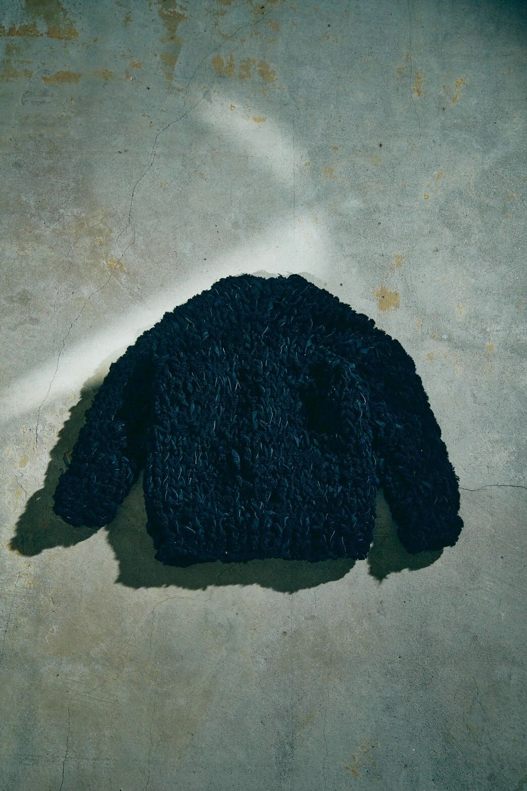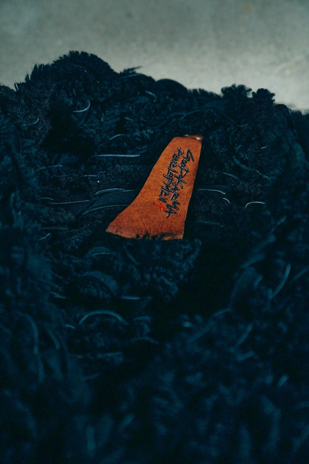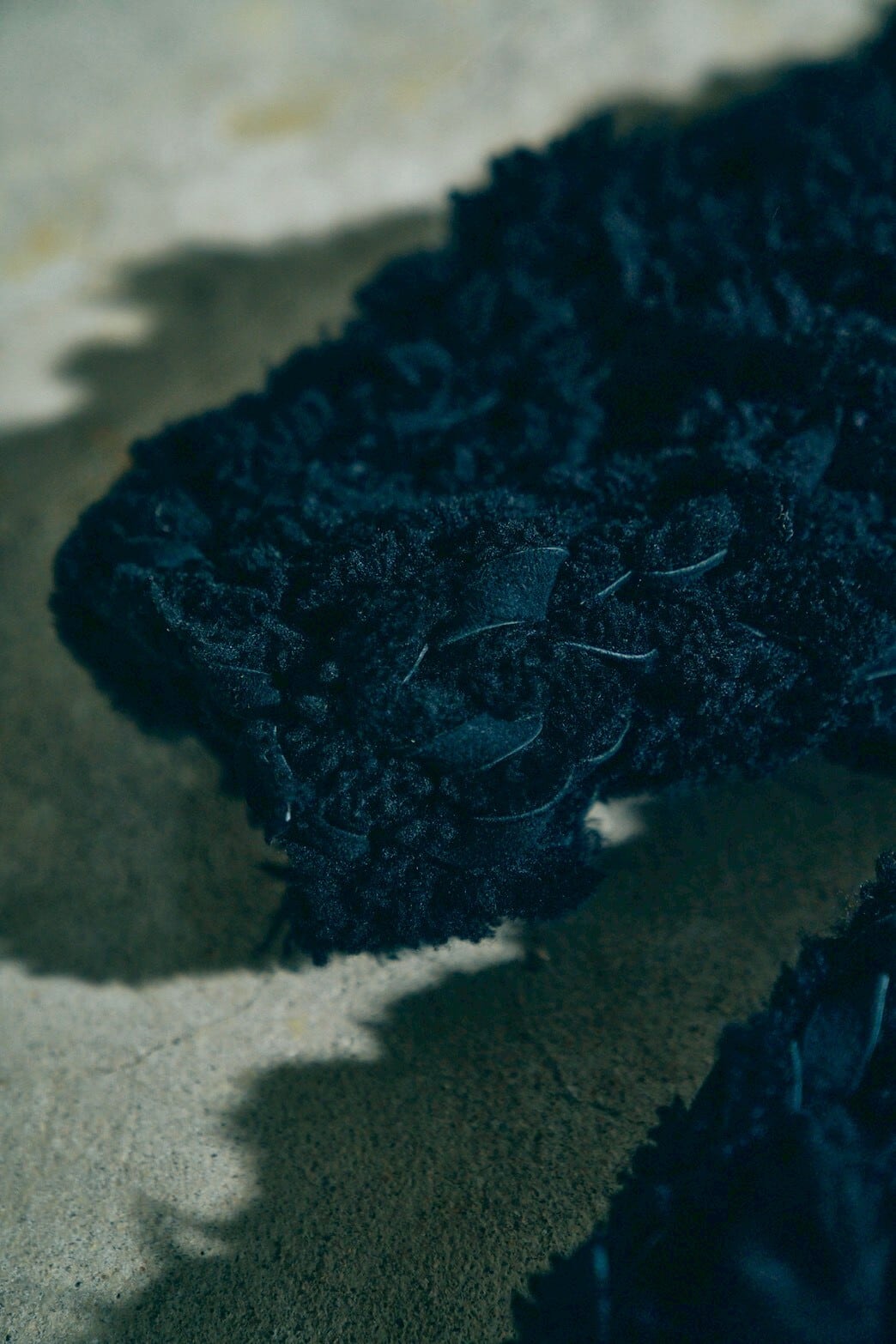 表面(毛の面)と皮面(スウェード面)がランダム且つ、ざっくりと編み込まれた独特の表情がおもしろい、どれも全く同じ物が存在しない完全なる一点物になります。