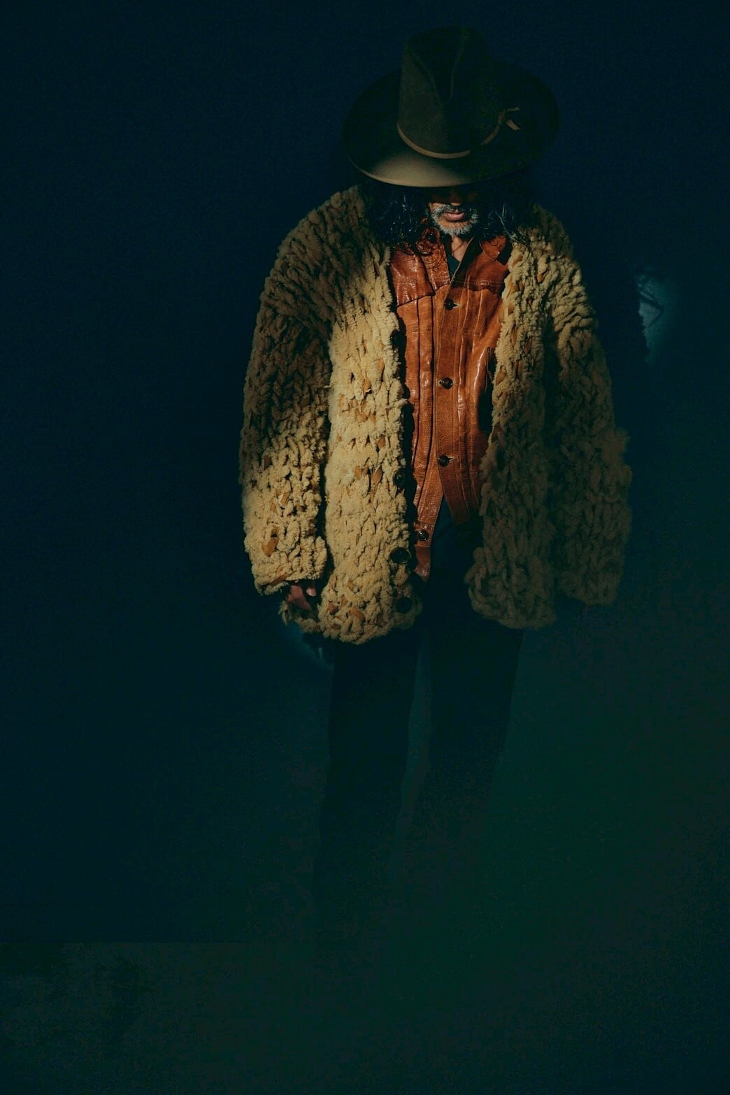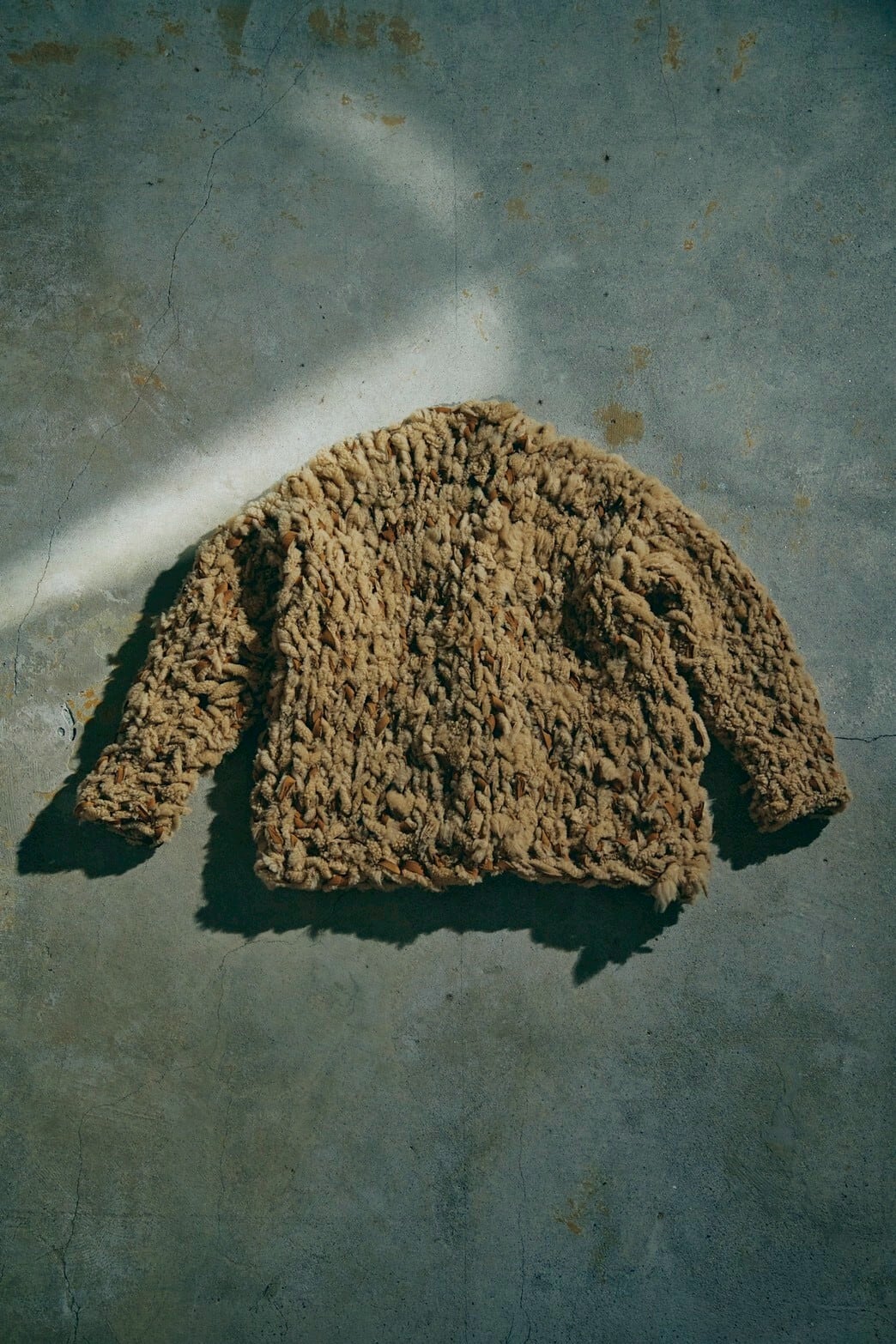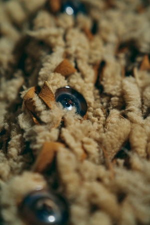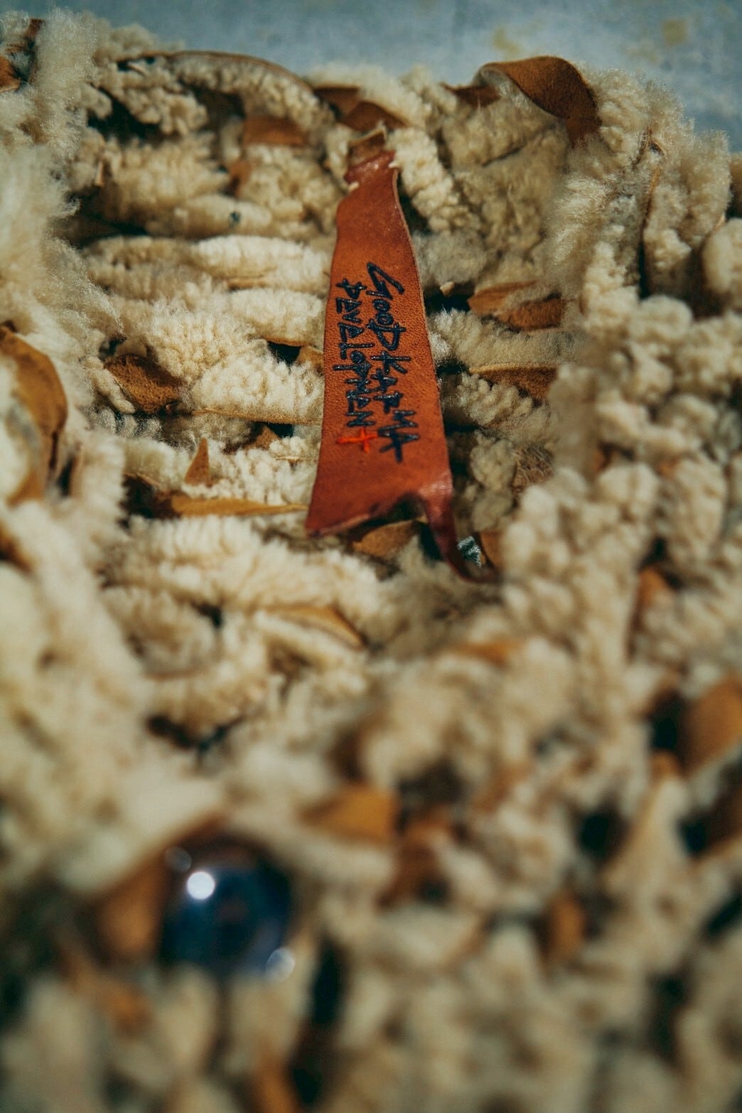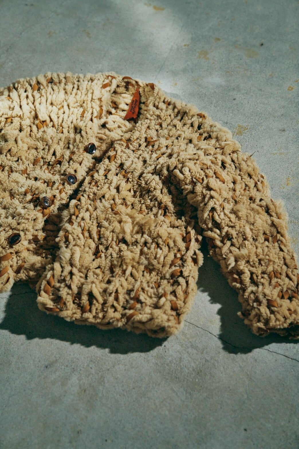 表面(毛の面)と皮面(スウェード面)がランダム且つ、ざっくりと編み込まれた独特の表情がおもしろい、どれも全く同じ物が存在しない完全なる一点物になります。