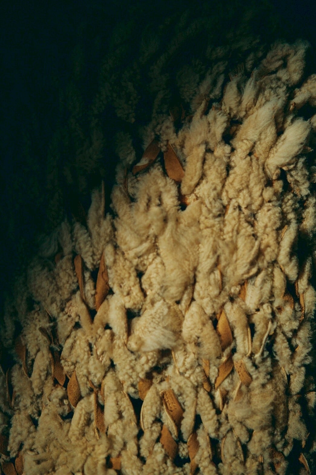 ムートンを細く裁断し、繋ぎ合わせ一本の糸にし、熟練の職人さんに手編みで一点一点丁寧に仕上げて頂きました(端切れだけでは限界がありますので、ほとんどが原皮を裁断して製作しております)。