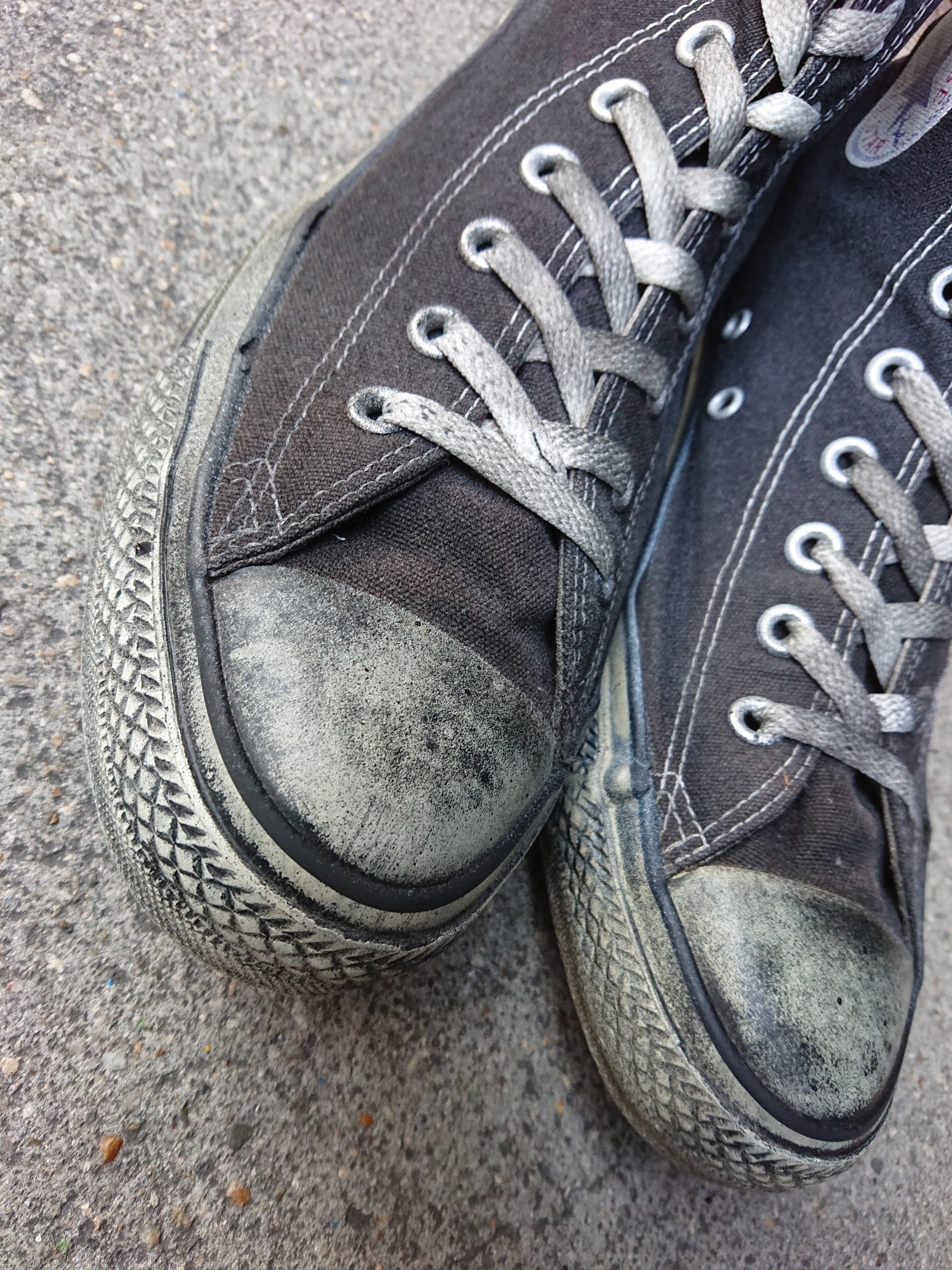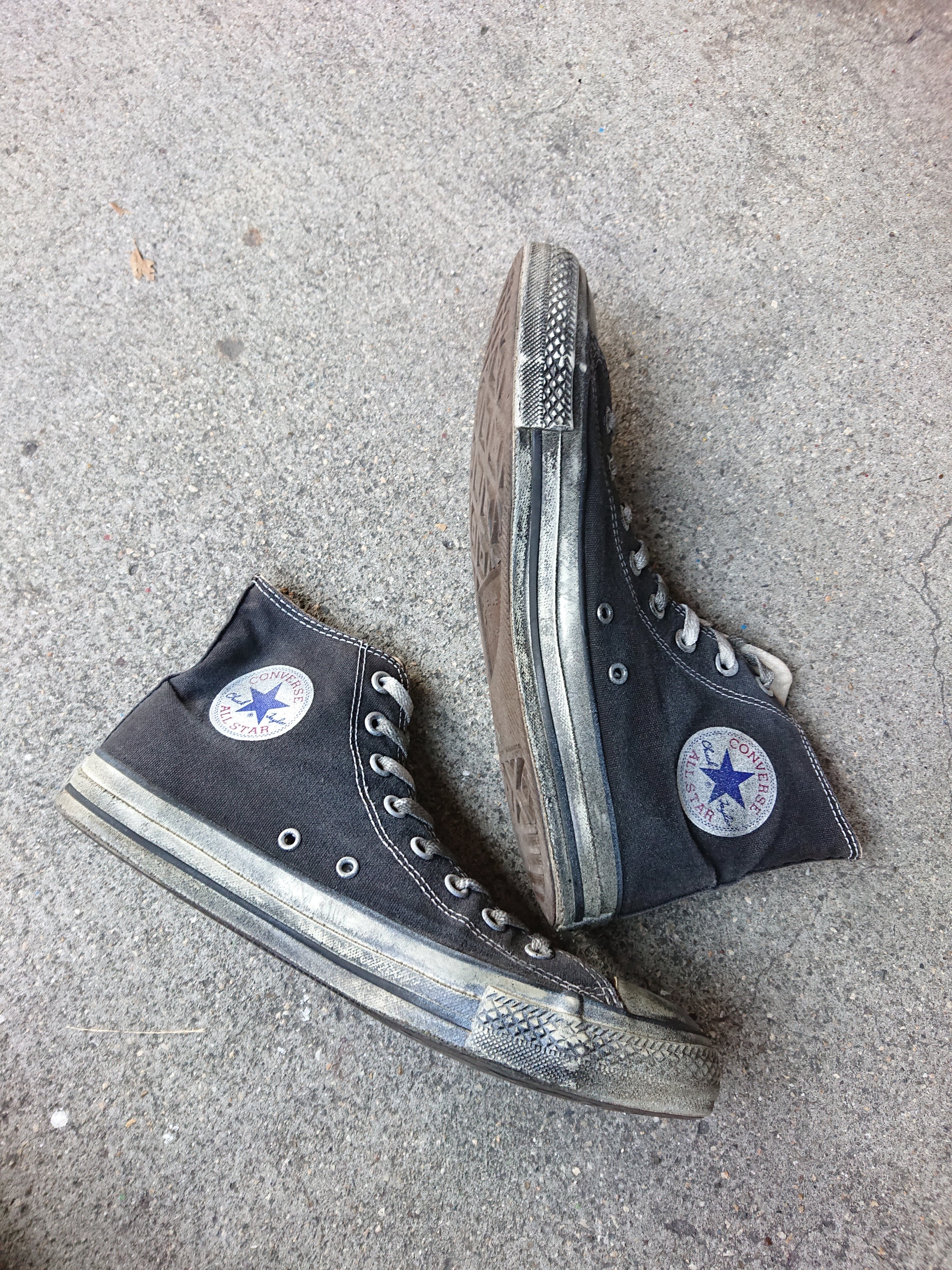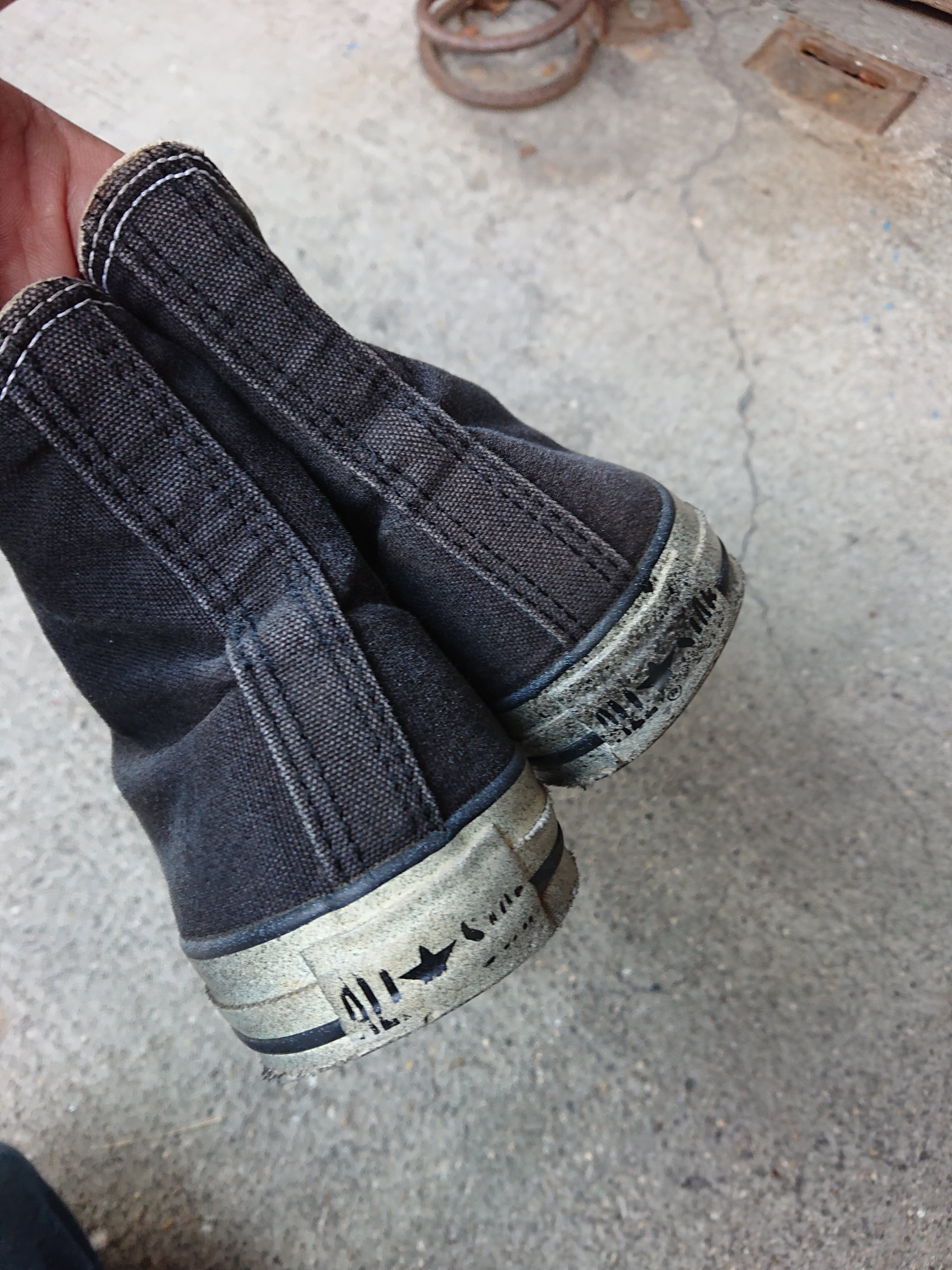 手作業でエイジング加工されたCONVERSE ALLSTAR。通常のブラックのオールスターとは一味違う雰囲気。着用されており、使用感はありますがソールの減りもまだ少なくガンガン履いていただける一足です。インドネシア製。