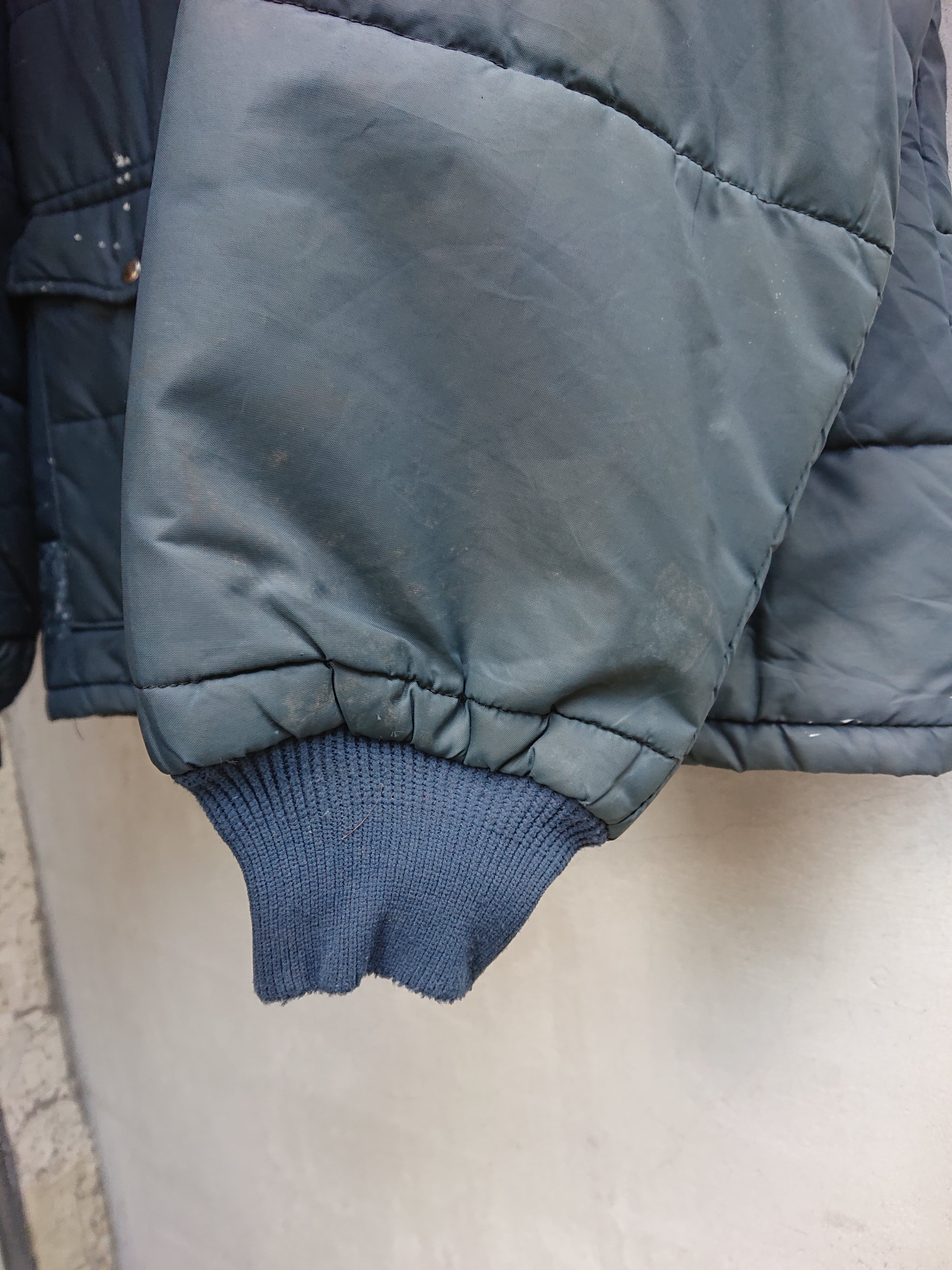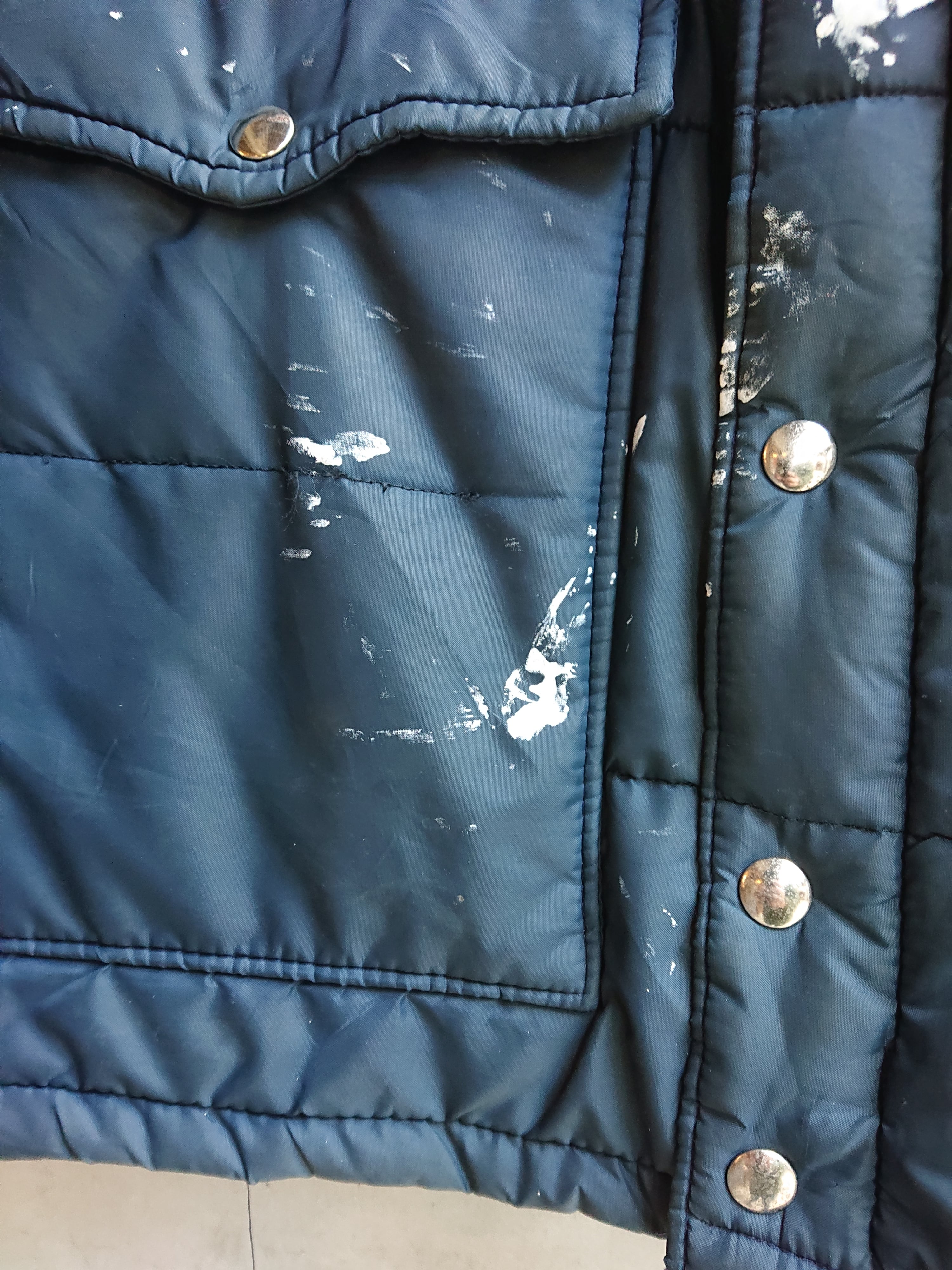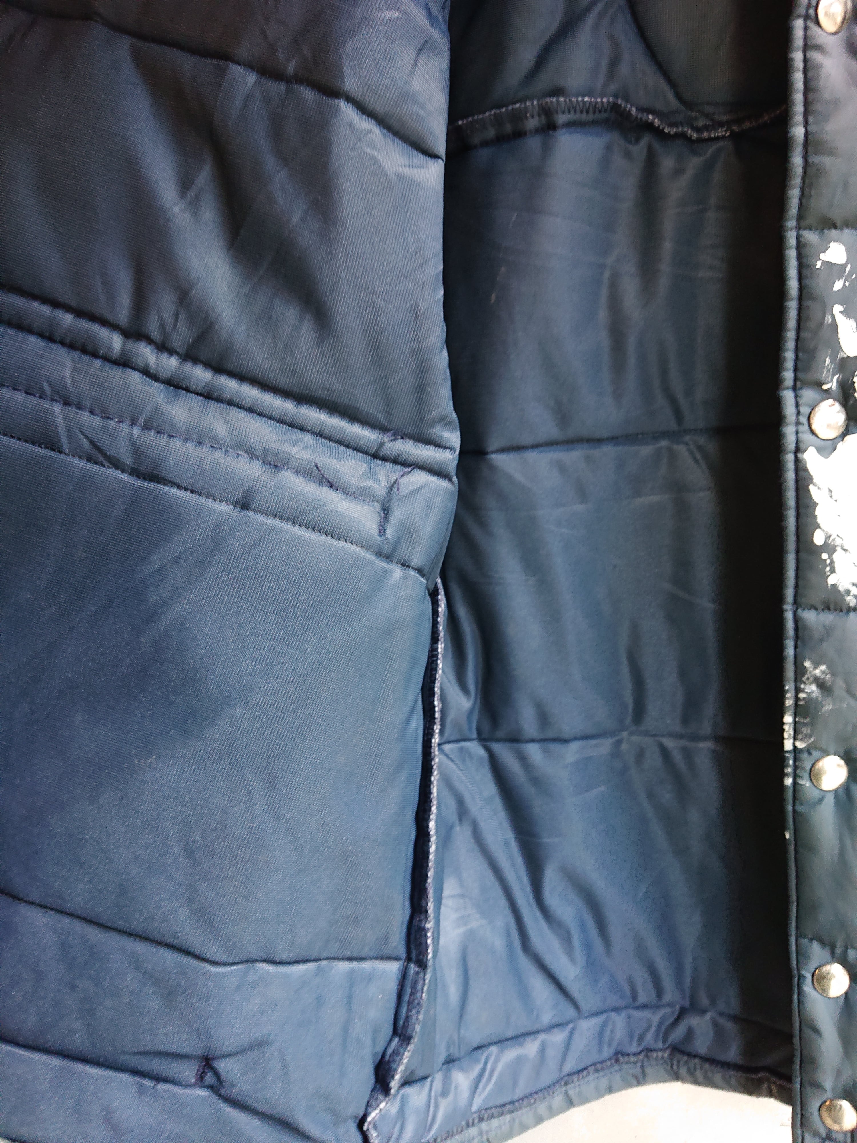 1980年代 GLOBAL MARINE DRILLING COMPANY(グローバル・マリン・ドリリング・カンパニー)の中綿入りナイロンジャケットになります。社名ロゴが描かれたワッペンが左胸と背中につきます。1953年に設立された世界最大級のオフショア掘削会社で、石油・ガス掘削、原油や天然ガスの生産などおこなってた会社で紹介するこちらは従業員が作業着として使用してたものかと。ボディはSWING STARでカラーはネイビー。所々ペンキが飛んだ雰囲気ある一着。右胸辺りに2cmほどの傷がありますが着用に問題はありません。