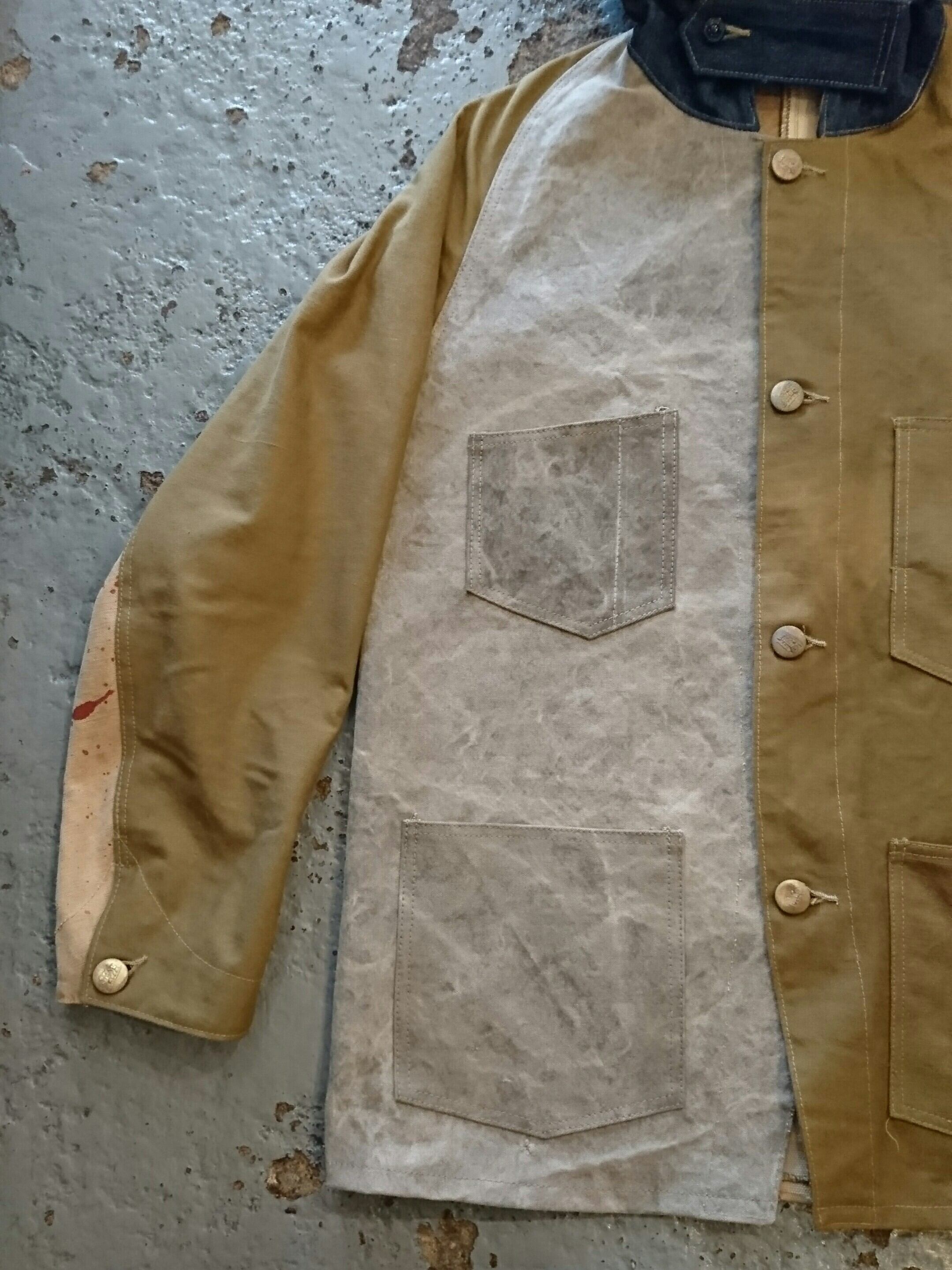 レアモデルのフード付きカバーオールを味わい深いヴィンテージファブリックを使用して再構築。ボディ部分はオールドのトラックタープ(幌)と1940年代 US ARMYテントを使用しフード部分は同じく1940年代 US NAVY ランドリーバッグで製作されたスペシャルバージョン。首もとのチンストラップ、フロントと袖口はチェンジボタン使用等拘りぬいた1着となっております。ヴィンテージファブリックを使用してる為、一点一点雰囲気が異なるのも魅力の1つです。