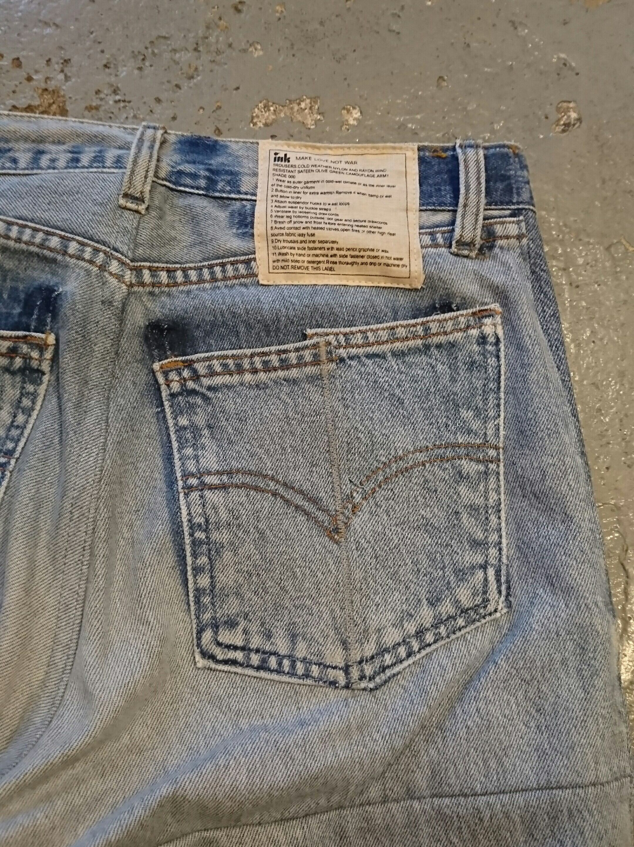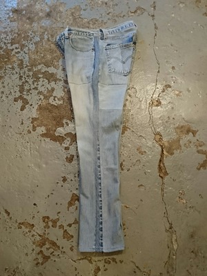 levis550を使い定番のCLASHに再構築。シルエットは変えずサイドにラインを施すこし、バックポケットはセンターで割りミシンにて組みあわせ。今までとテイストが変わったCLASHを楽しんで頂けると思います。シルエットはタイトストレートになります。ヴィンテージをリメイクしてる為、一点一点雰囲気が異なります。