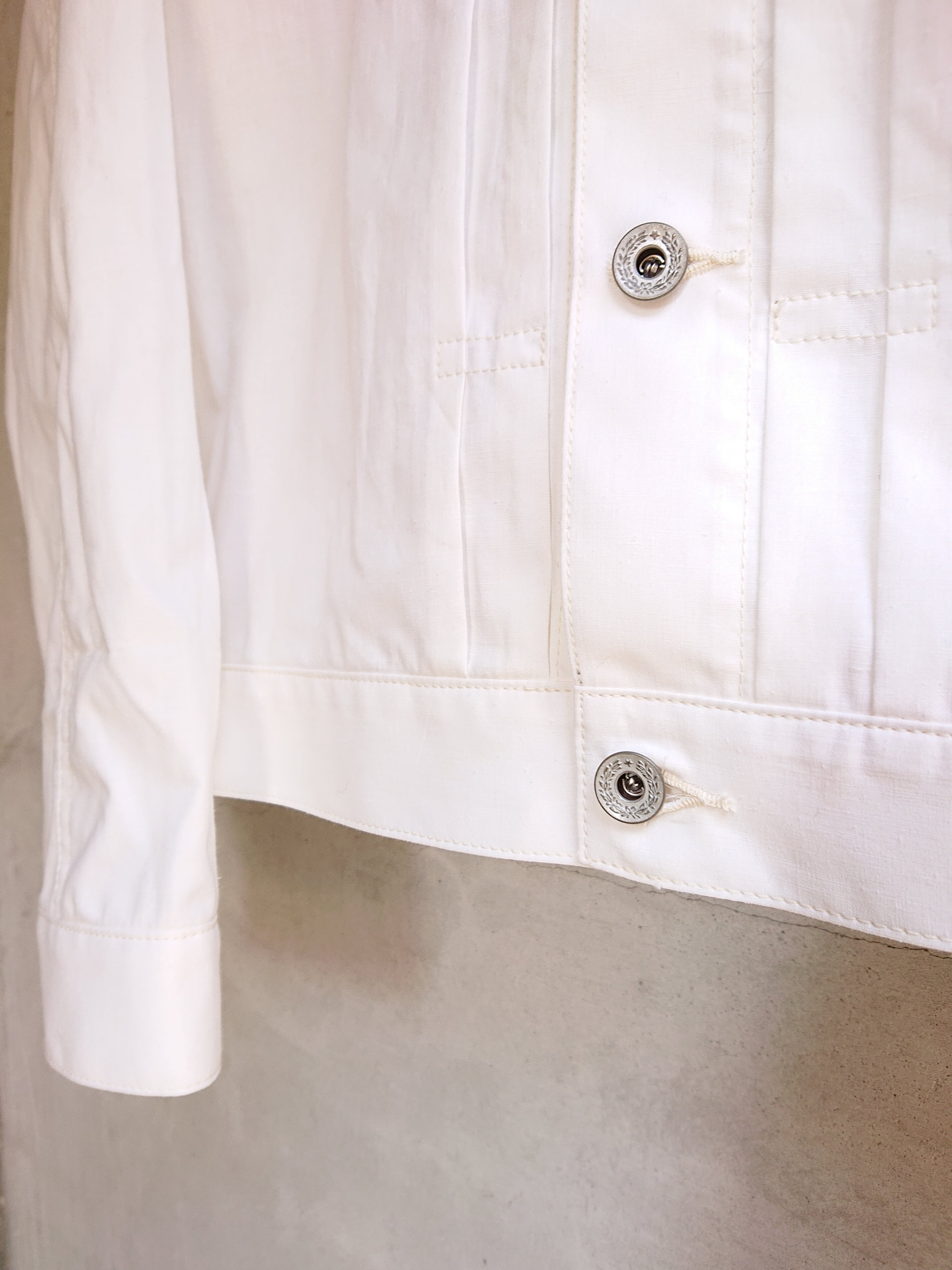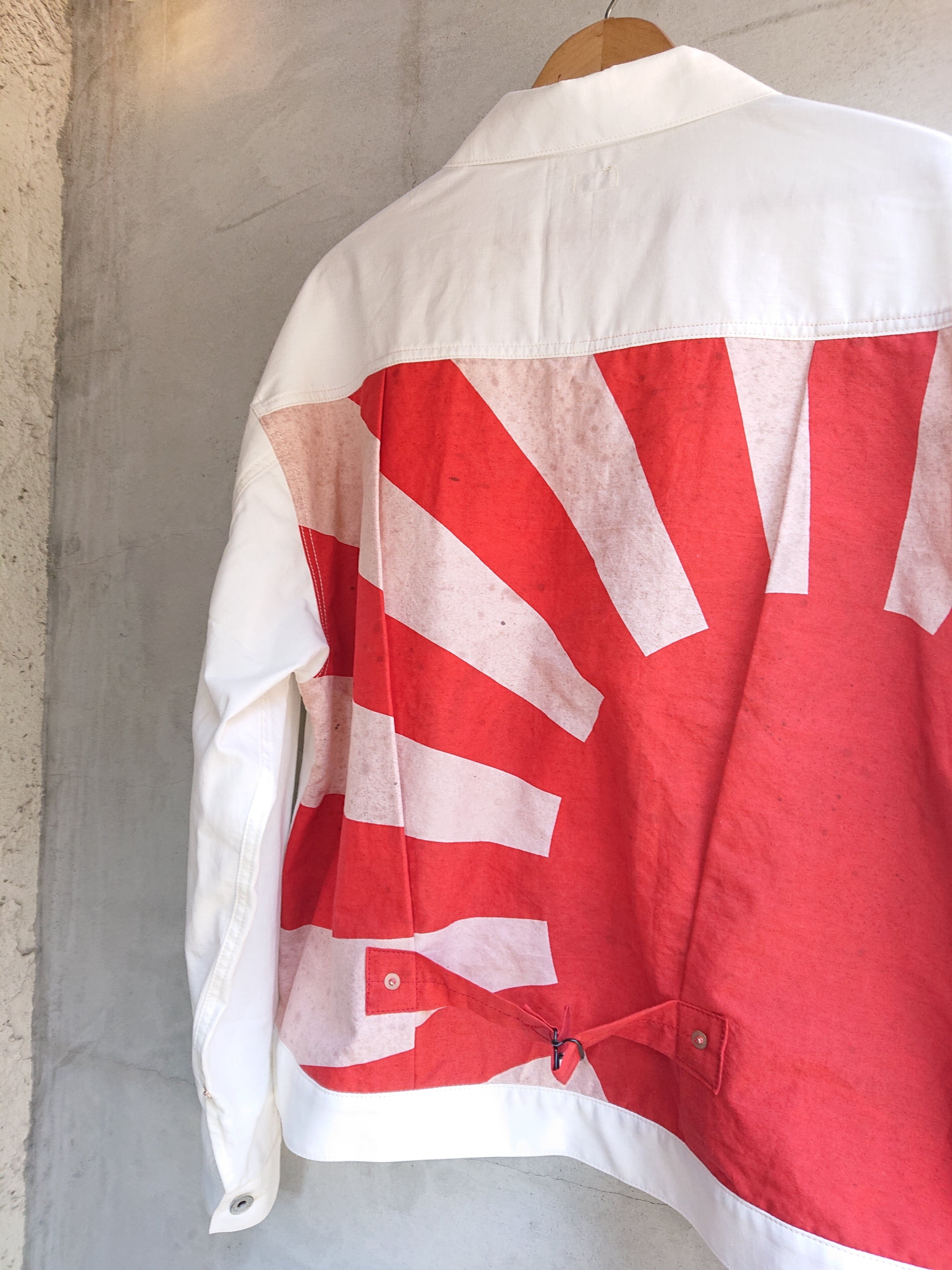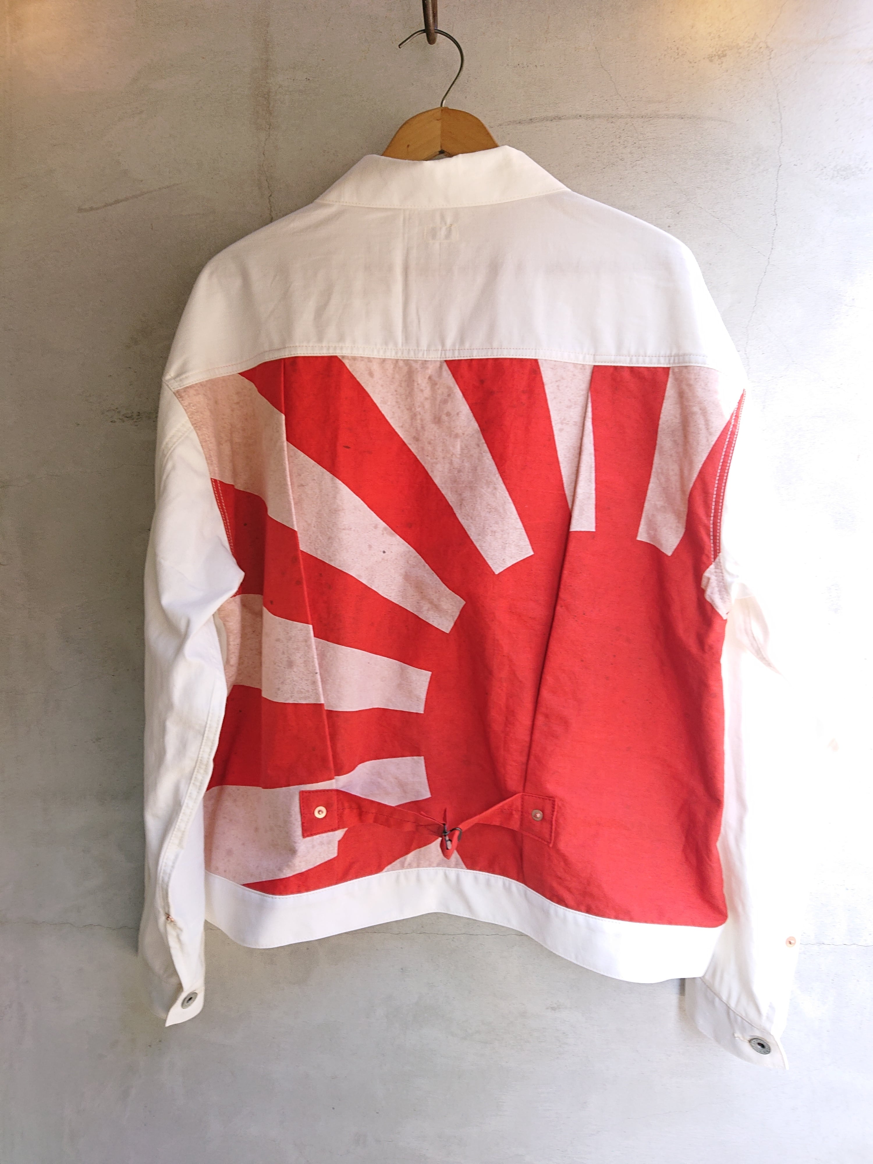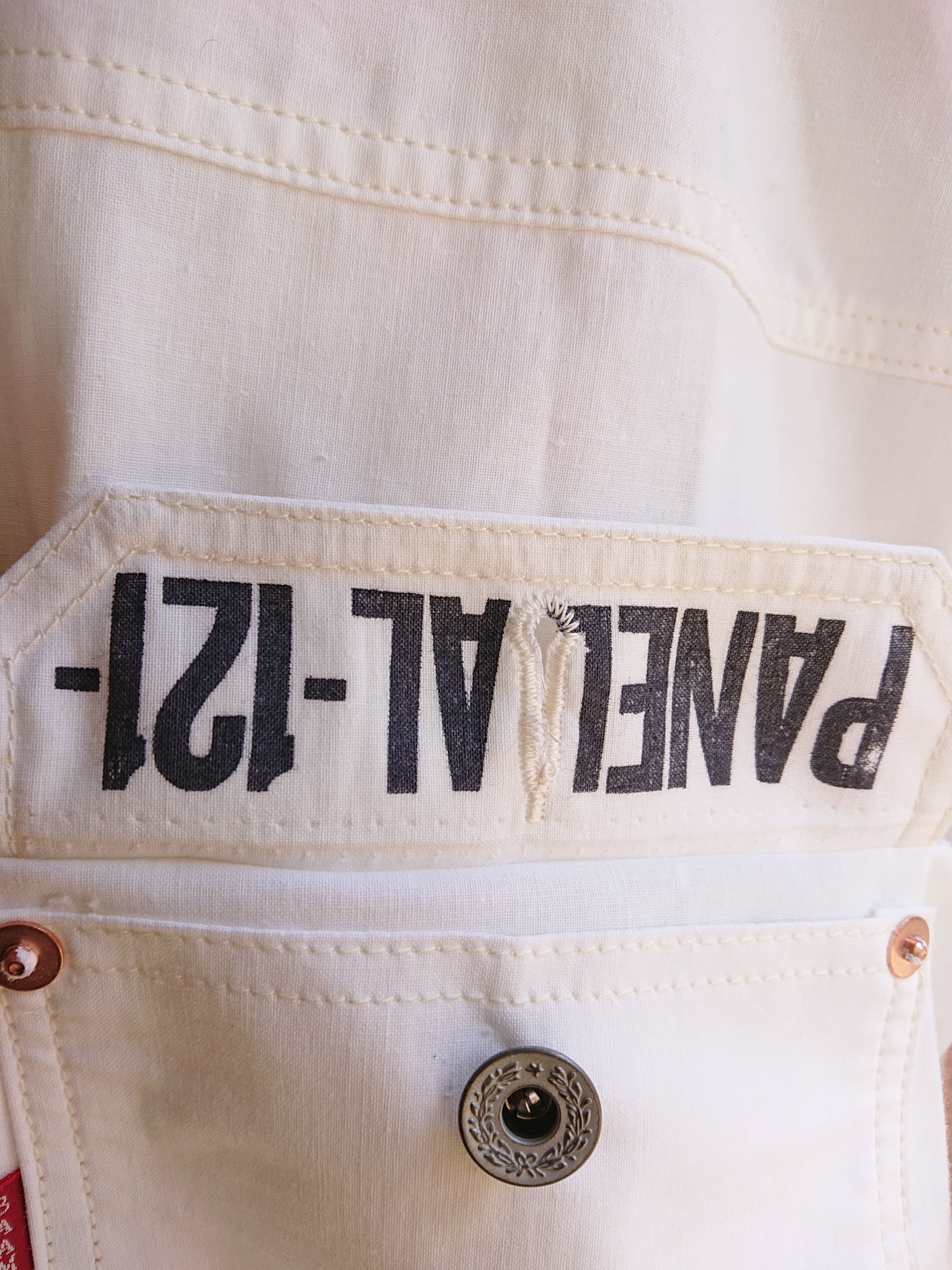 1960年代の米軍パネルマーカーシートをデッドストックを入手し、1stタイプのワイドシルエットの背中にアンティークナショナルフラッグをバックパーツに組み込んだ渾身の一作。 ステンシル部分の一部もフラップ裏や、カフスパーツ裏に使用は変わらず。昨今、この様な素材が纏まって入手出来る事は稀で、素晴らしい素材に巡り会える事も少なくなりました。ブランドタグはオールレーヨン糸で制作しものを使用し、ボタンは月桂樹ボタンに変更。