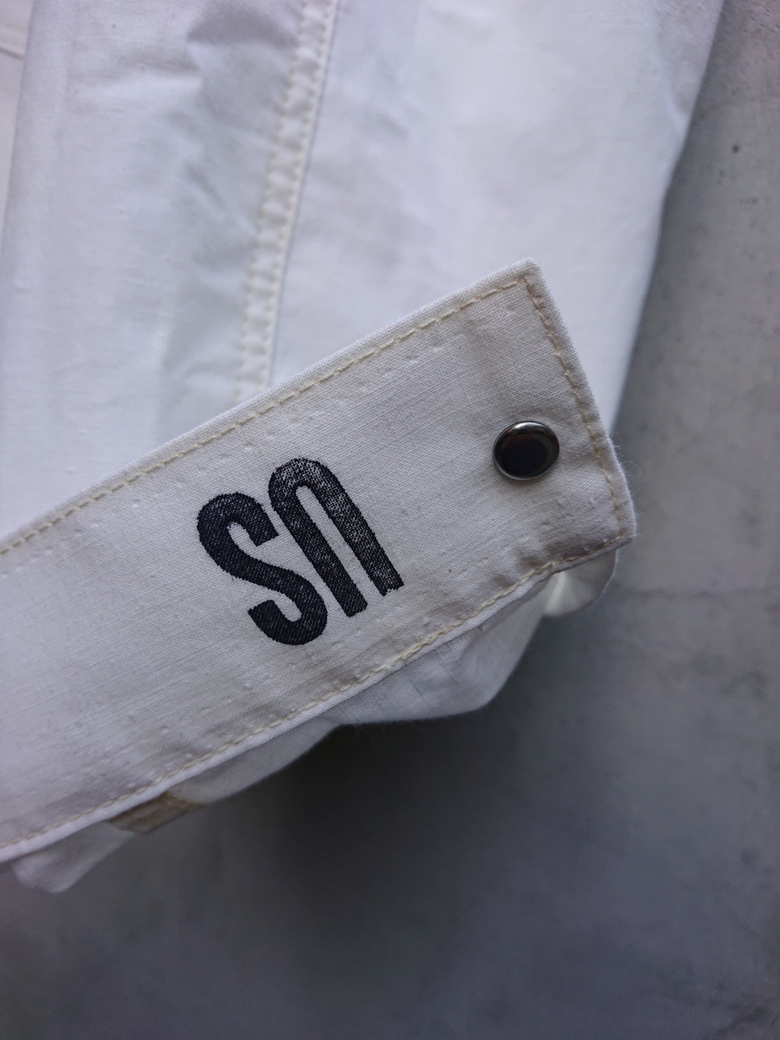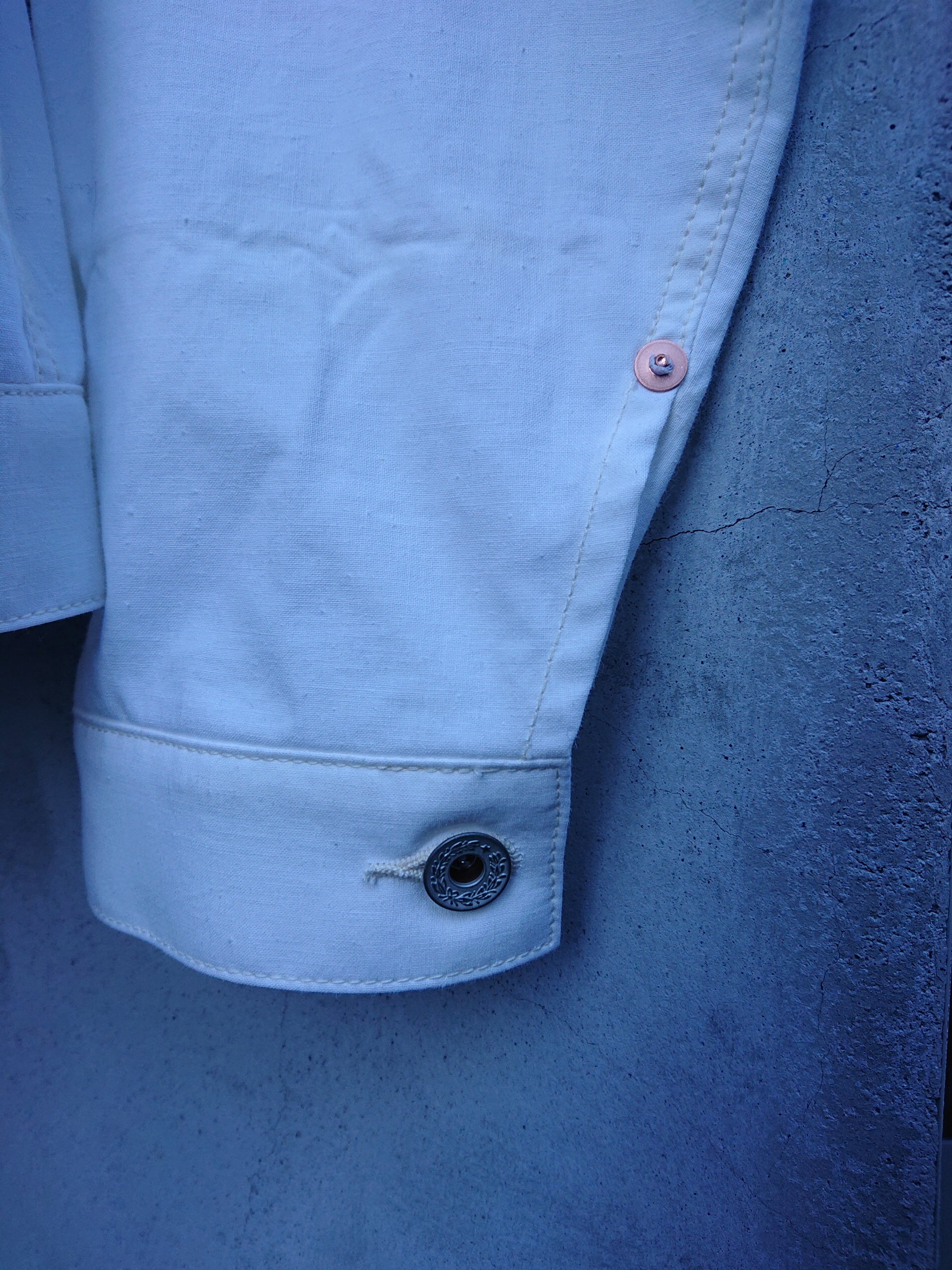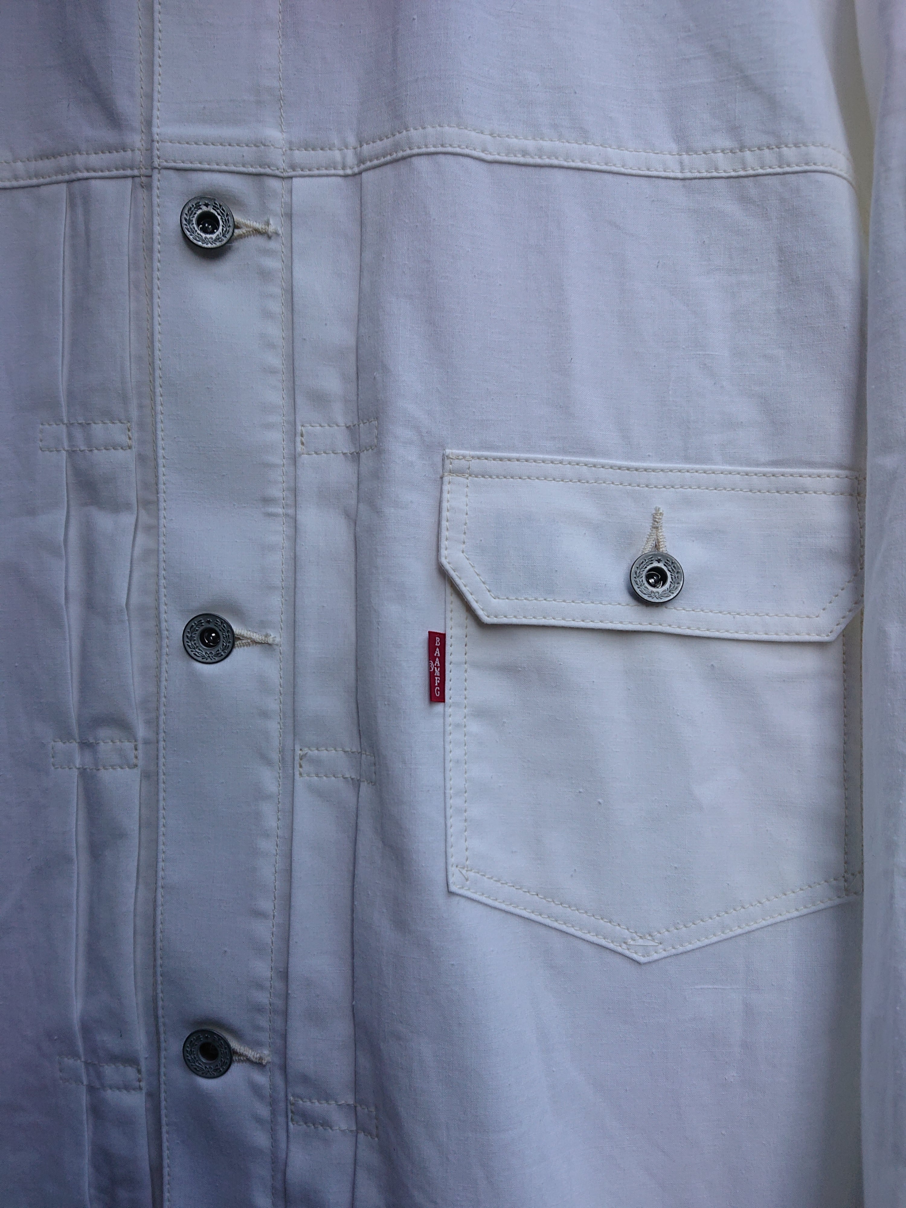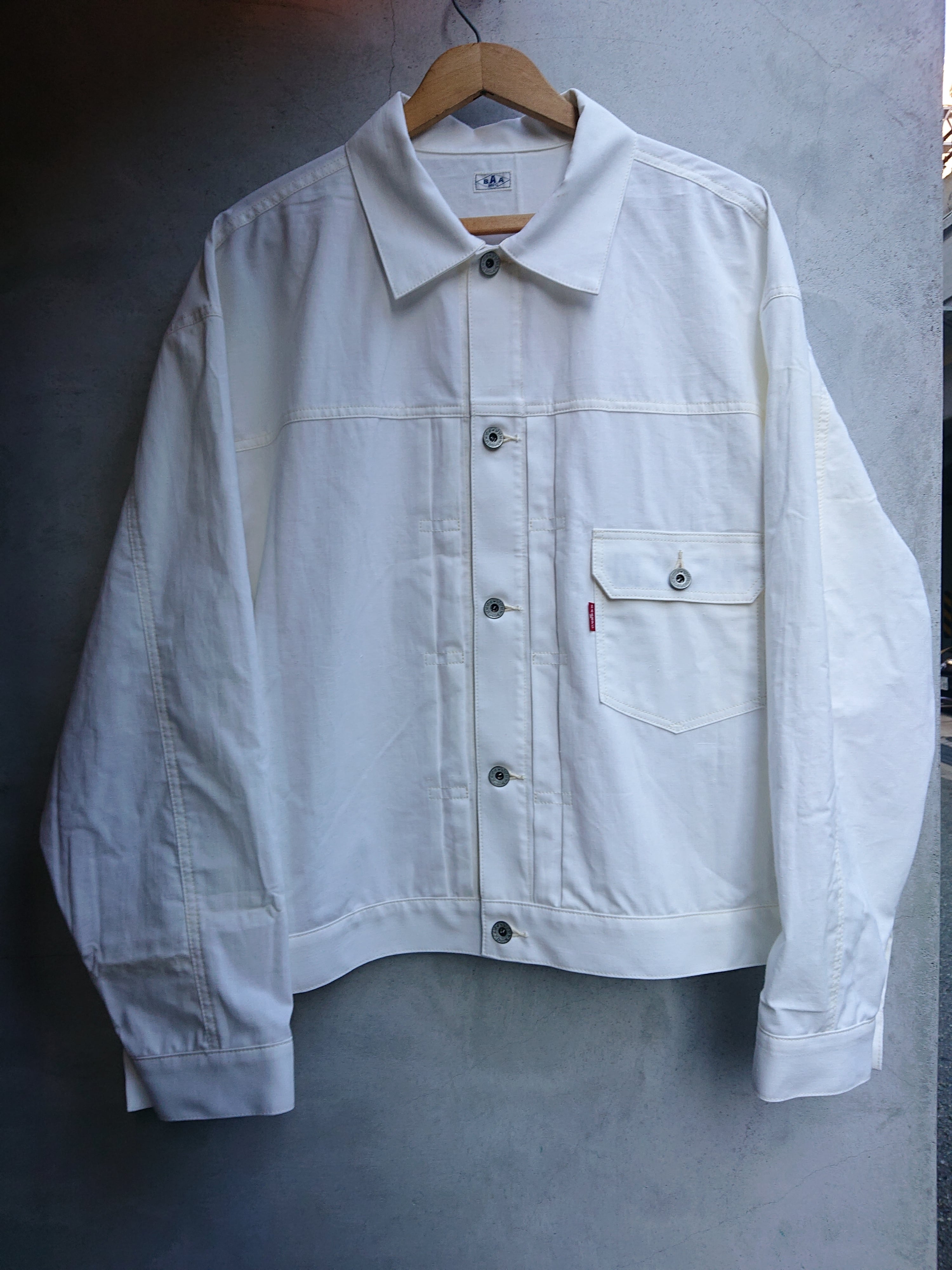 1960年代の米軍パネルマーカーシートをデッドストックを入手し、1stタイプのワイドシルエットの背中にアンティークナショナルフラッグをバックパーツに組み込んだ渾身の一作。 ステンシル部分の一部もフラップ裏や、カフスパーツ裏に使用は変わらず。昨今、この様な素材が纏まって入手出来る事は稀で、素晴らしい素材に巡り会える事も少なくなりました。ブランドタグはオールレーヨン糸で制作しものを使用し、ボタンは月桂樹ボタンに変更。
