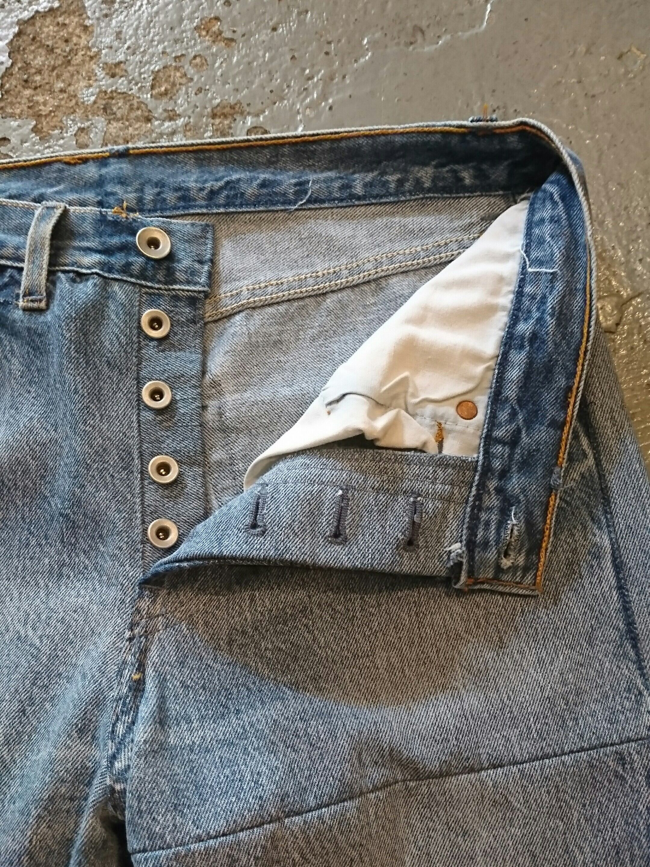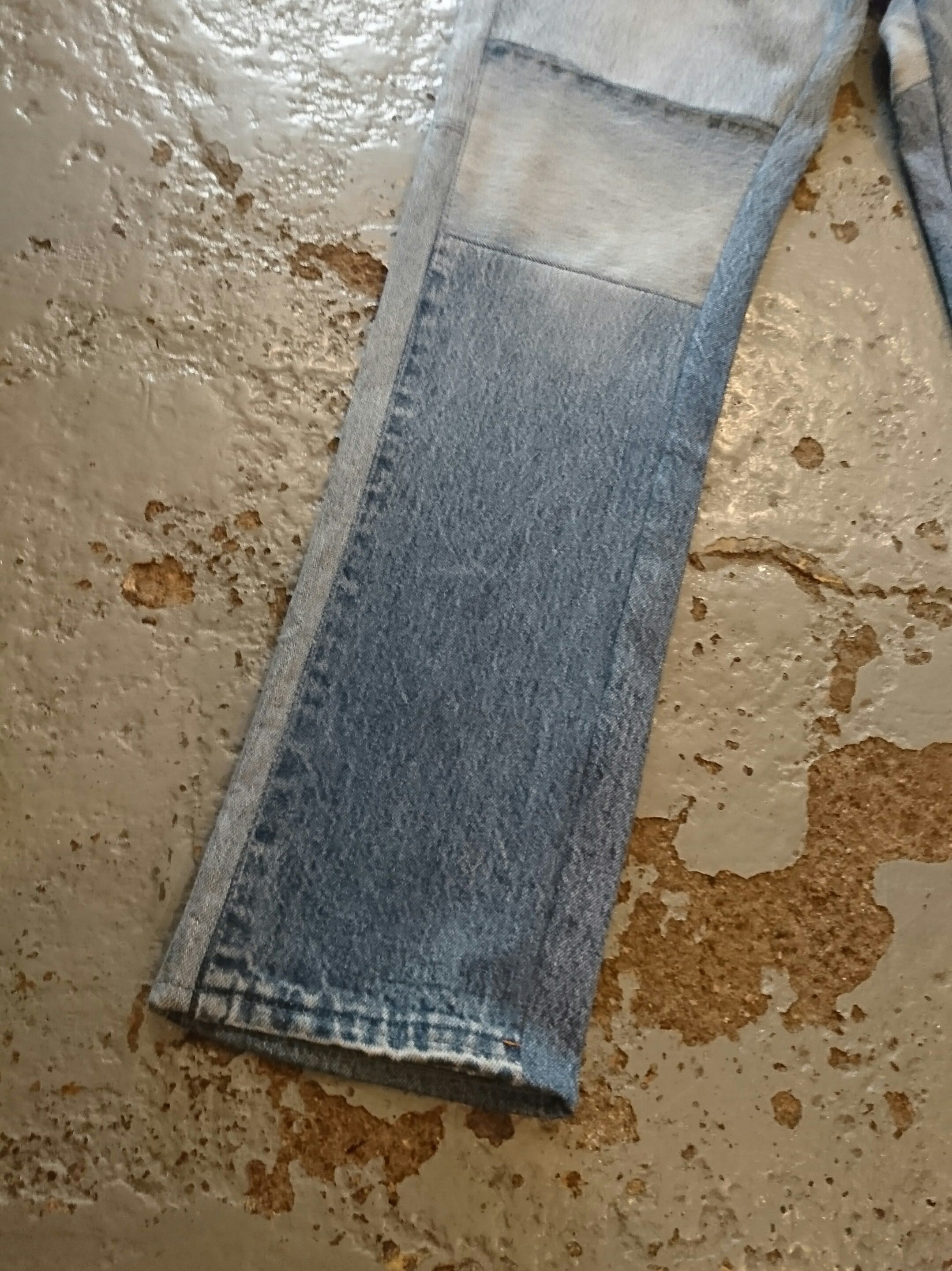 levis550を使い定番のCLASHに再構築。シルエットは変えずサイドにラインを施すこし、バックポケットはセンターで割りミシンにて組みあわせ。今までとテイストが変わったCLASHを楽しんで頂けると思います。シルエットはタイトストレートになります。ユーズドをリメイクしてる為、一点一点雰囲気が異なります。